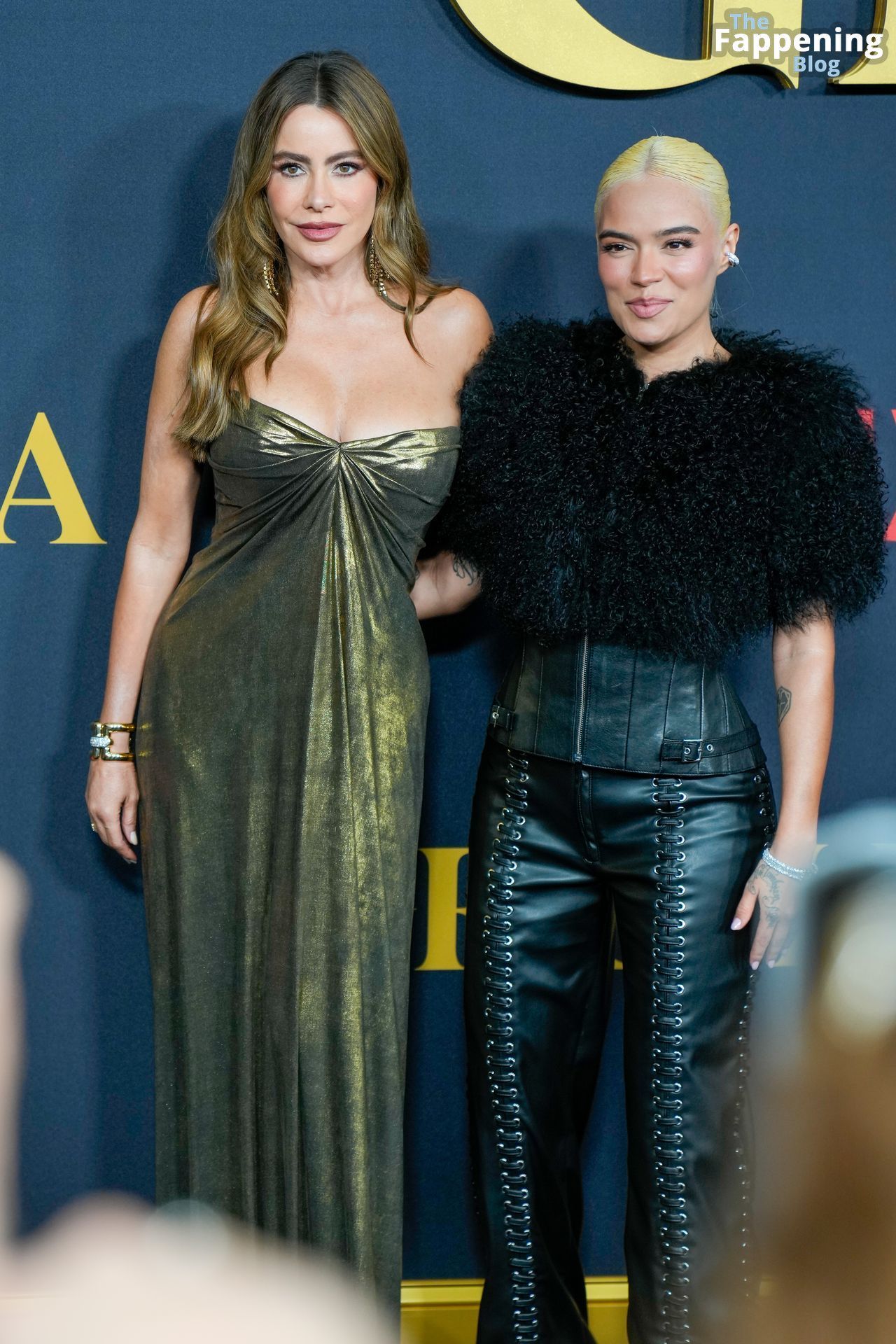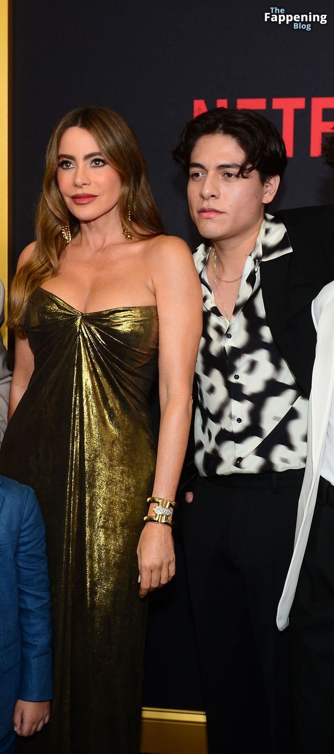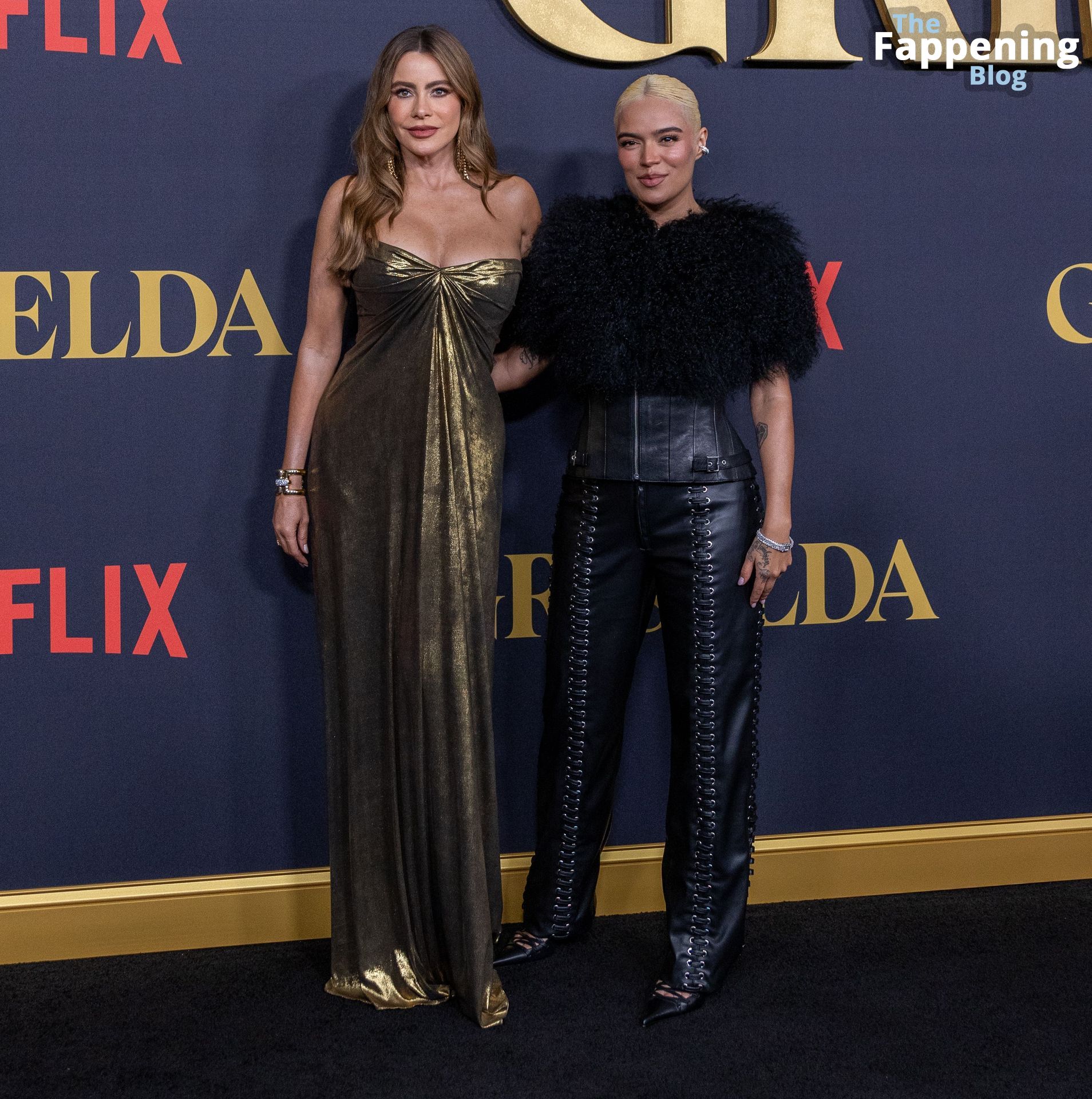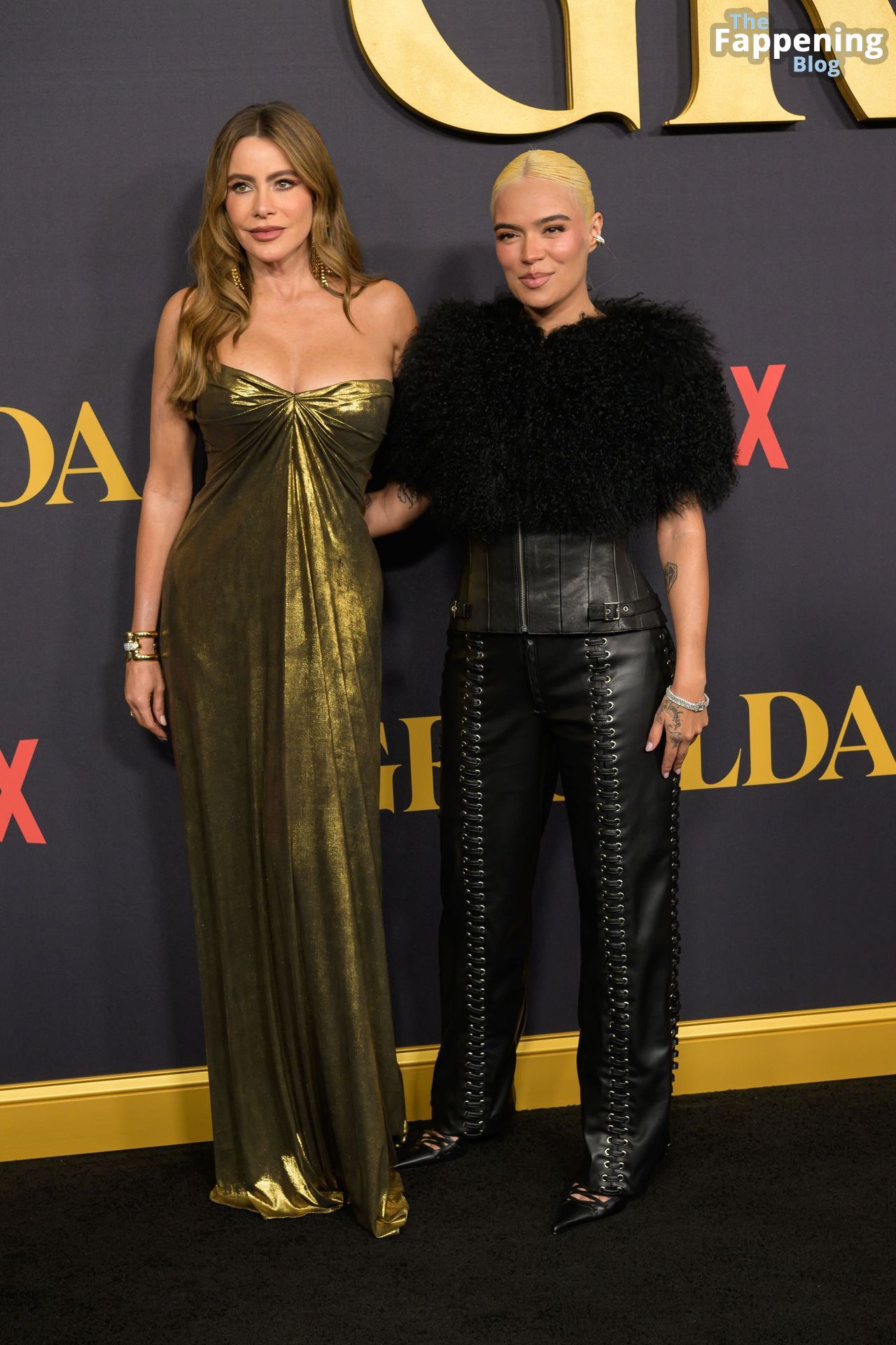 София, 51 год, блистает в этом наряде на премьере шоу Netflix. София появилась вместе с Karol G. Также на красной дорожке были замечены Лили Эстефан и её дочь Лина Луасес.