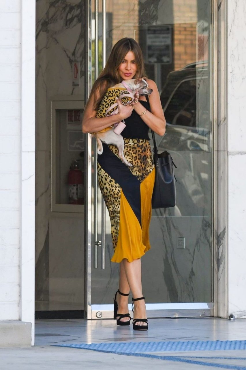 Sofia Vergara выходит из медицинского здания, прижимая к себе своего пса Багетта Гонсалеса в Лос-Анджелесе, 28.06.2019. Звезда улыбается нашим камерам, пока ветер развевает волосы актрисы.