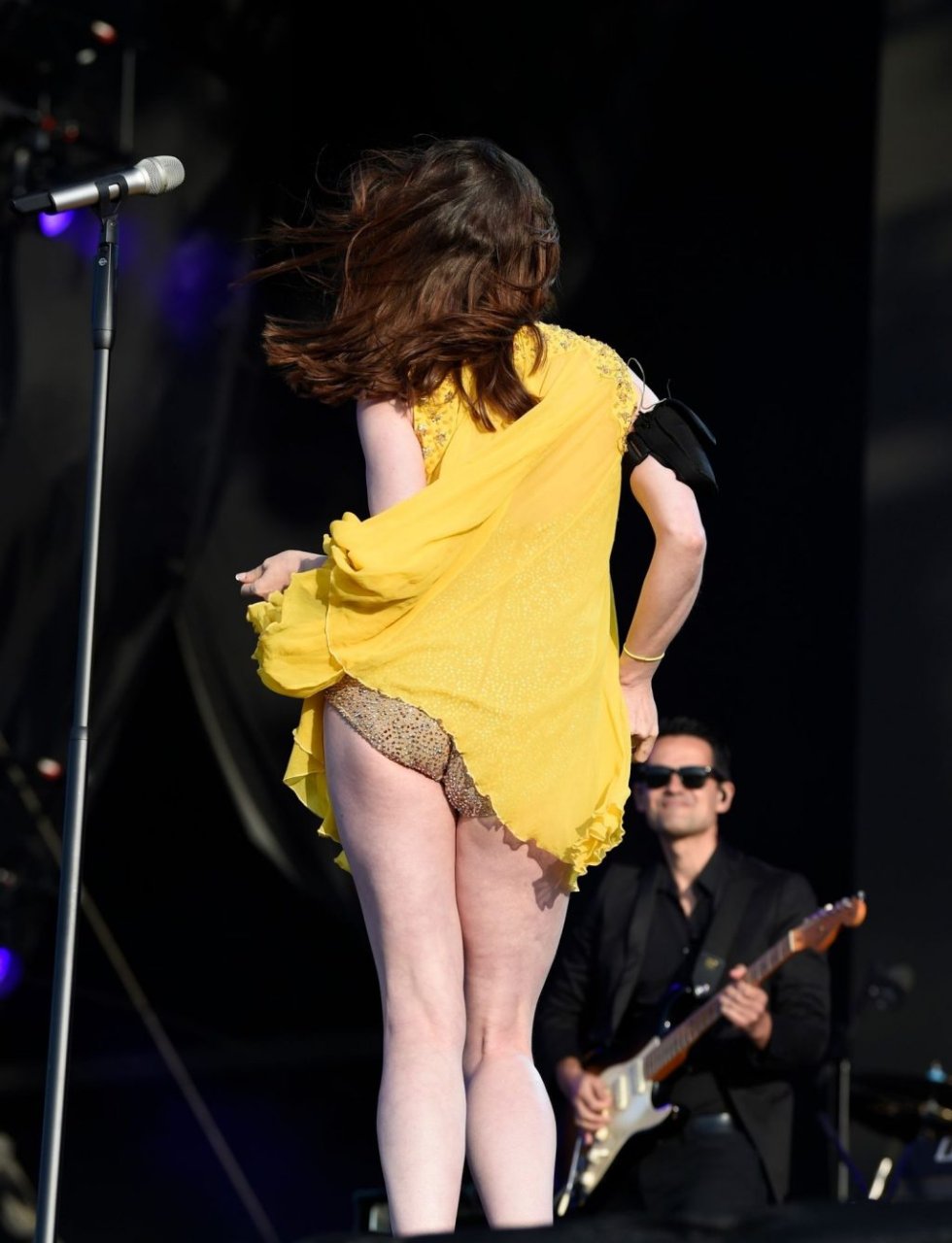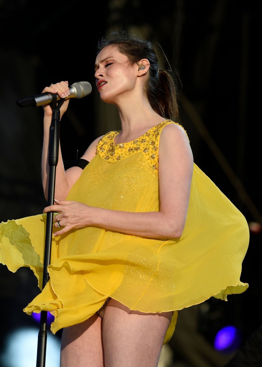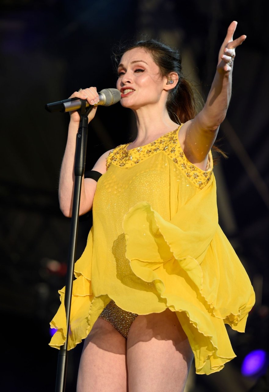 Sophie Ellis Bextor была замечена, когда завязывала волосы после разговора с толпой о ветре и извинялась, если во время выступления на фестивале Lytham в Лайтам-Сент-Эннс, 07/12/2019, случайно покажет свой купальник.