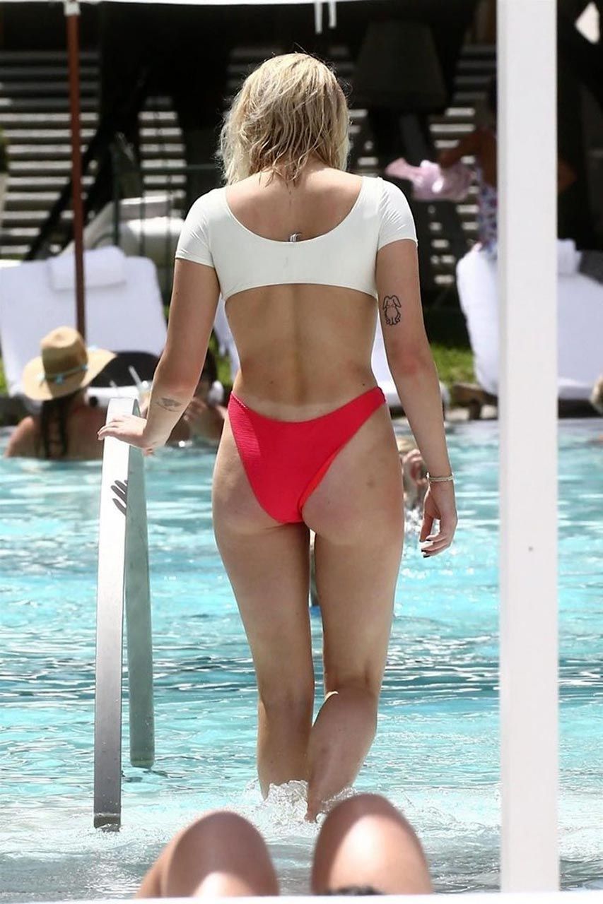 The new paparazzi summer catch is here! Sophie Turner’s bikini pics from the Delano Hotel pool are something you can’t see every day! Lucky you, Sophie Turner’s ass and tits you don’t want to see every day because they are disgusting and disappointing! Lady of Winterfell is so pale, has no ass, her tattoos are lame. The only good thing on her body is those nice firm tits and hard nipples under that improvised bikini!