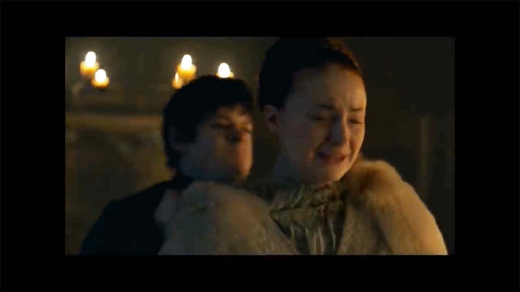 Sophie Turner is making out with a guy in bed. He is taking off her shirt to reveal a bra and sexy panties.