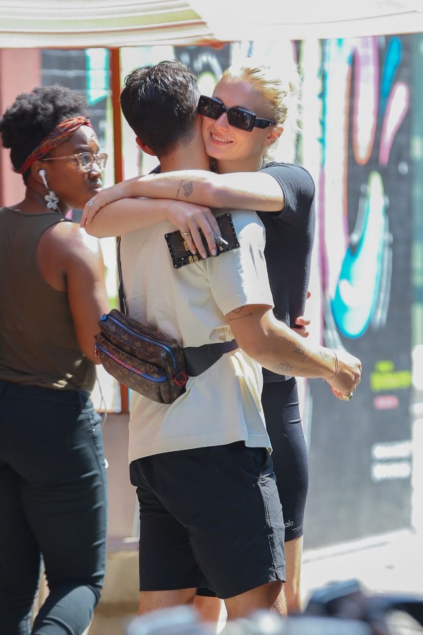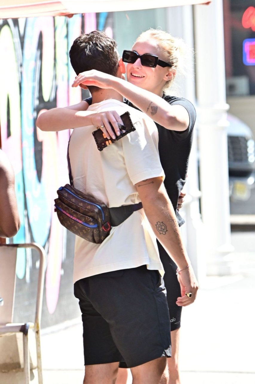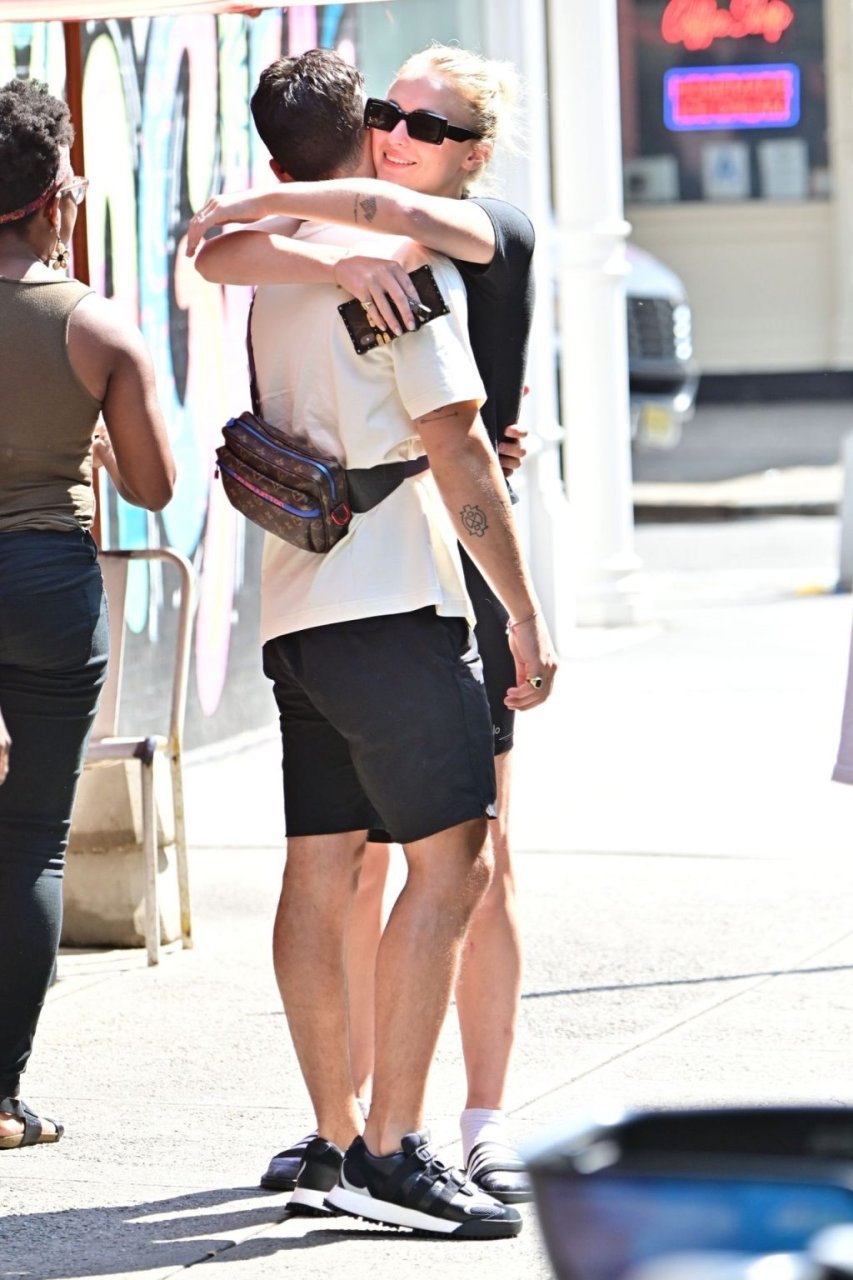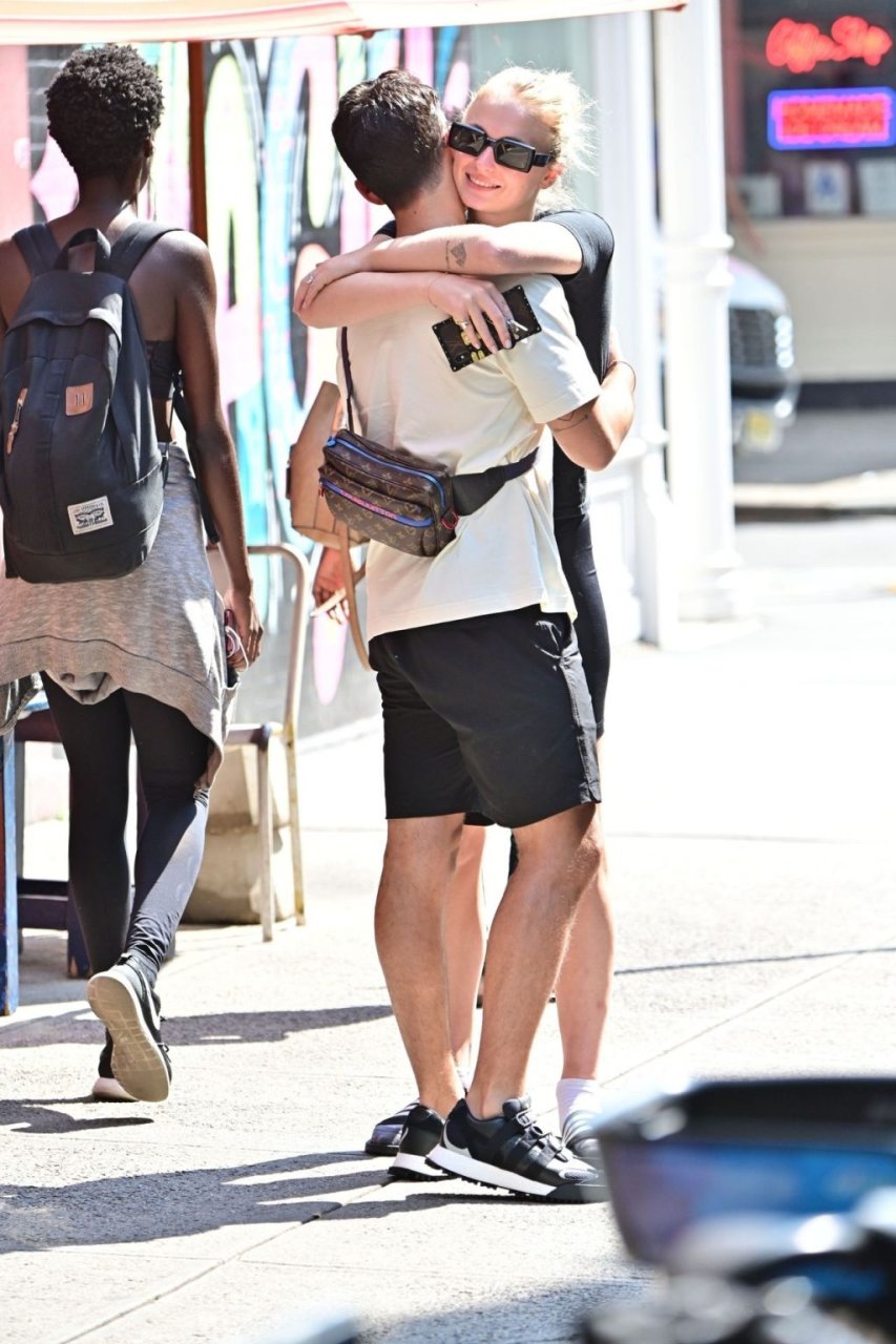 Sophie Turner целует и обнимает мужа Джо Джонаса перед его концертом в момент публичной демонстрации чувств после их обеда с друзьями в Нью-Йорке, 19.08.2019.