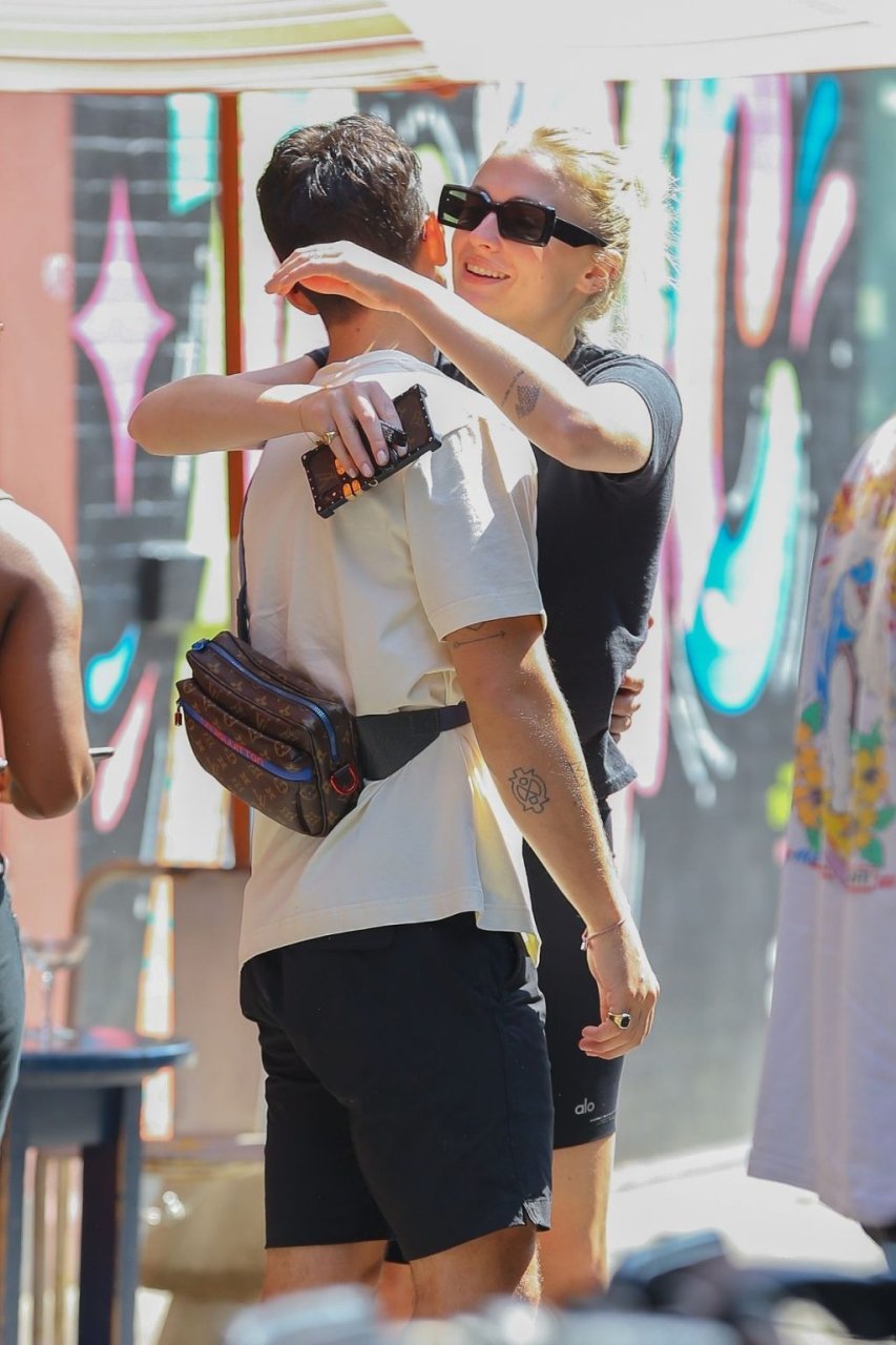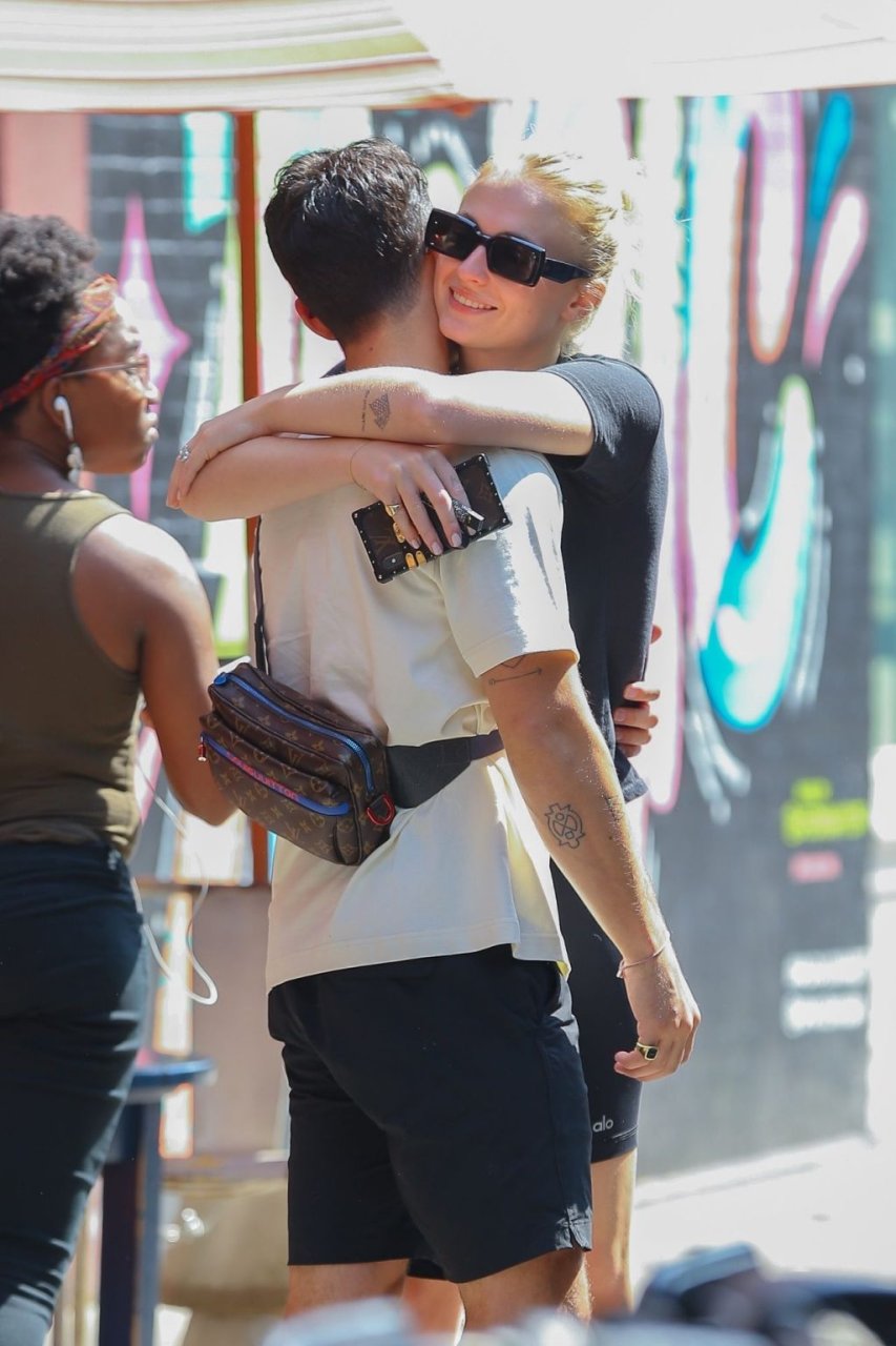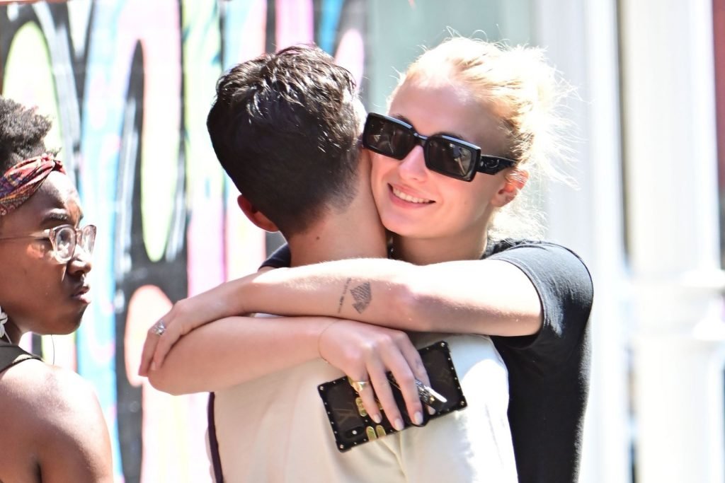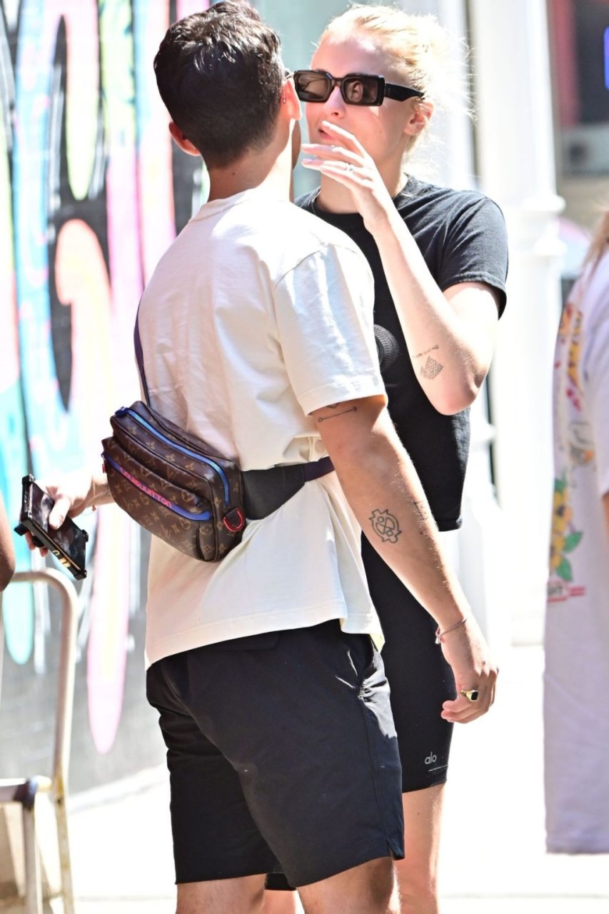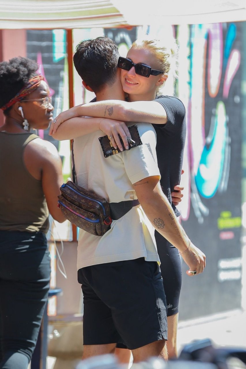 Sophie Turner целует и обнимает мужа Джо Джонаса перед его концертом в момент публичной демонстрации чувств после их обеда с друзьями в Нью-Йорке, 19.08.2019.
