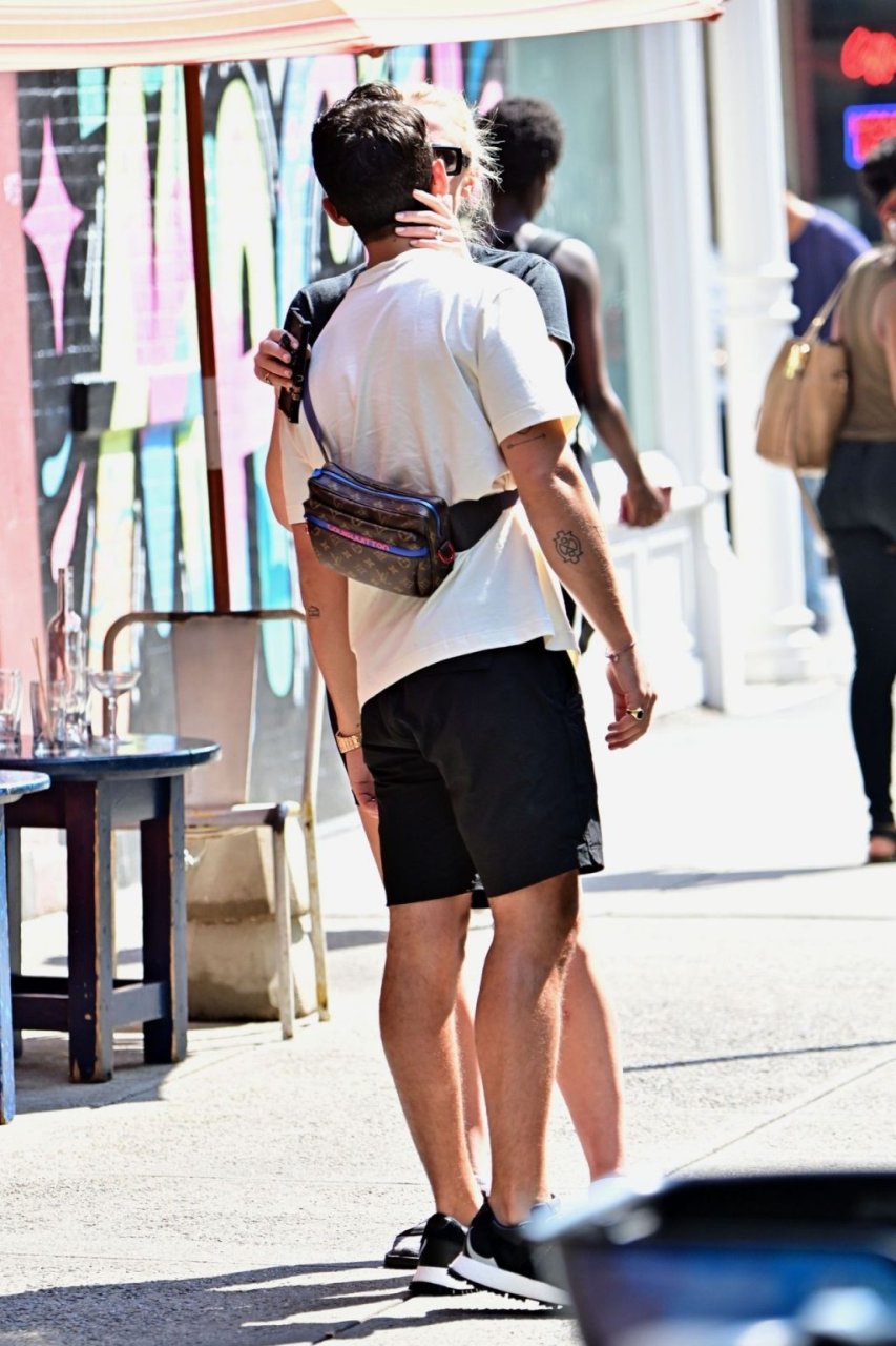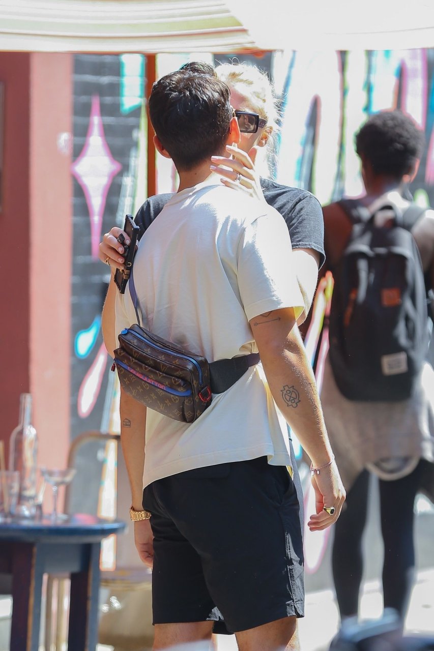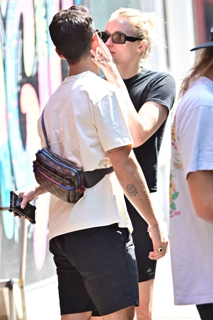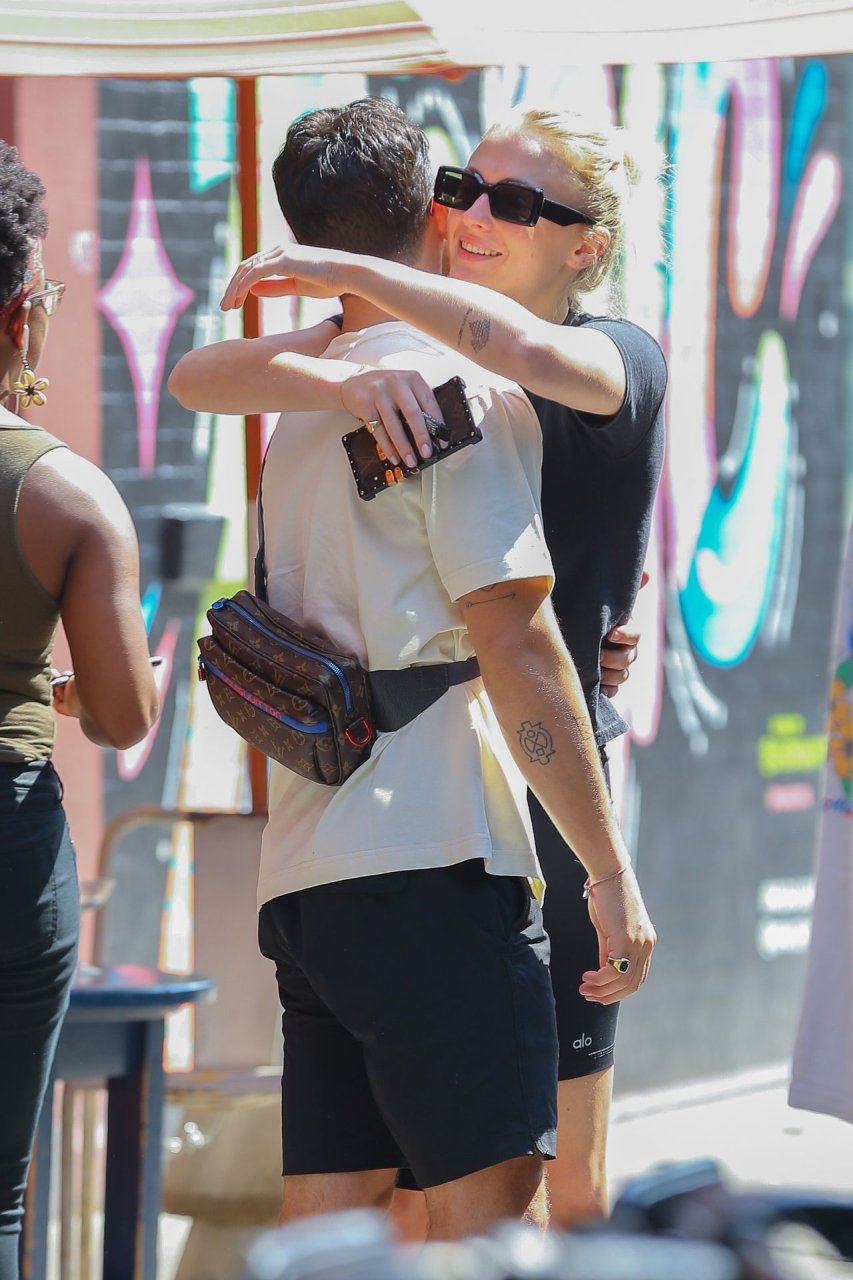 Sophie Turner целует и обнимает мужа Джо Джонаса перед его концертом в момент публичной демонстрации чувств после их обеда с друзьями в Нью-Йорке, 19.08.2019.