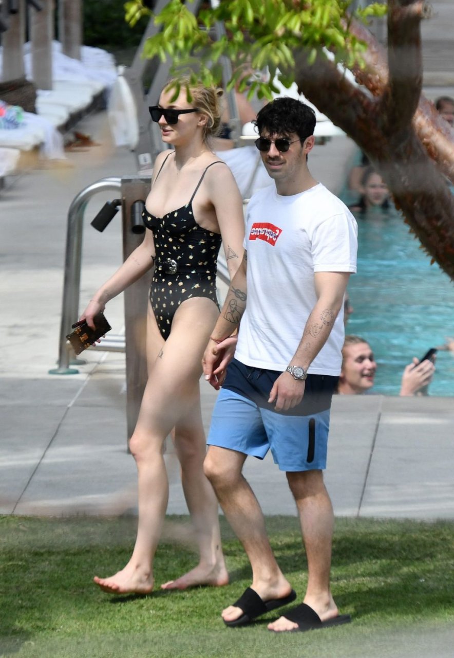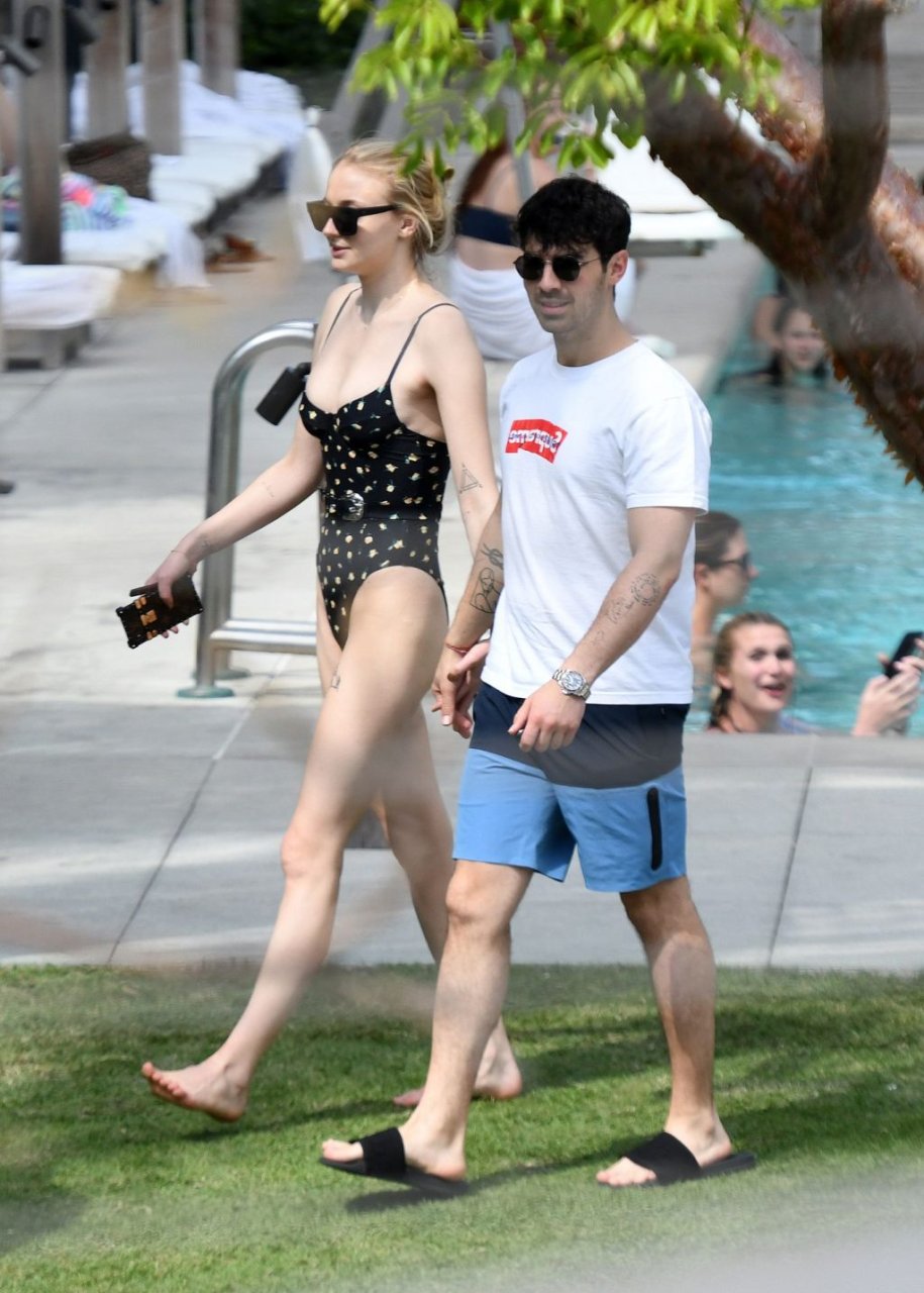 Актриса Софи Тернер в черном купальнике с поясом вместе с женихом Джо Джонасом в Майами, 23.03.2019.