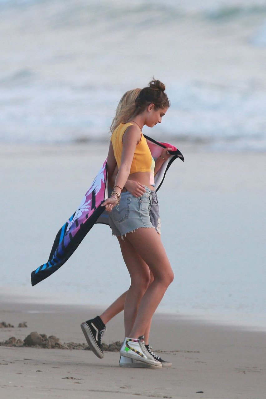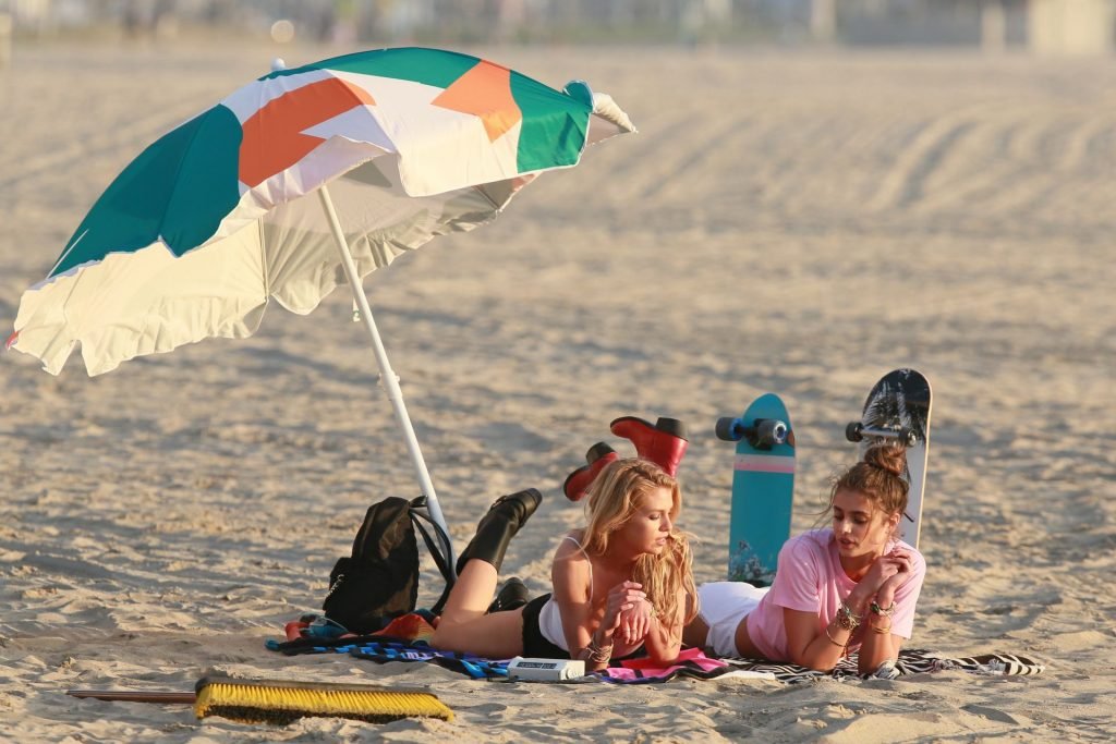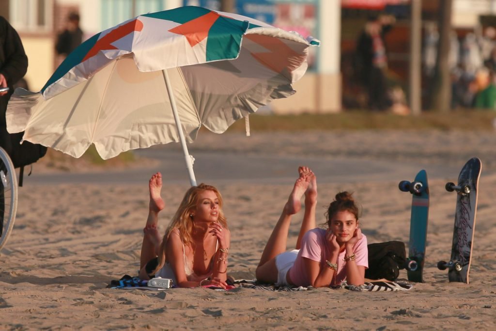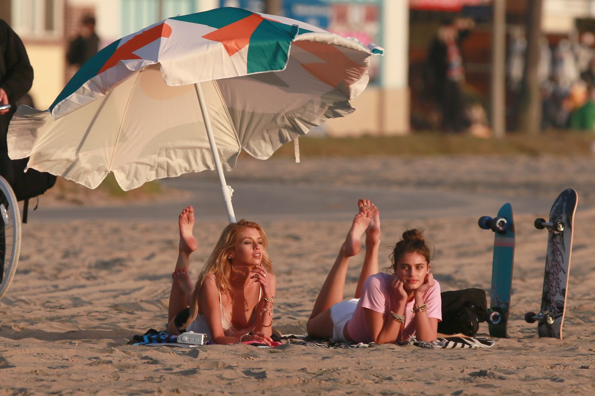 28-летняя красавица была без бюстгальтера для съемки и испытала небольшой казус в виде оголения соска, когда девушки лежали на песке под пляжным зонтом, одетые в шелковую майку.