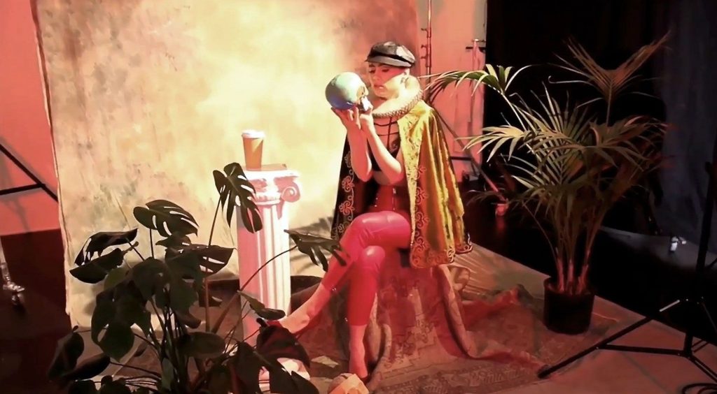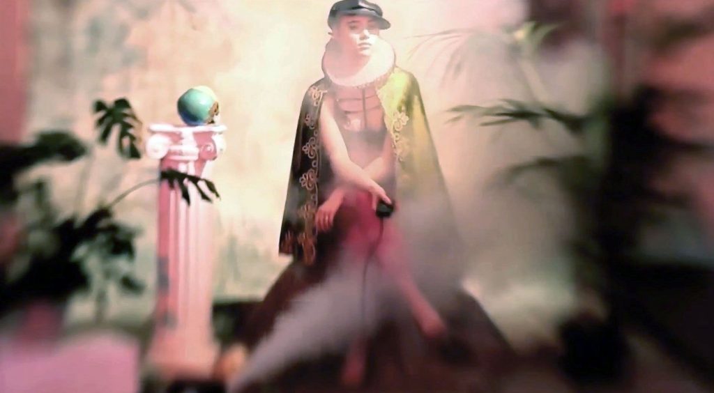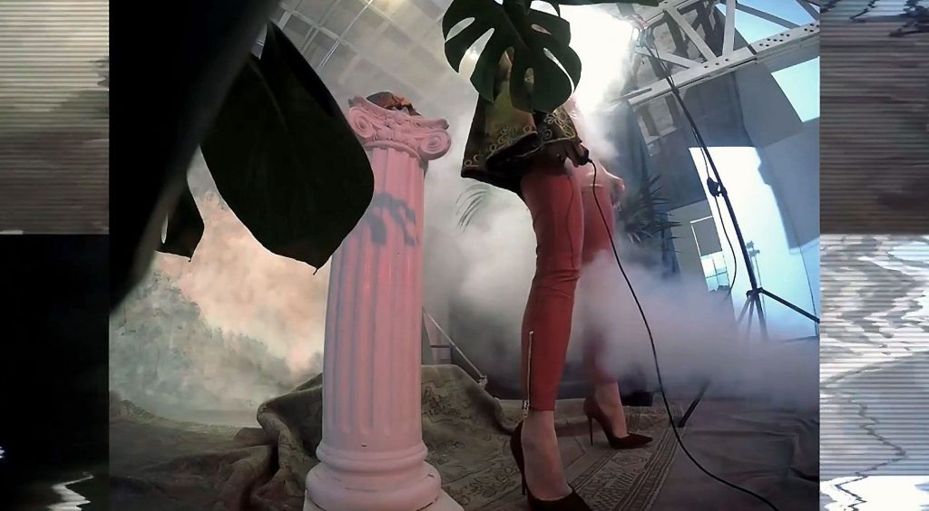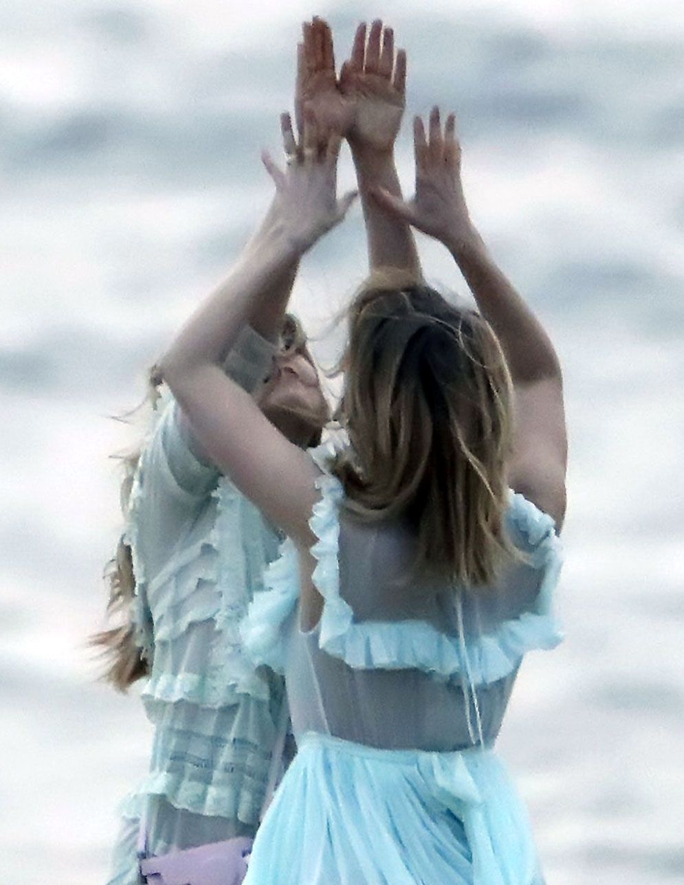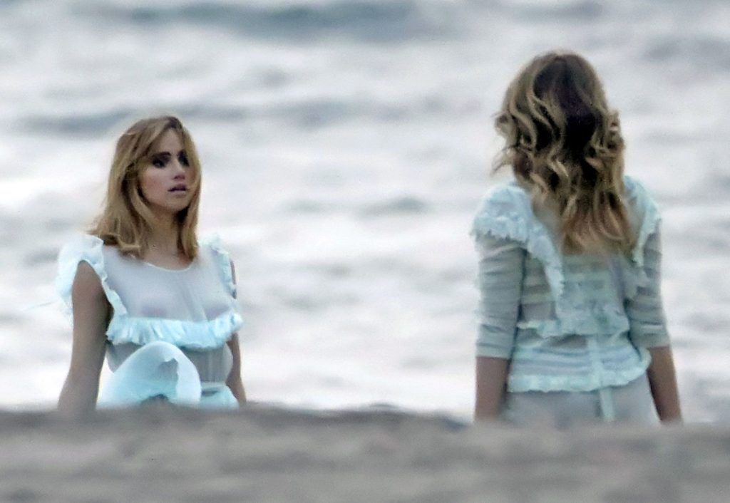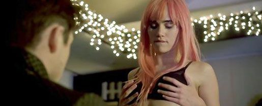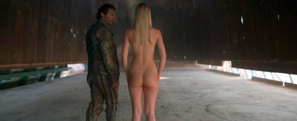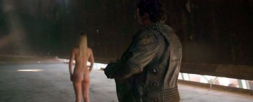 Waterhouse is shown naked from behind as she stands in a warehouse, revealing her butt while a man approaches and then stands by her, stroking her hair away from her neck.