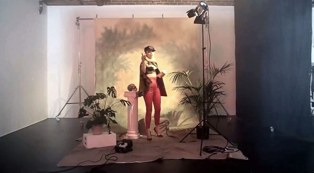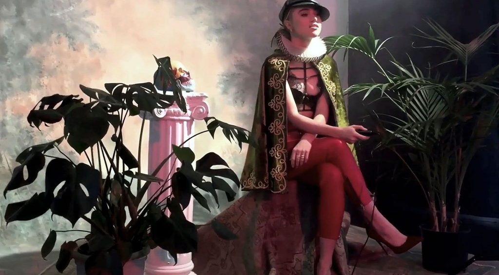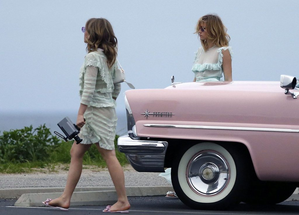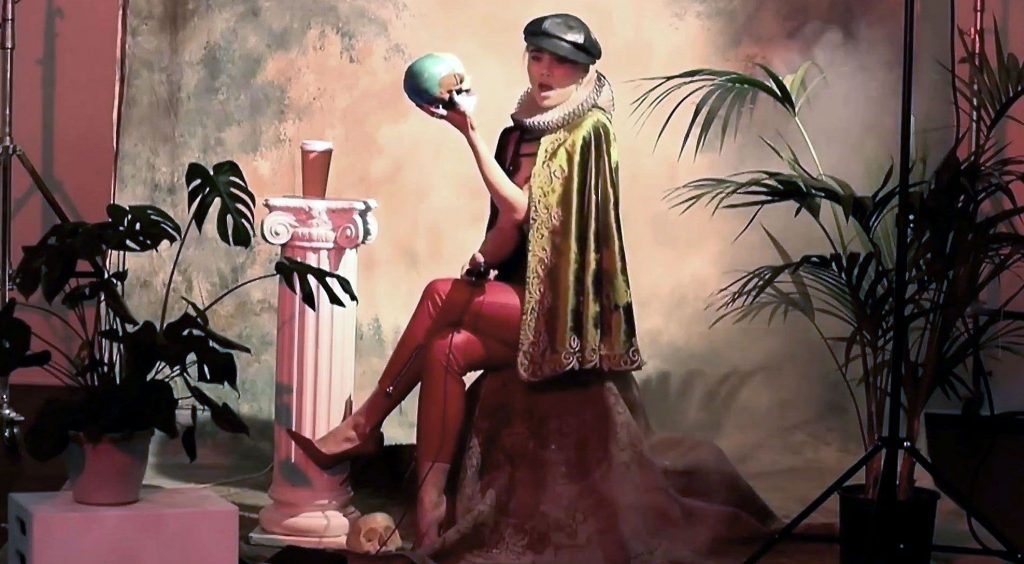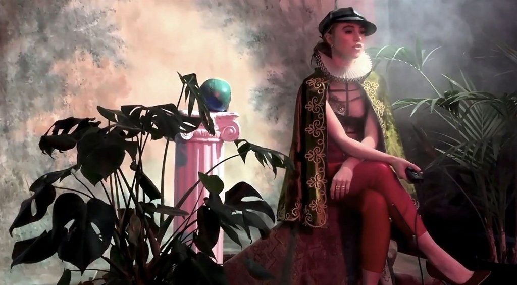 Here, Suki Waterhouse removes her white fur coat to reveal a black bra and her ass in black lace thong underwear with a garter and stockings while a man stares at her.