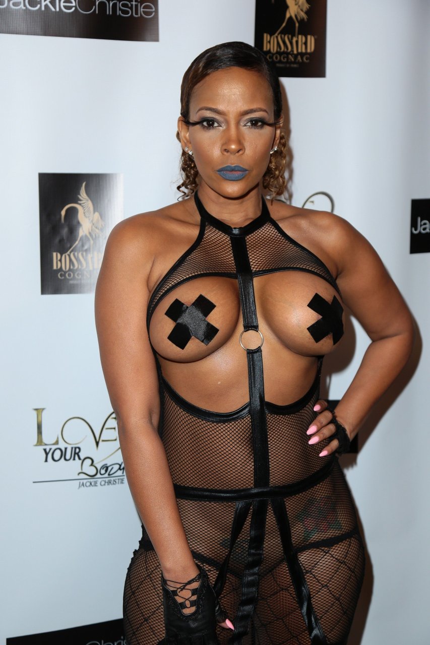 Санди Картер носит сексуальный черный сетчатый наряд с пэстис на живой съемке шоу “Жены баскетболистов: Лос-Анджелес” в отеле Culver в Кулвер-Сити, 15.03.2017. Санди Картер — актриса и звезда реалити-шоу. Возраст: 44 (родилась 30 марта 1972).