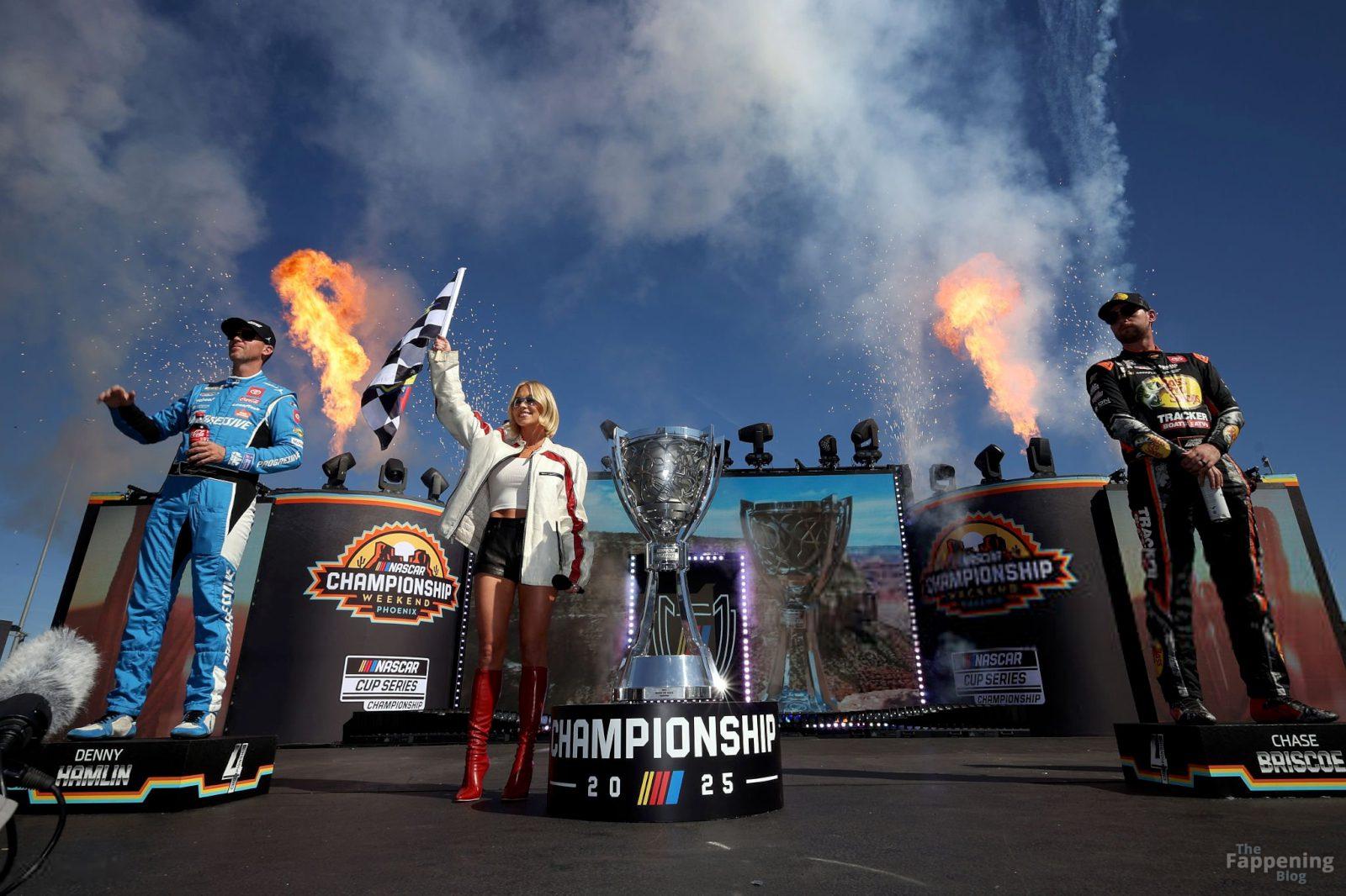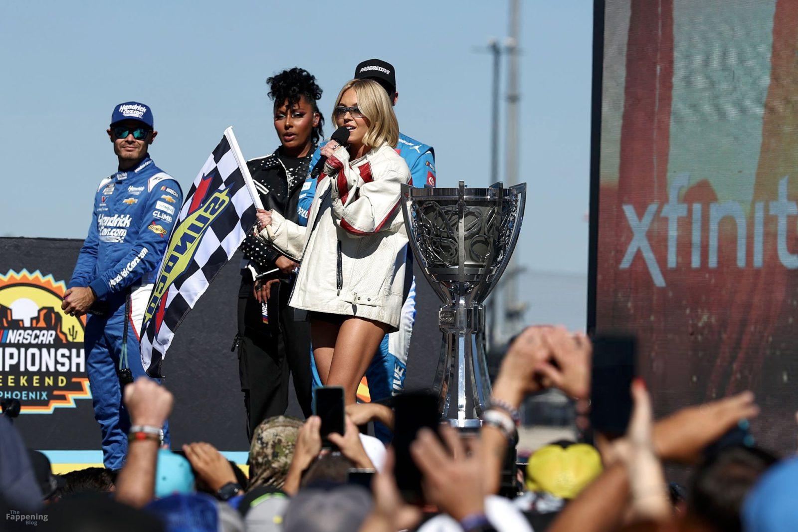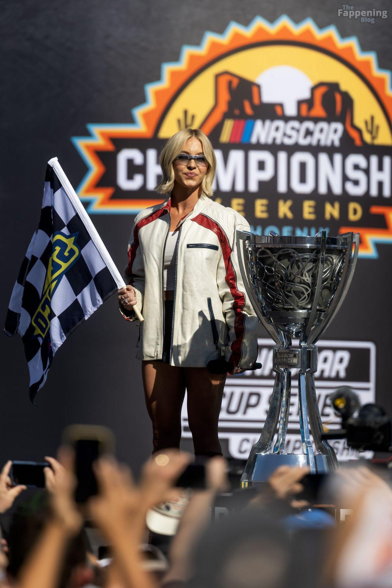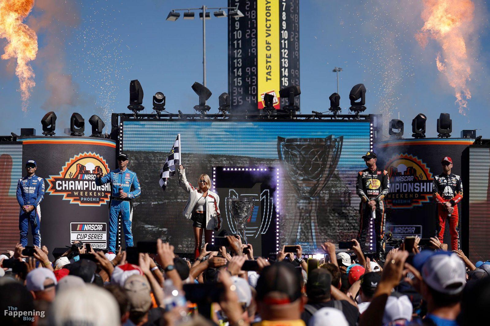 Сидни Суини была на чемпионате серии NASCAR Phoenix Cup в крошечных кожаных шортах, укороченном топе и красных ботинках.