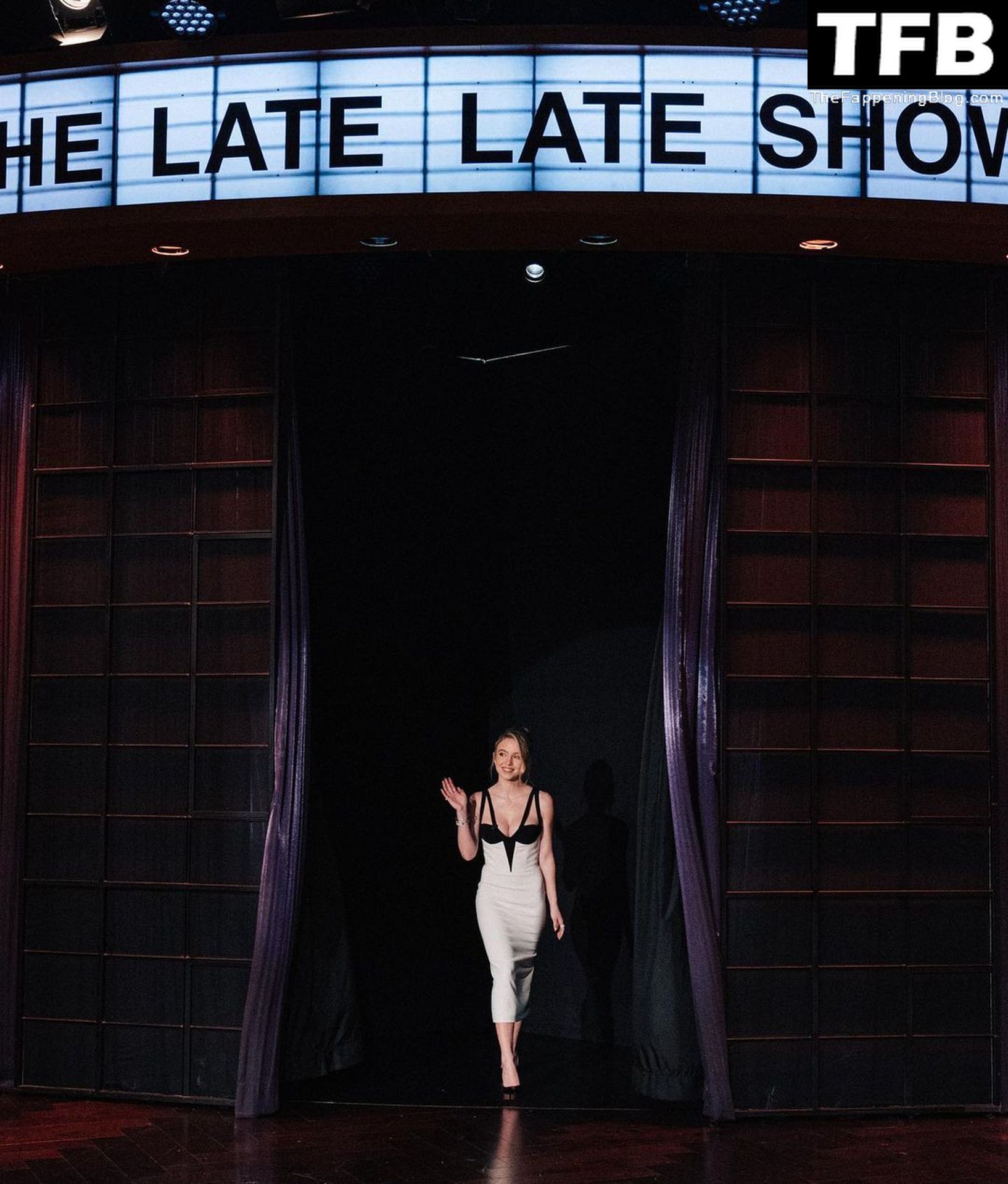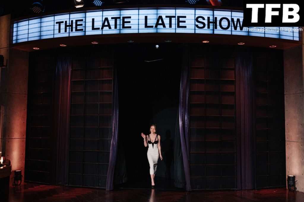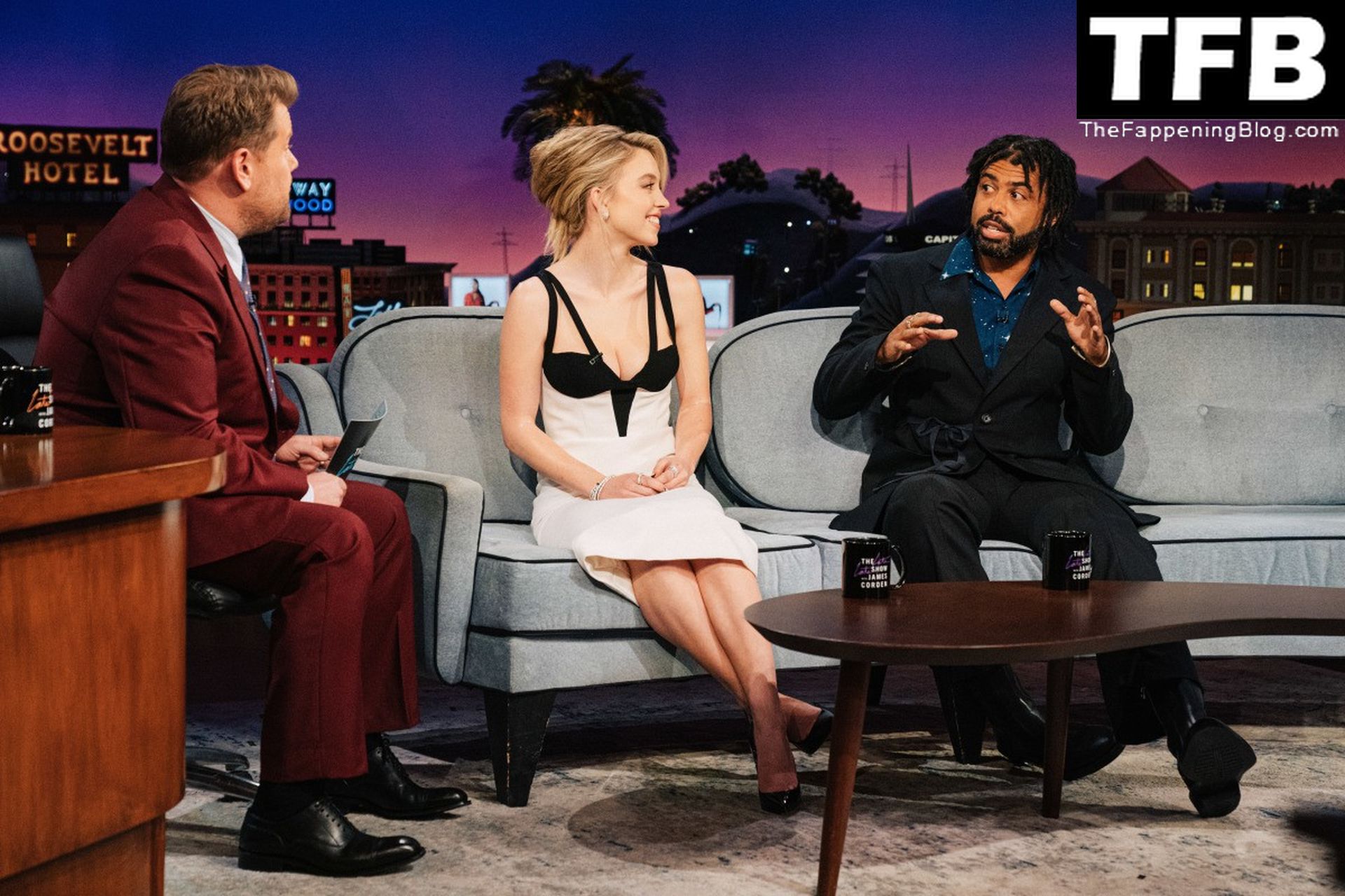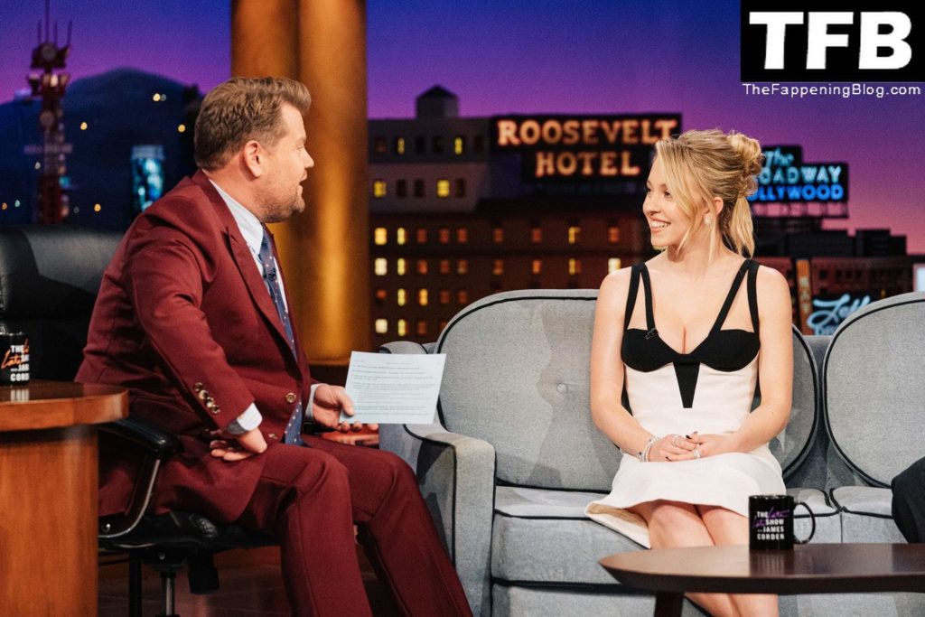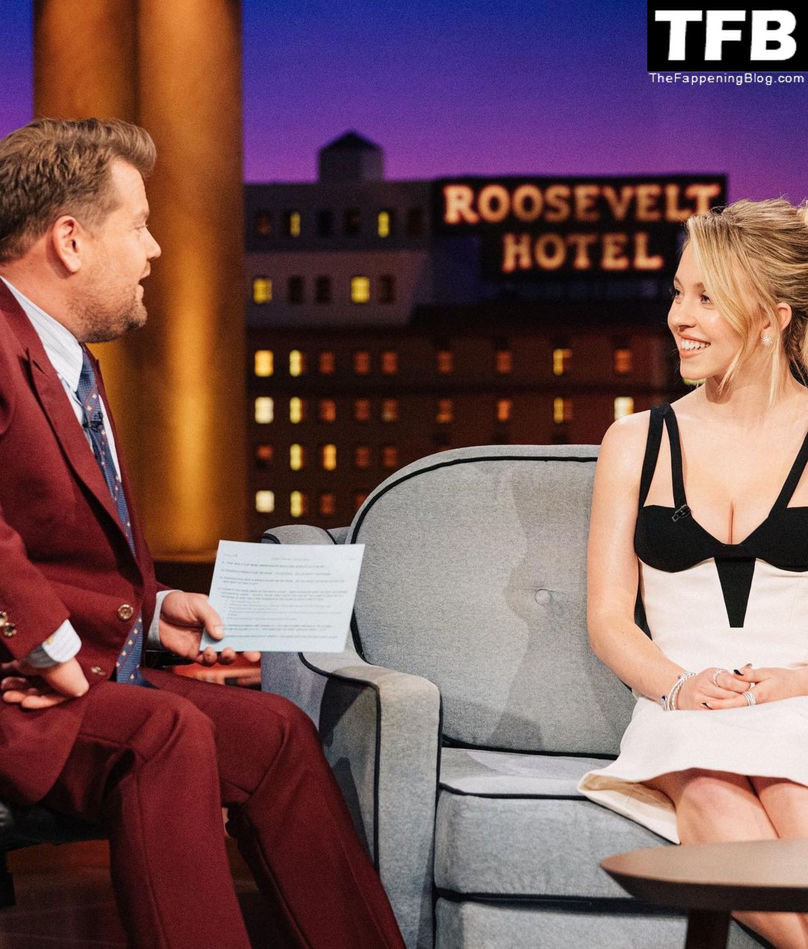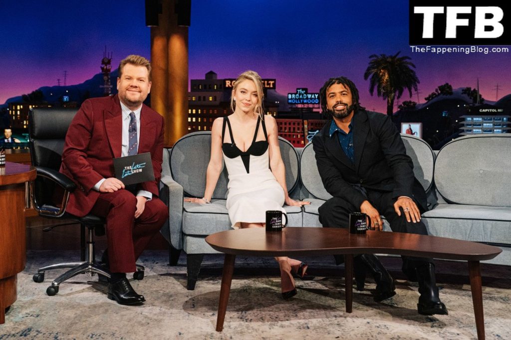 Актриса Сидни Суини дразнит поклонников своими сексуальными грудями, появившись в черно-белом платье в шоу «The Late Late Show with James Corden» в Лос-Анджелесе, 26.01.2022.