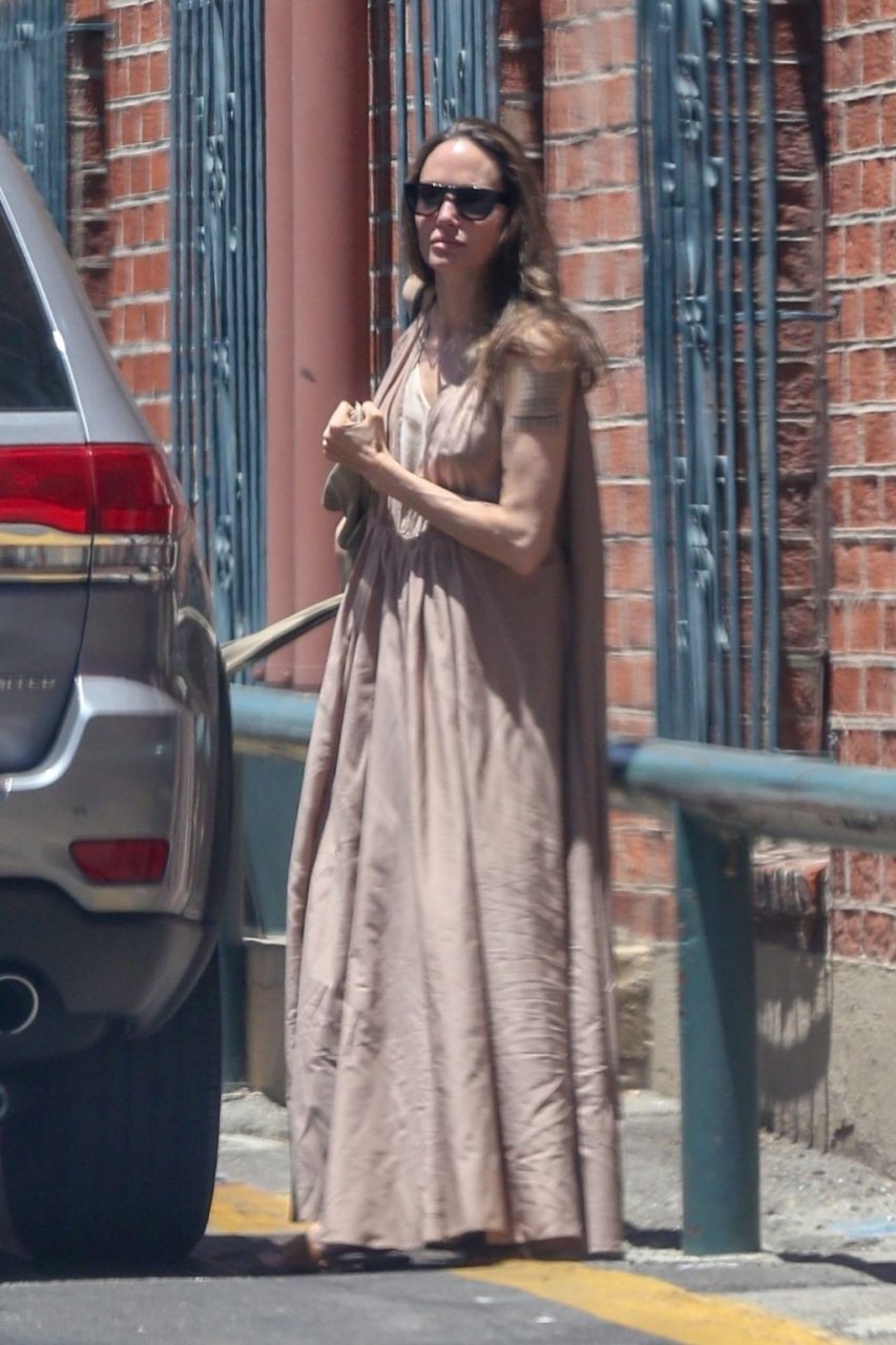 Анджелина Джоли находится в Беверли-Хиллз, посещая клинику в нюдовом платье и черных солнцезащитных очках, 01.07.2019. 44-летняя звезда попросила ассистента нести ее пальто.