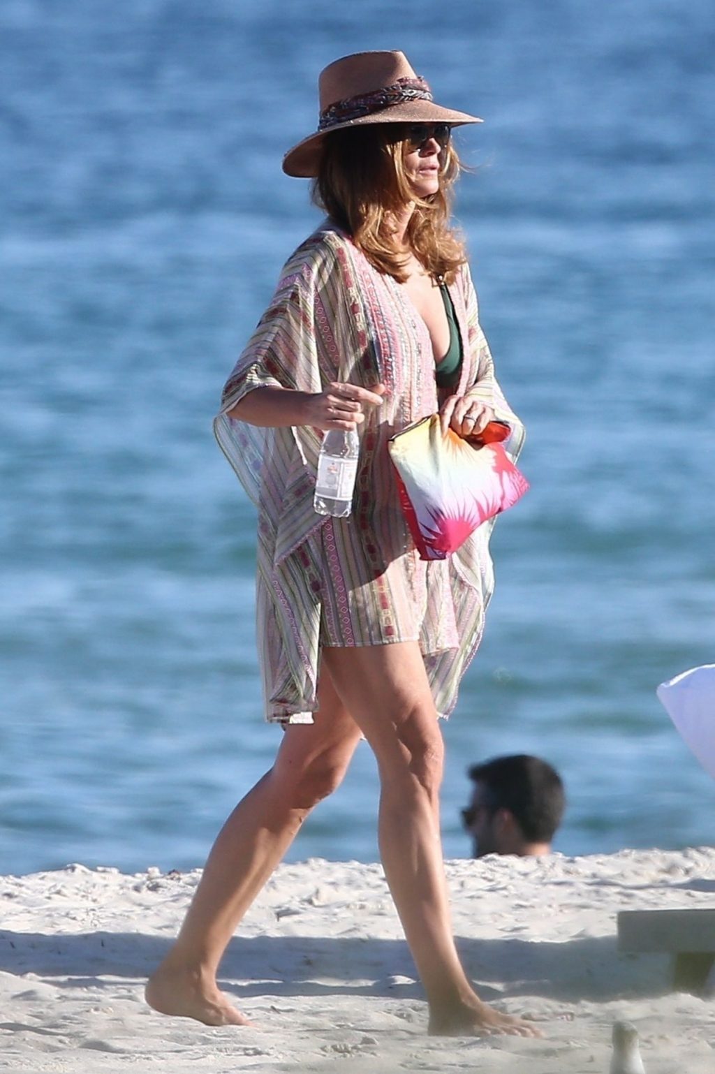 Кимберли Гарнер выходит на пляж в маленьком белом бикини и синем топе Chanel, прогуливаясь по пляжу во время недавнего отпуска на солнце, 21.07.2019.