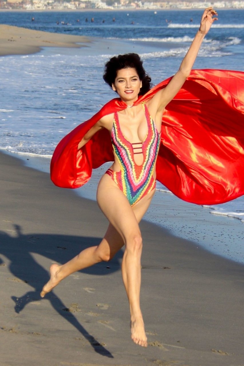 Актриса Бланка Бланко наряжается Супергёрл (или украла плащ Супермена) на Хэллоуин для фотосессии на пляже Малибу в песке, 31.10.2018.