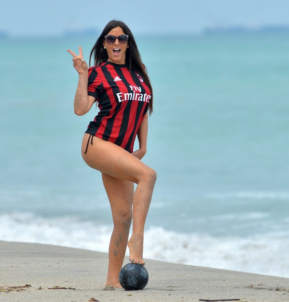 Клаудия Романи выглядит сногсшибательно в своей футболке AC Milan, играя с бойфрендом, предпринимателем Крисом Джонсом на пляже Санни-Айлс, 19.07.2017. Клаудия Романи — модель, бывшая звезда французского реалити-шоу ‘Secret story 9’ и победительница в номинации брюнетка года 2016 для Playboy Italy.