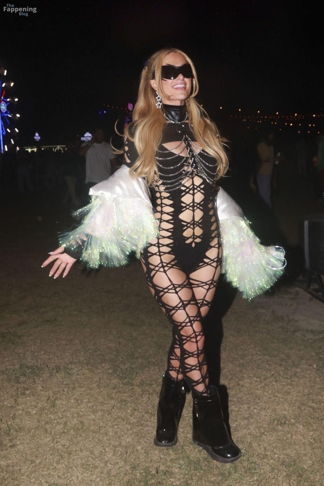 Пэрис Хилтон была на Neon Carnival фестиваля Coachella, блистая в бондажном боди с шнуровкой, которое подчеркивало её потрясающую фигуру.