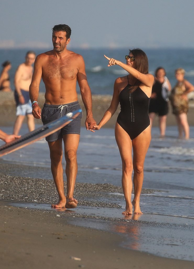 Итальянский футболист Джанлуиджи Буффон был замечен на пляже со своей партнершей, ведущей Sky Sport Иларией Д’Амико (44), в Марина-ди-Масса, Италия, 07/05/2018. Илария Д’Амико была в черном цельном купальнике.
