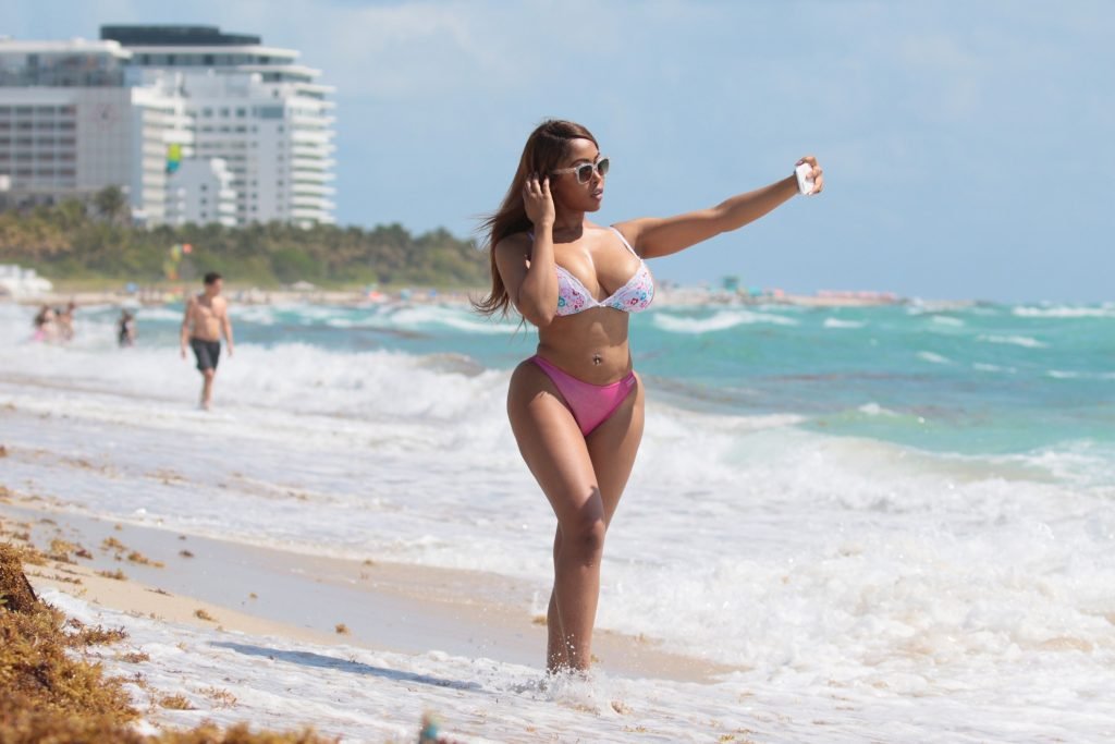 Moriah Mills делает селфи на пляже в Майами-Бич, 11.05.2017. Moriah Mills — американская модель, звезда Instagram.