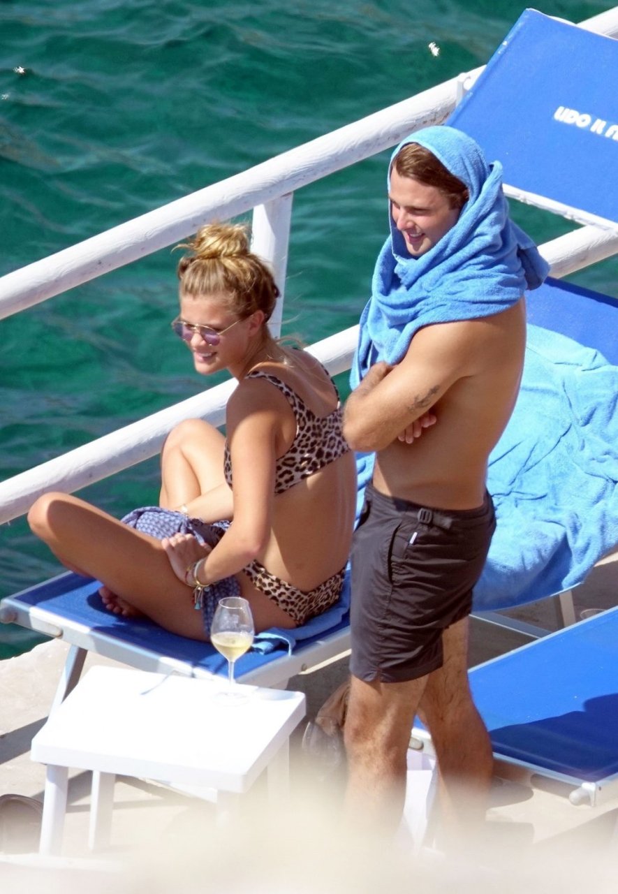Датская модель Нина Агдал (26) и её парень Джек Бринкли-Кук (23) наслаждаются отпуском на Капри, Италия, 31.07.2018. Нина была в леопардовом бикини, загорая, и была сфотографирована во время проявления чувств с Джеком. Нина и Джек были замечены на скалах перед тем, как прыгнуть в море для купания.