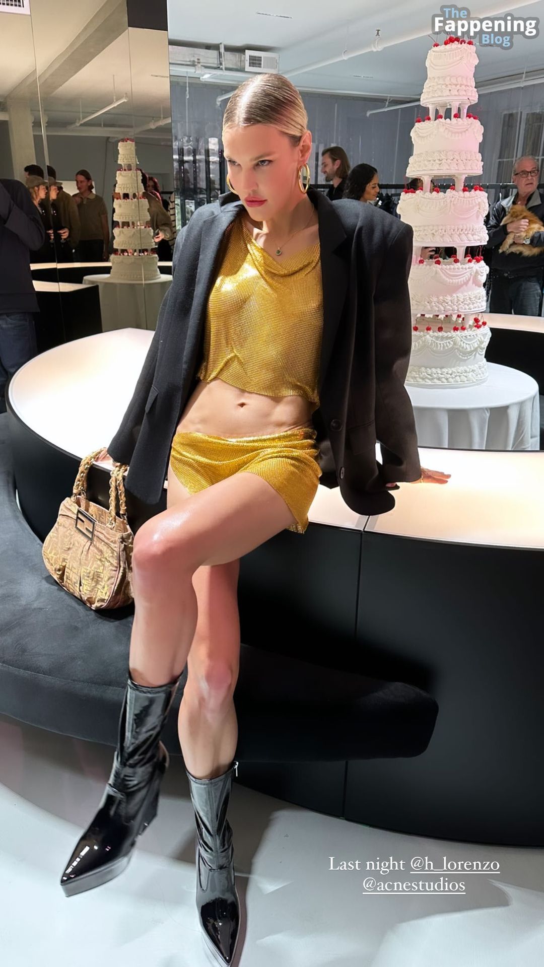 Модель была в крошечном золотом топе, который был настолько тесным и тонким, что можно было увидеть ее соски! Она явно наслаждалась собой, и ее твердые соски были тому доказательством. Ее стройная фигура и потрясающее лицо были полностью на виду в этом смелом наряде. Но это еще не все — она дополнила образ черными ботфортами на высоком каблуке и массивными серебряными браслетами.