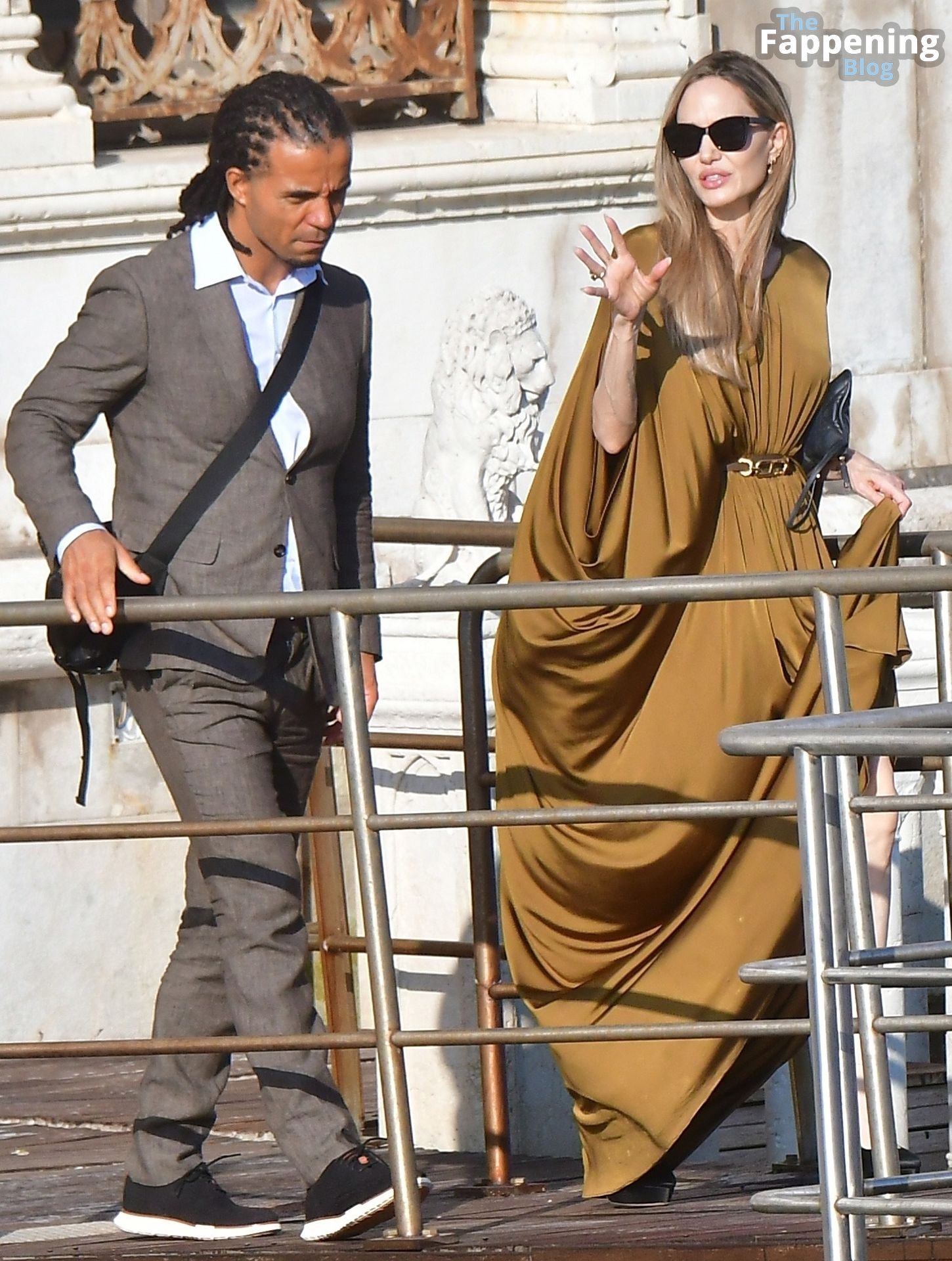 Американская актриса Анджелина Джоли выглядит потрясающе в греческом платье, проводя время с рэпером Акала, когда они выходят из отеля и отправляются на премьеру фильма «Мария» на Венецианском кинофестивале.