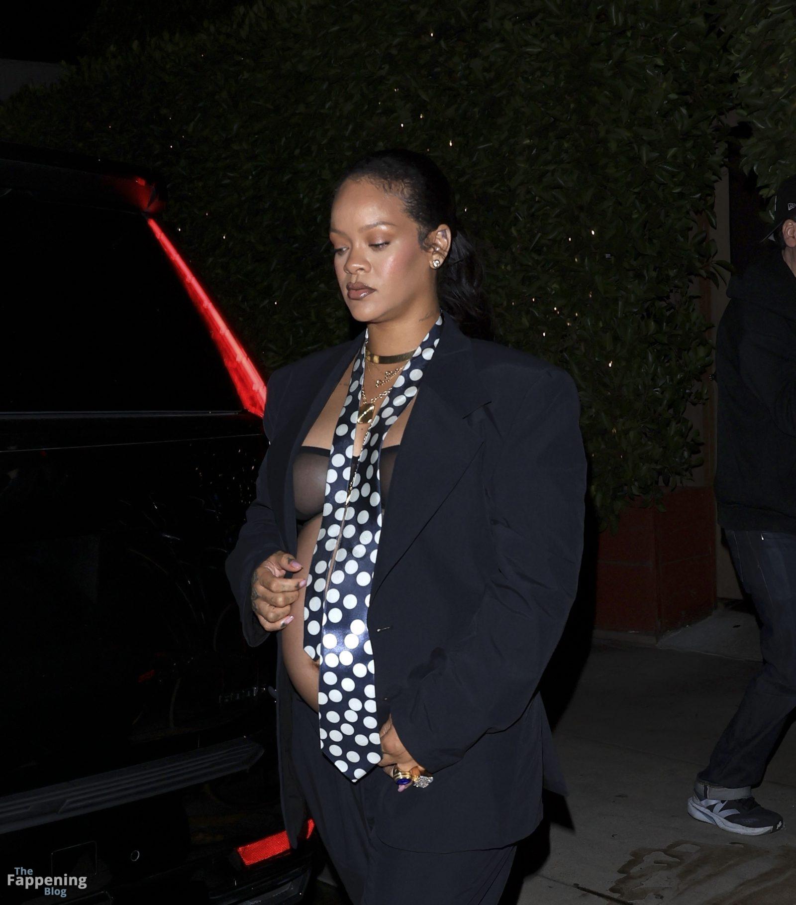 Звезда Fappening Рианна появилась в прозрачном бюстгальтере и широко расстегнутом костюме, кокетливо показывая сосок и демонстрируя свой обнажённый животик. Почти голая и абсолютно легендарная.