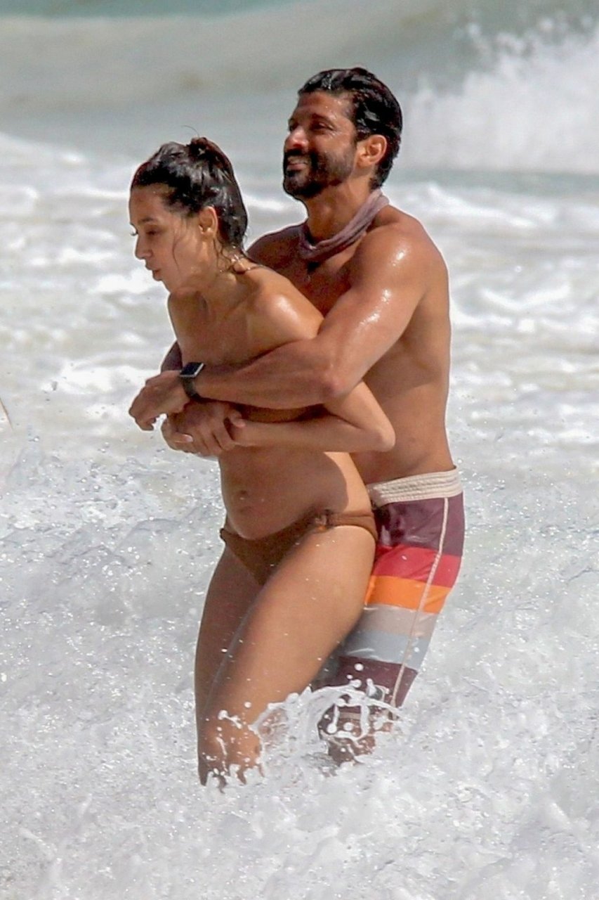 Новая пара Фархан Ахтар (45) и Шибани Дандекар (38) демонстрируют публичные проявления чувств, играя на берегу Мексики во время отпуска, 22.02.2019. Индийский режиссер и индийская певица вместе охлаждаются, загорая в Тулуме.