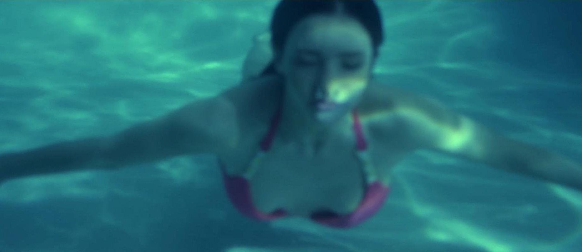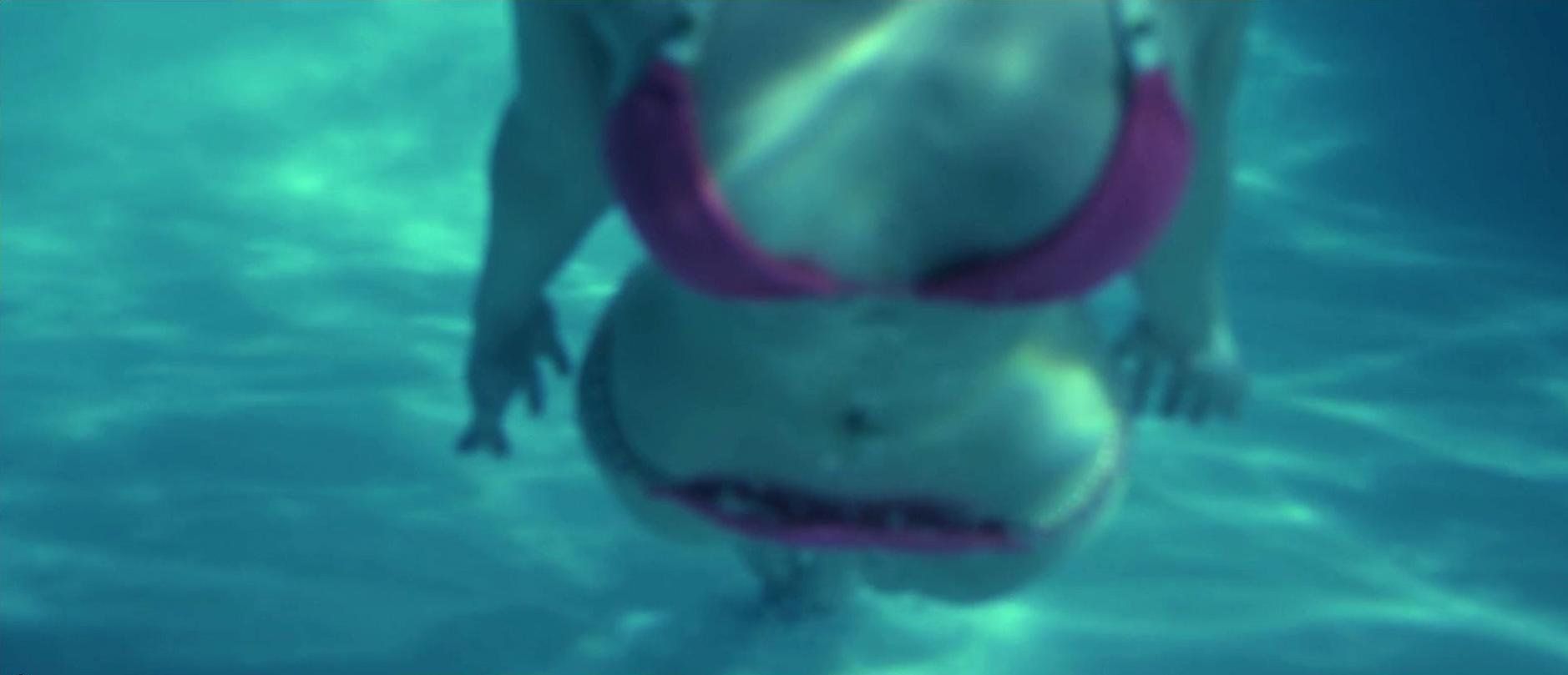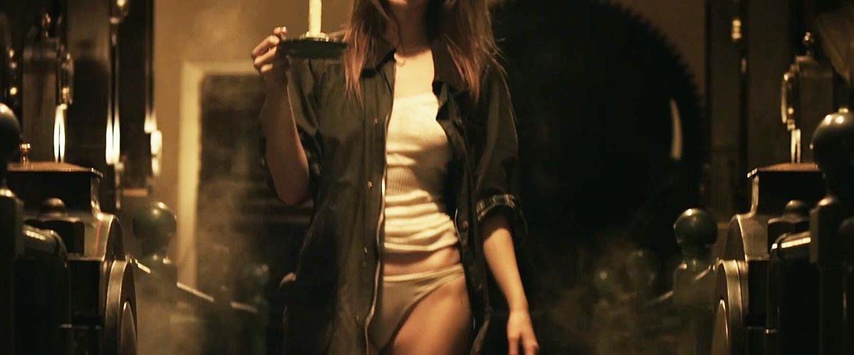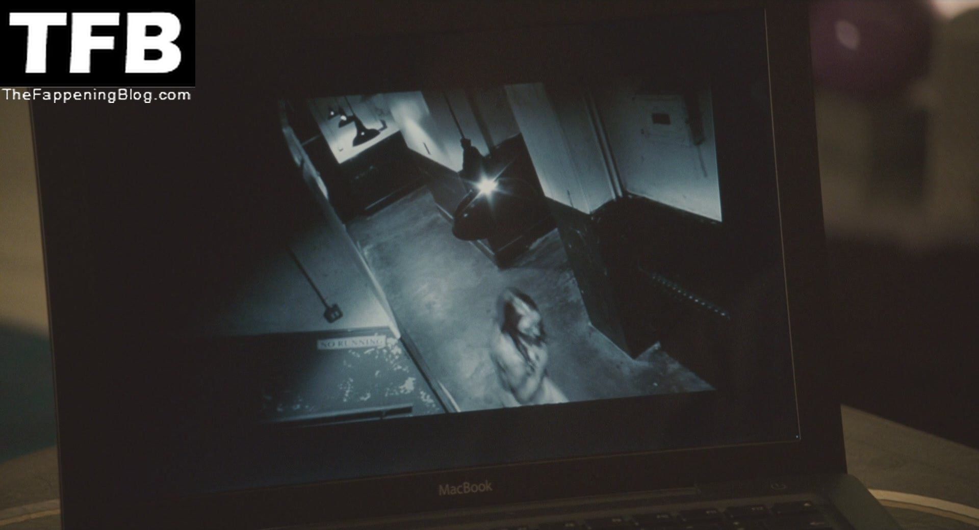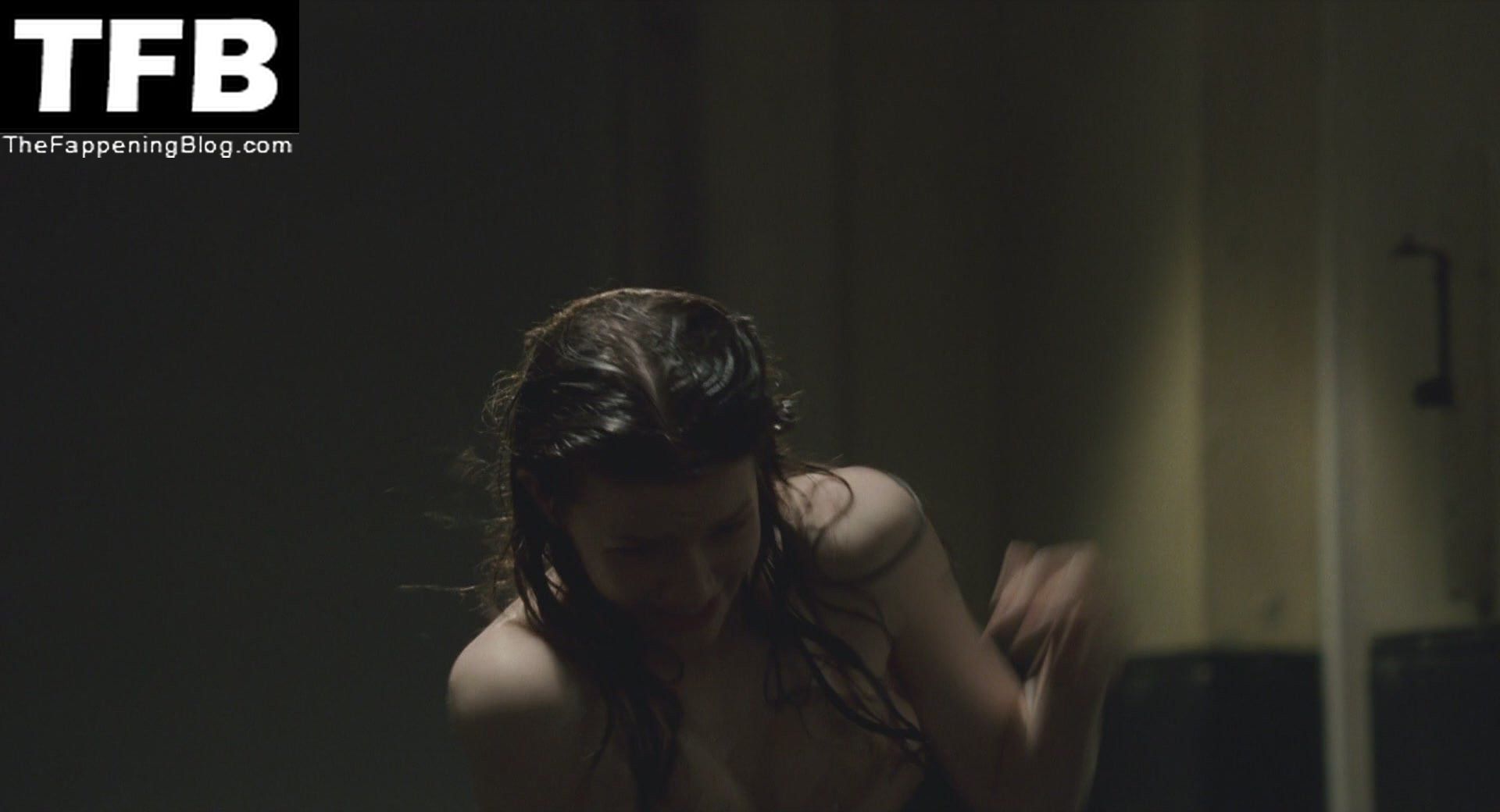 Talulah Riley is in just a pair of panties as she lies on her side in bed and runs his hands over a guy’s back who is sitting beside her. She then lifts herself up, revealing plenty of side boob as she sits behind the guy and puts her arms around him. We then again almost see her full breast but not quite a nipple as she climbs into his arms and then lays down on top of him.