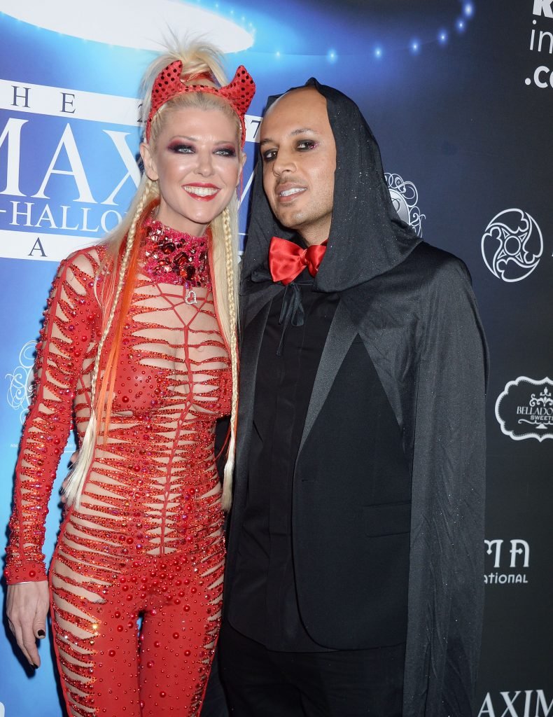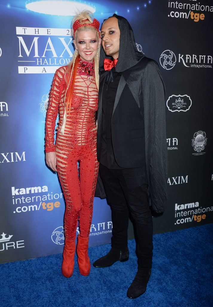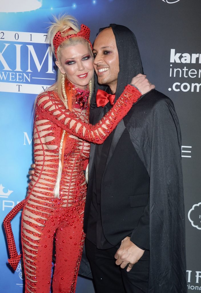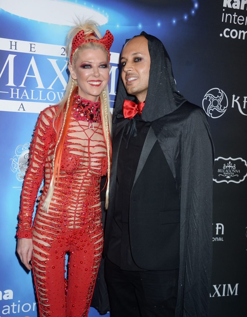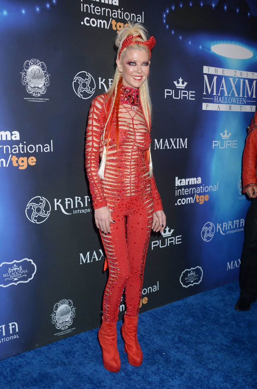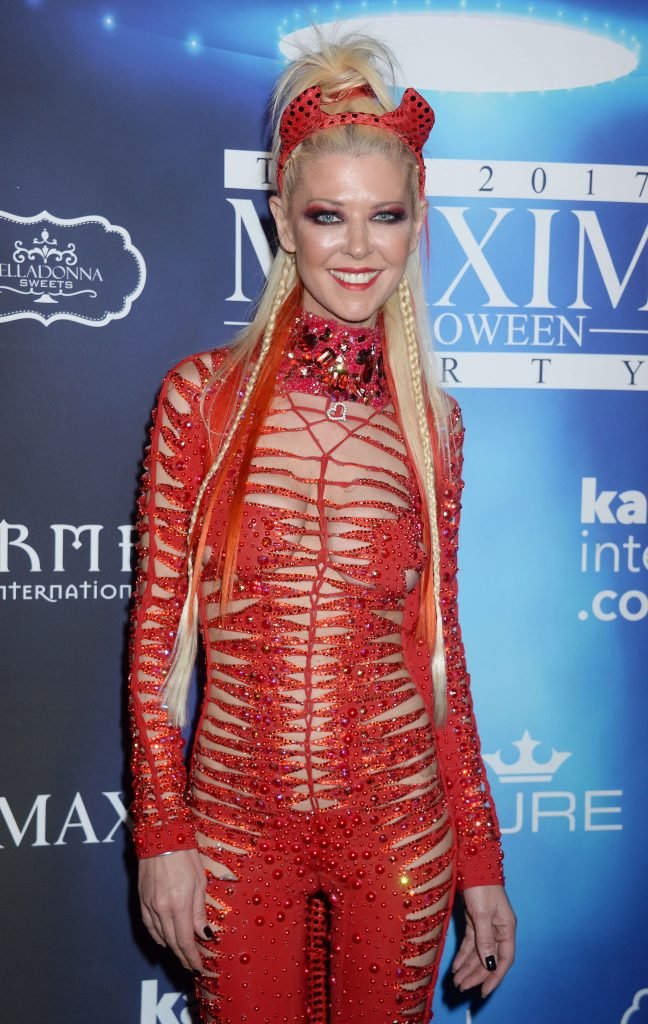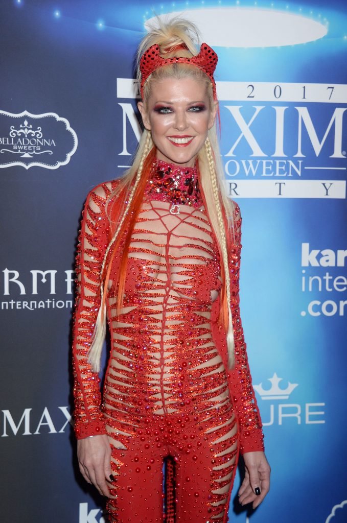 Tara Reid демонстрирует откровенный образ в ярко-красном костюме Дьявола на вечеринке Maxim Halloween в Лос-Анджелесе, 21.10.2017. Тара Донна Рид — американская актриса. Возраст: 41.