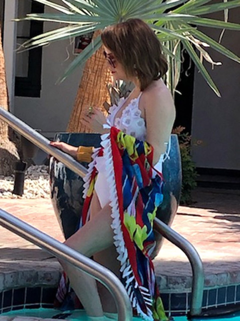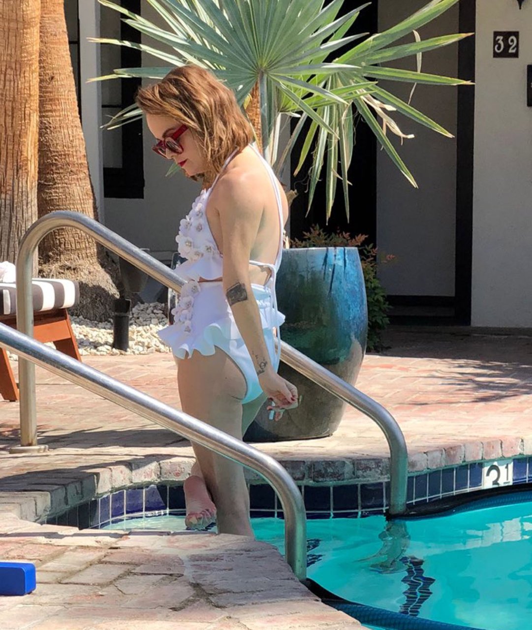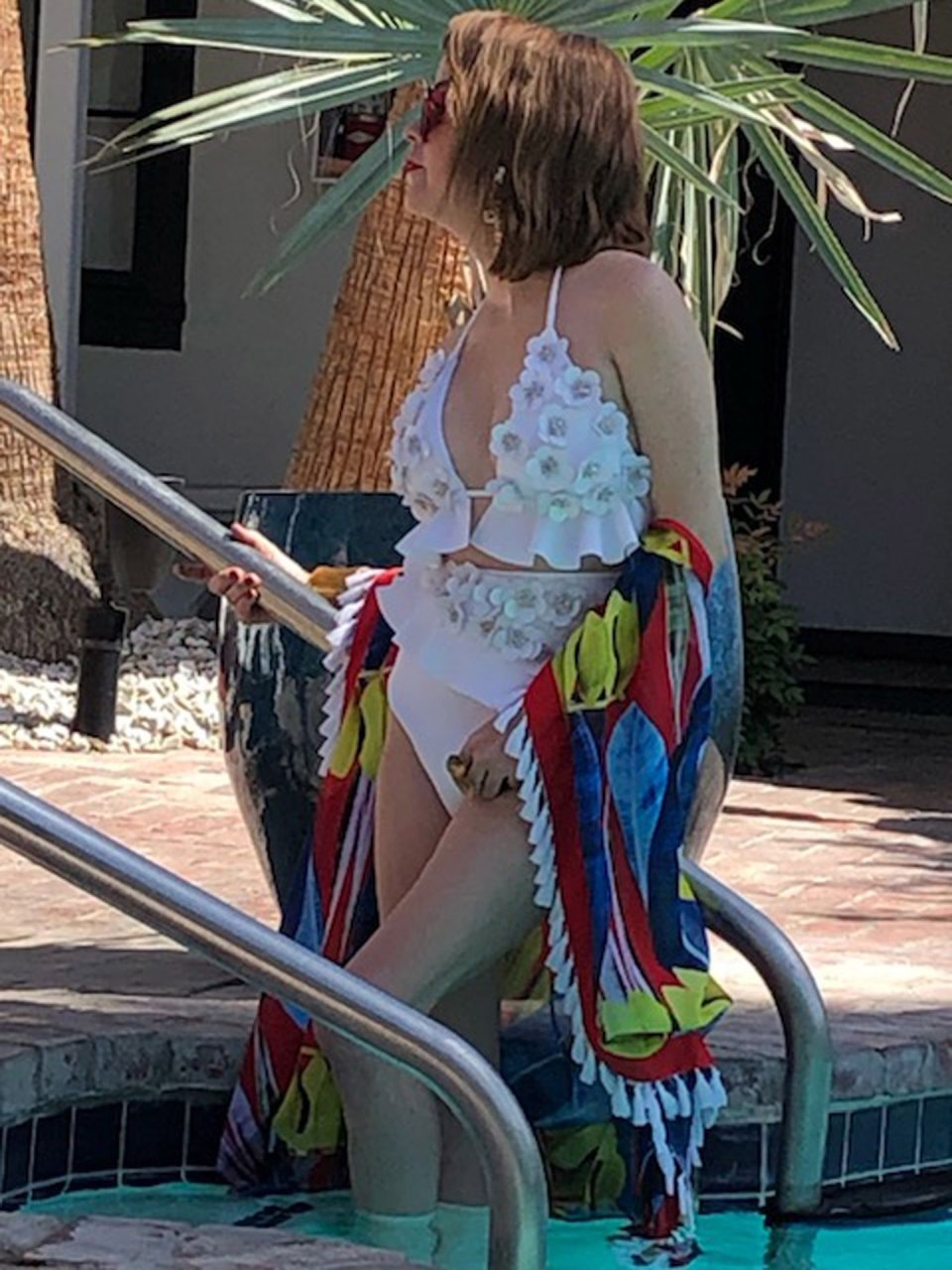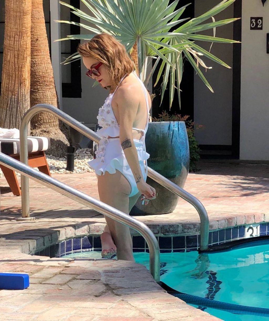 Звезда сериала “Оранжевый — хит сезона”, Тэрин Мэннинг демонстрирует своё тело в винтажном белом купальнике во время мини-фотосессии с друзьями у бассейна в Палм-Спрингс, 18.05.2019.