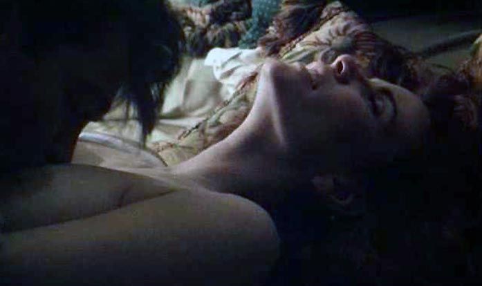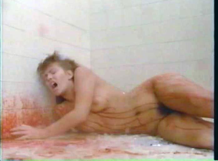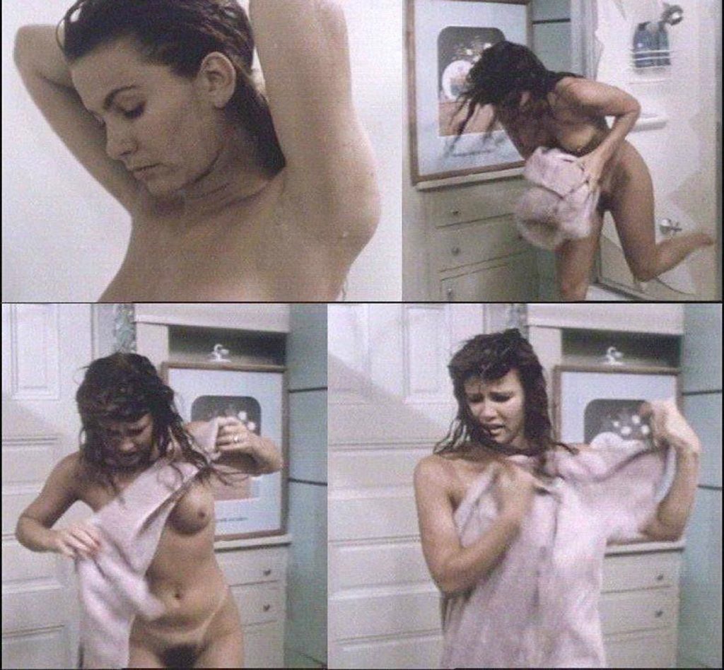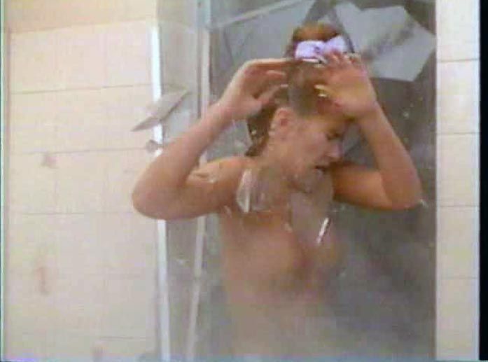 The next scene is from a movie called ‘Witchboard’. As she attempts to turn off the water in the bathroom, Tawny Kitaen is seen nude from above. She immediately smashes the mirror and emerges from the tub wholly clothed, exposing her breasts and bush before wrapping herself in a towel. She then exposes some cleavage when banging against a closed door and squatting next to it while looking for a robe at the foot of a bunk.
