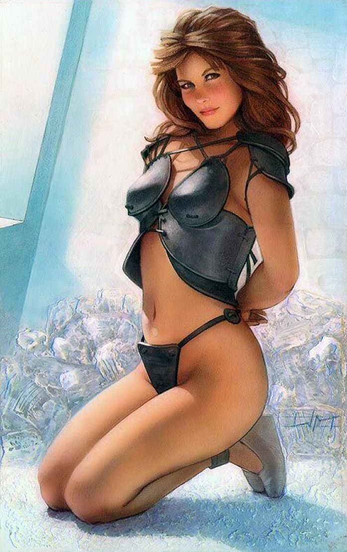 She and Zab make their escape. Tawny (with the longer hair) shows some distant boobs and a hunk of thongage.