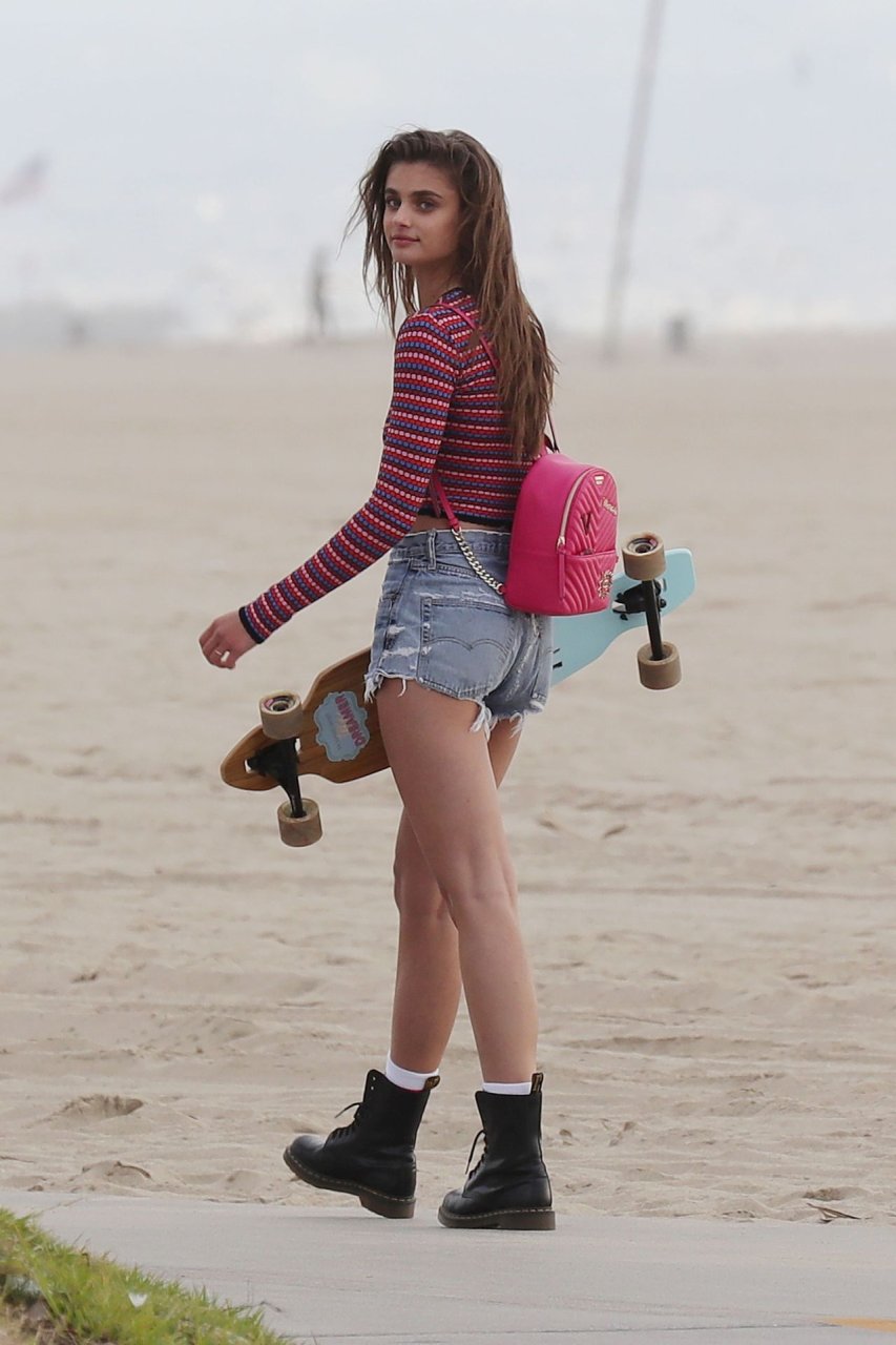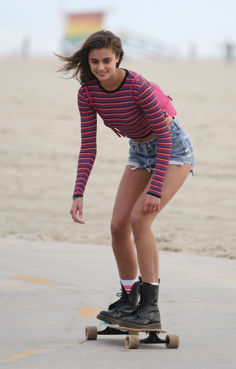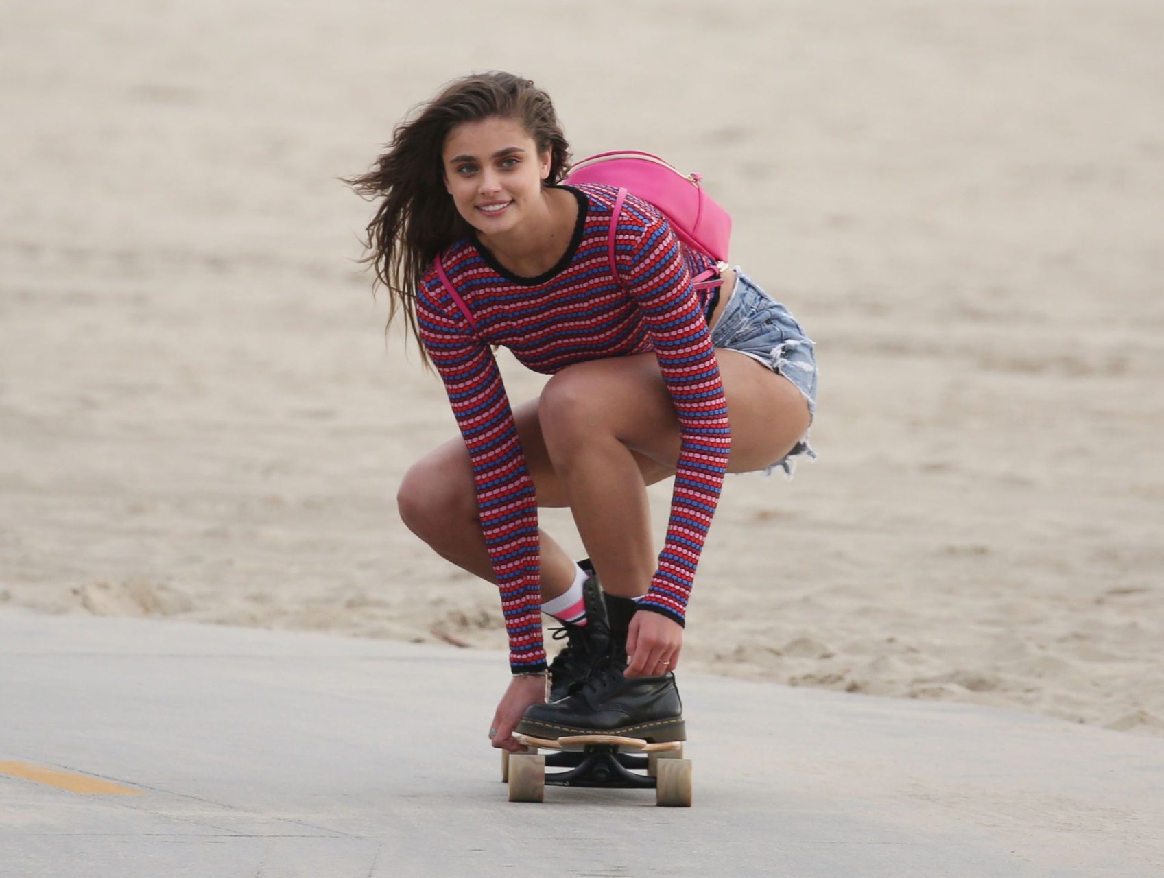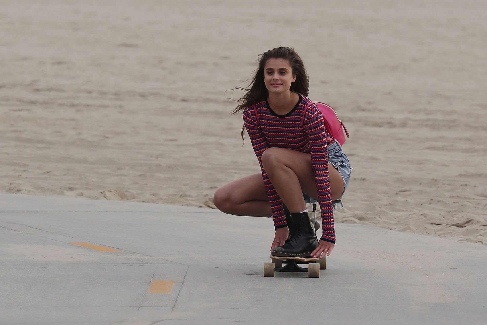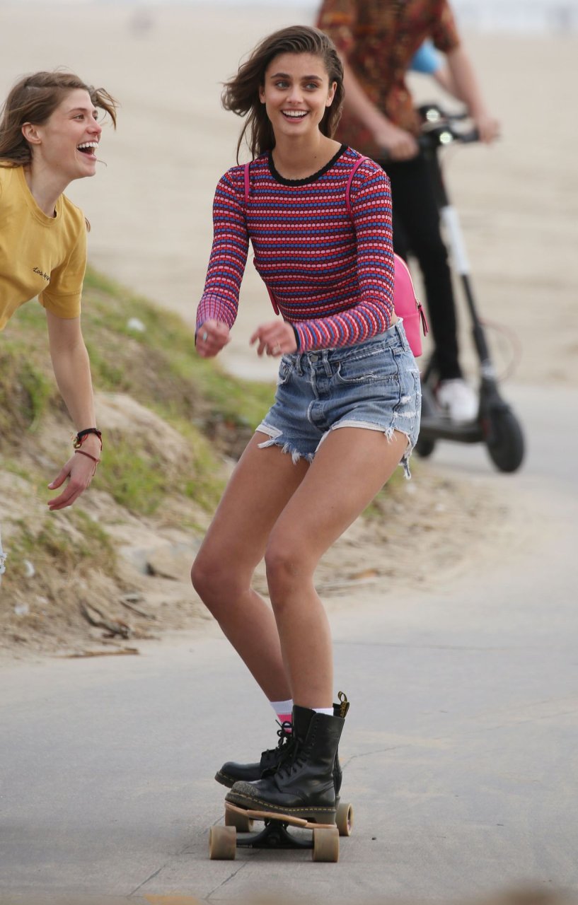 Модель Тейлор Мари Хилл позирует в купальнике с высоким вырезом и коротких шортах Daisy Dukes в образе скейтбордистки на фотосессии Victoria’s Secret на пляже Венеция. Лос-Анджелес, 01/10/2019.
