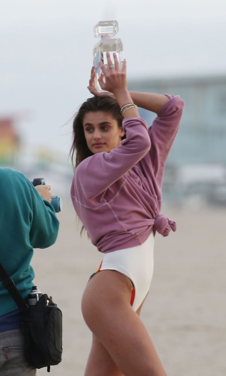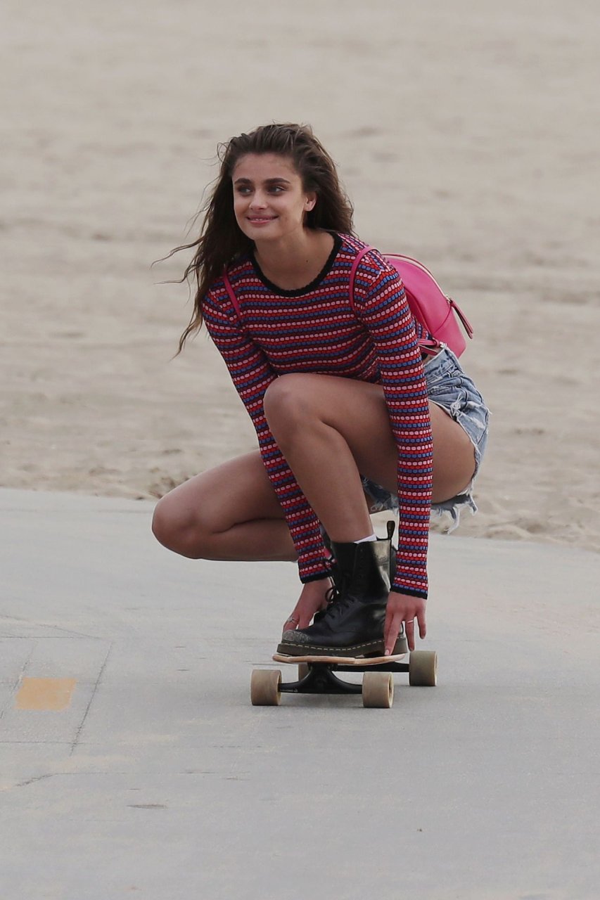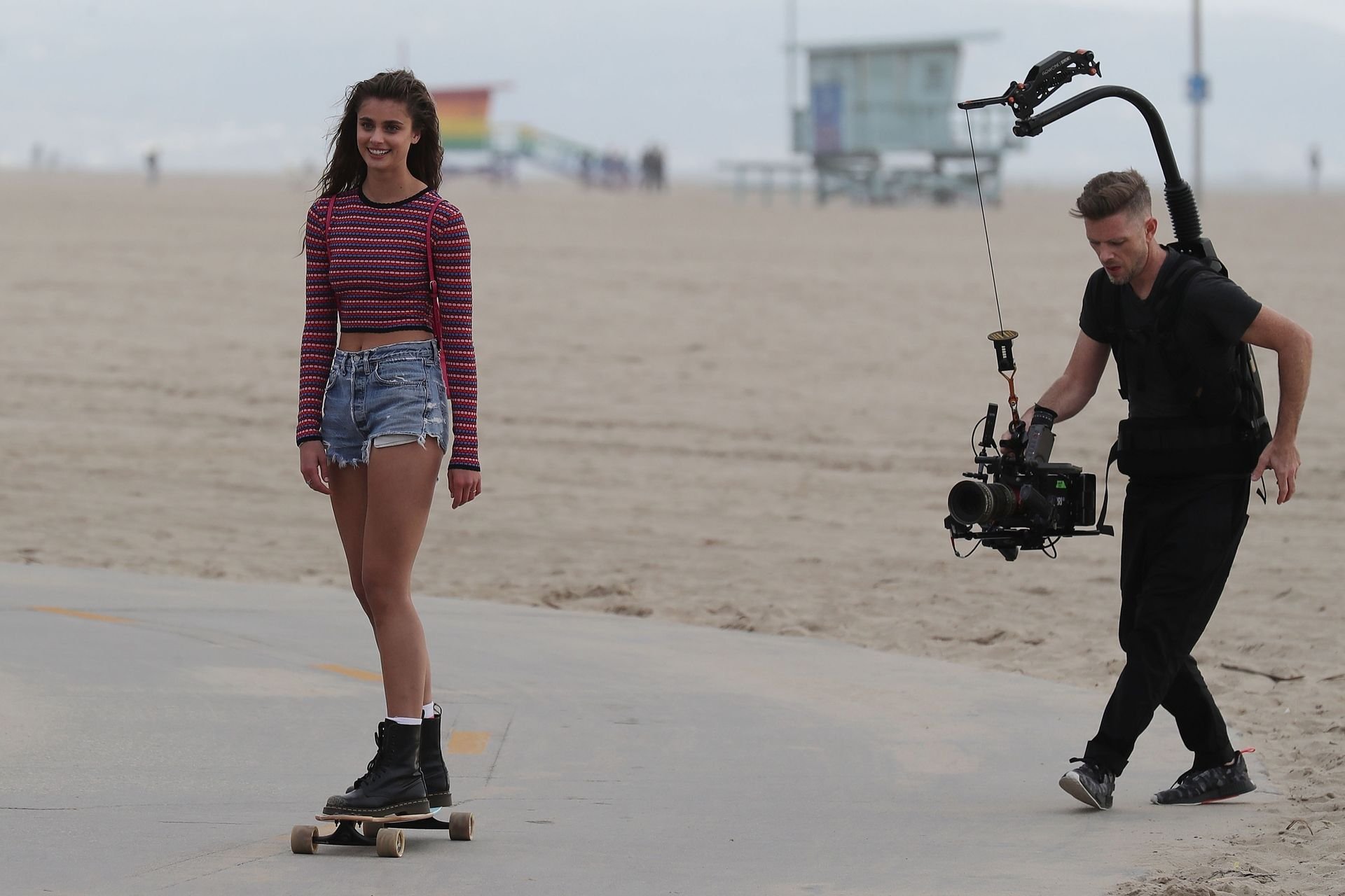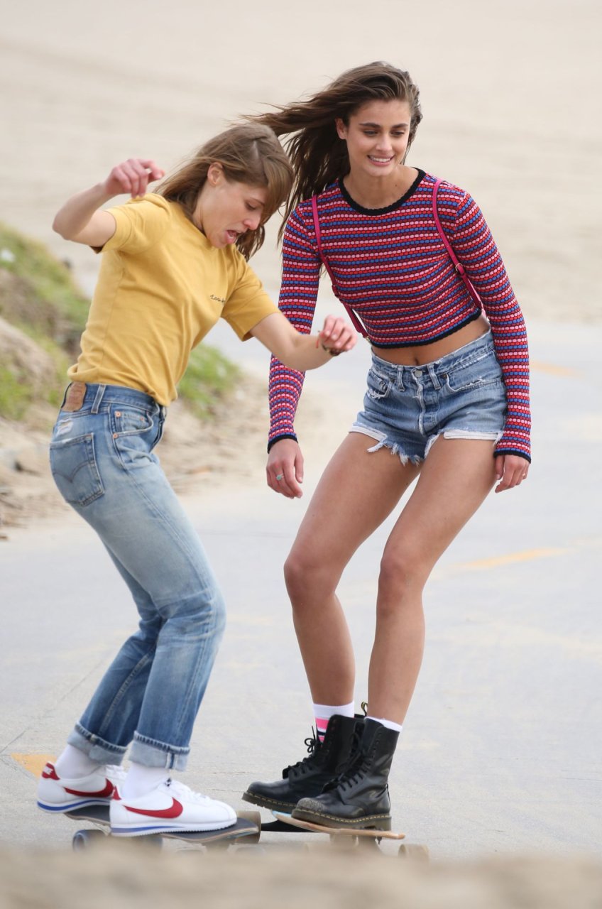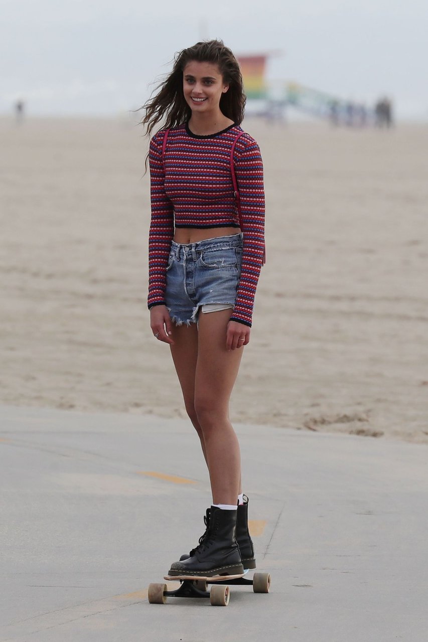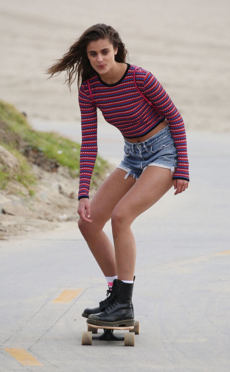 Модель Тейлор Мари Хилл позирует в купальнике с высоким вырезом и коротких шортах Daisy Dukes в образе скейтбордистки на фотосессии Victoria’s Secret на пляже Венеция. Лос-Анджелес, 01/10/2019.