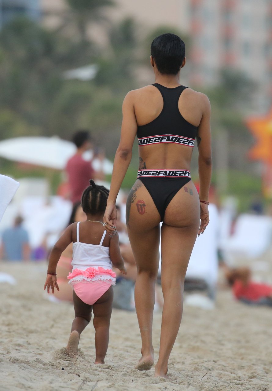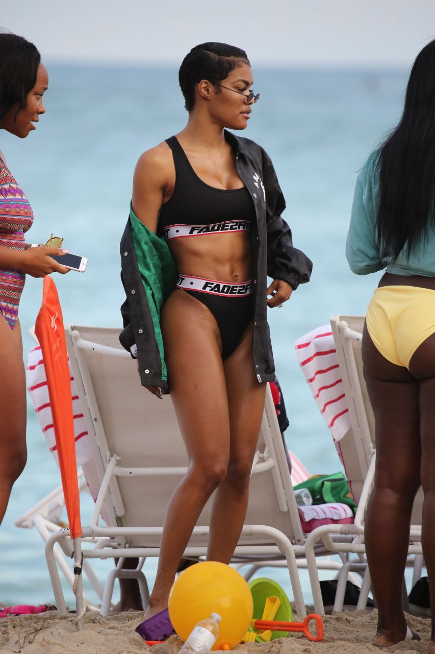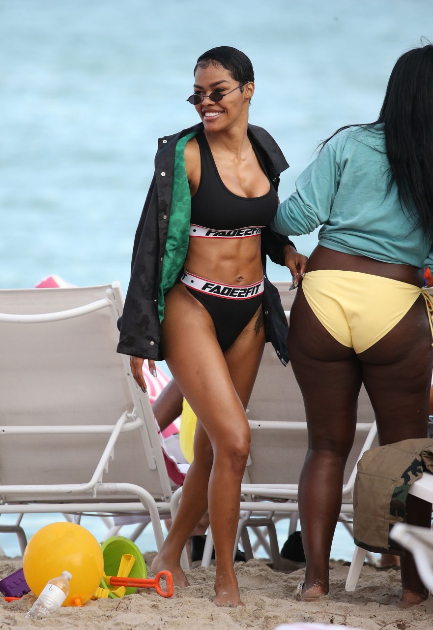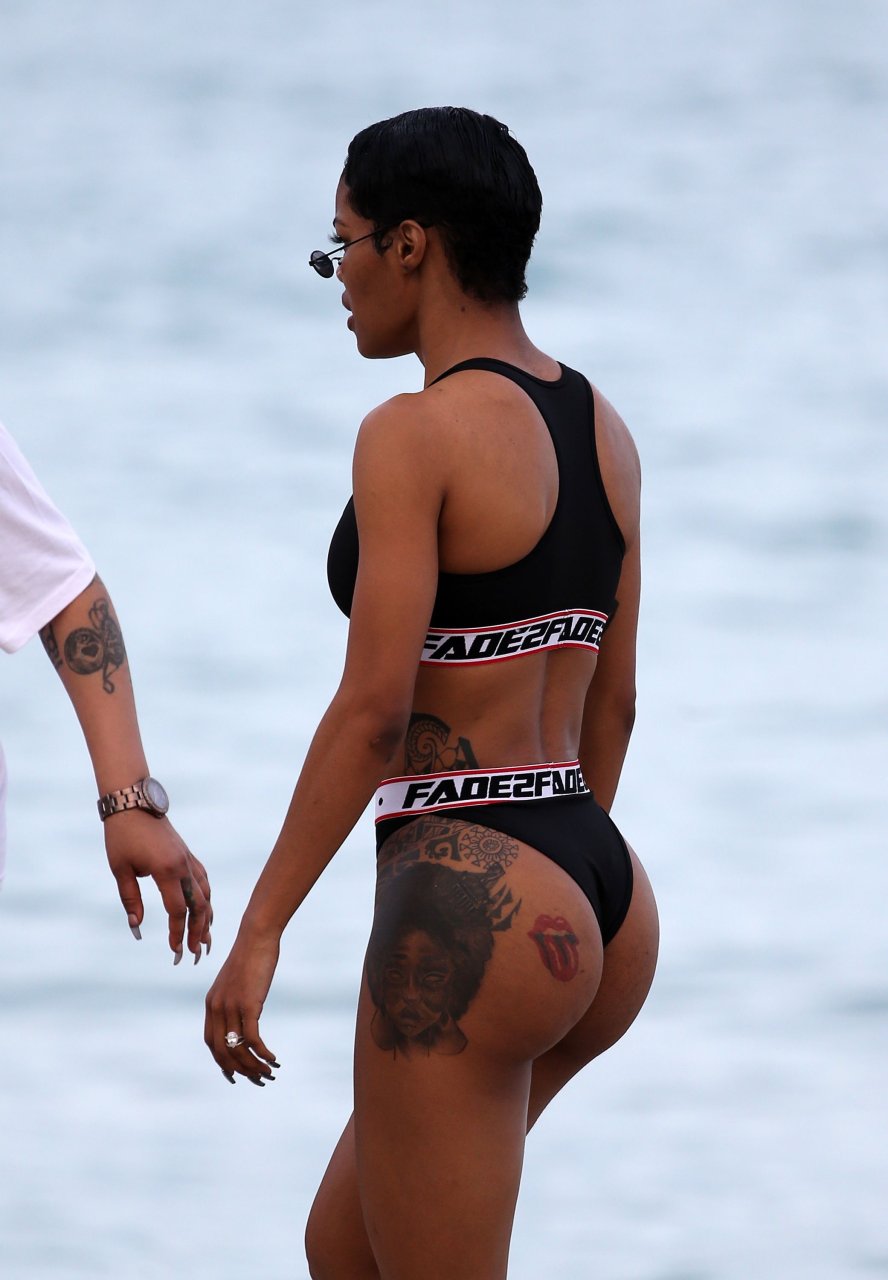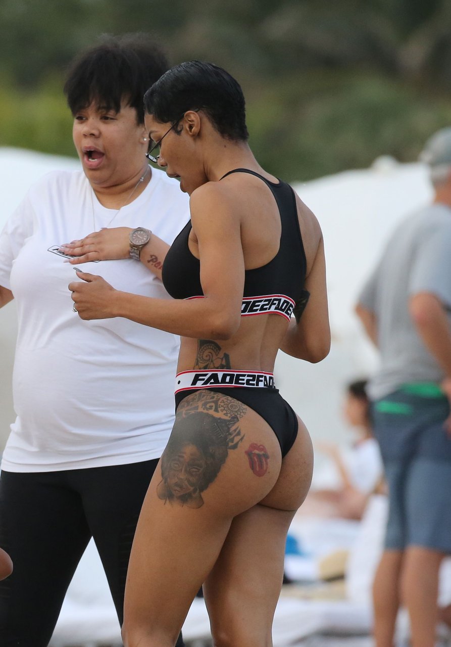 Teyana Taylor демонстрирует свои пресс и изгибы, выходя на пляж в черном бикини на пляже в Майами, 01/01/2018. Teyana Taylor — певица и актриса (Honey 4). Возраст: 27.