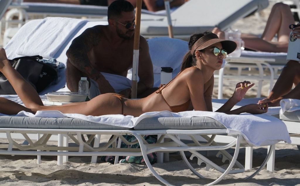 Бразильская худощавая модель Таис Мартинс была замечена на пляже в Майами в бежевом бикини-стрингах, 05.03.2019.