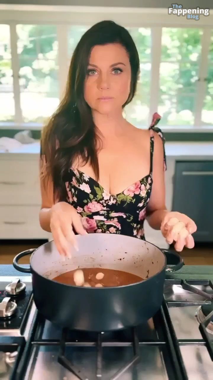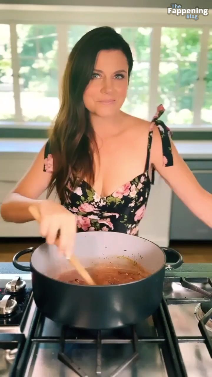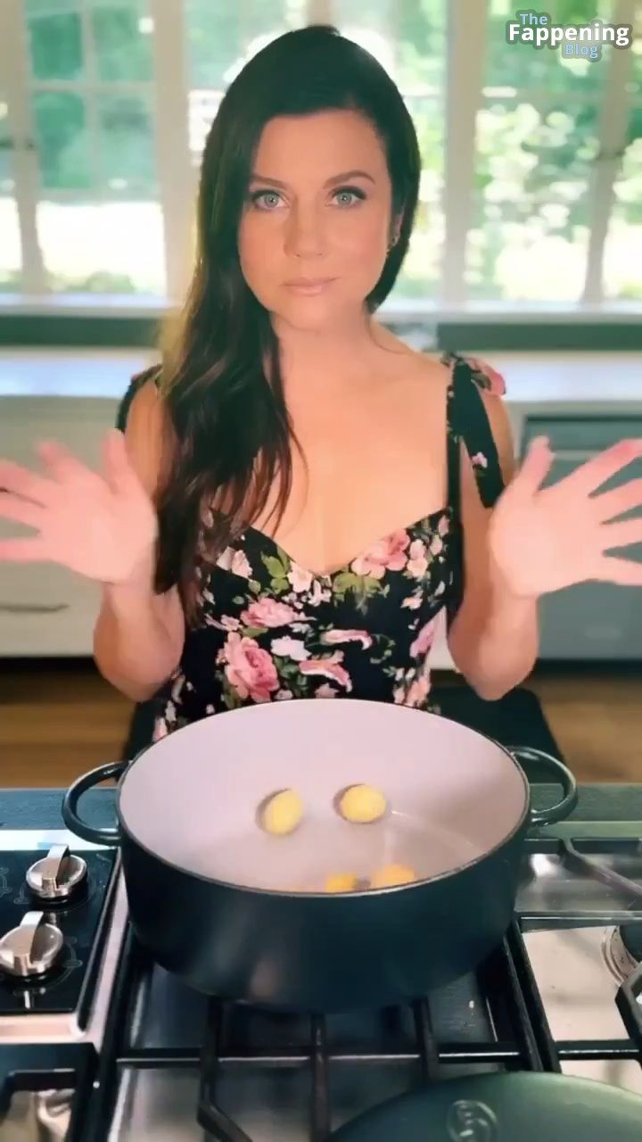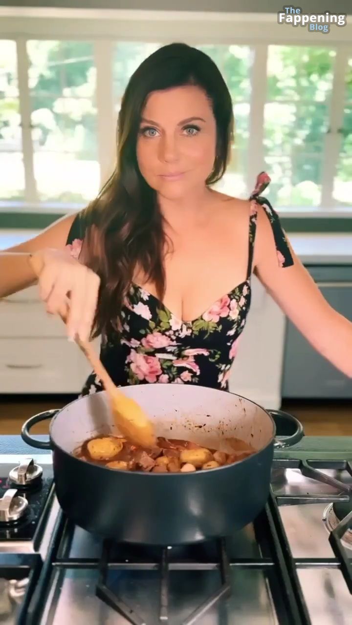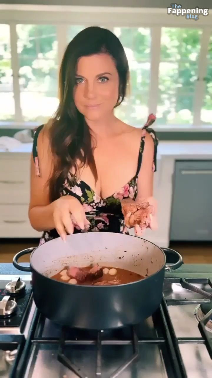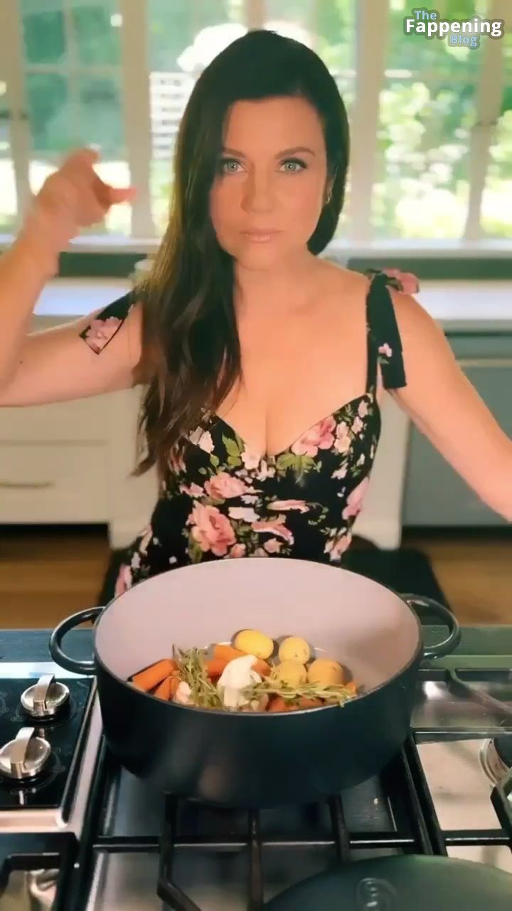 Фотографии и видео с Tiffani Thiessen демонстрируют её роскошное декольте в обтягивающем платье с глубоким вырезом, пока она занимается готовкой на своей кухне, показывая свои кулинарные навыки.