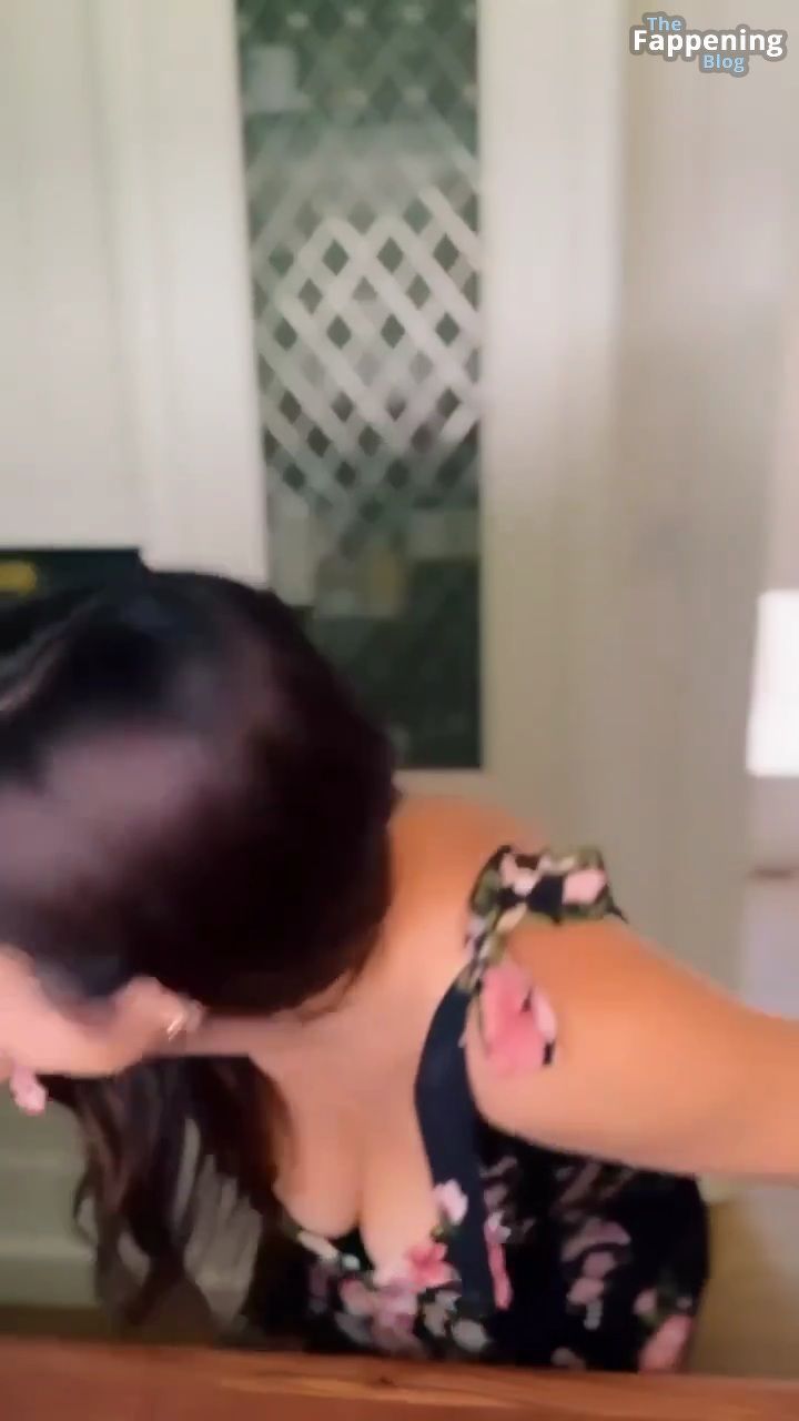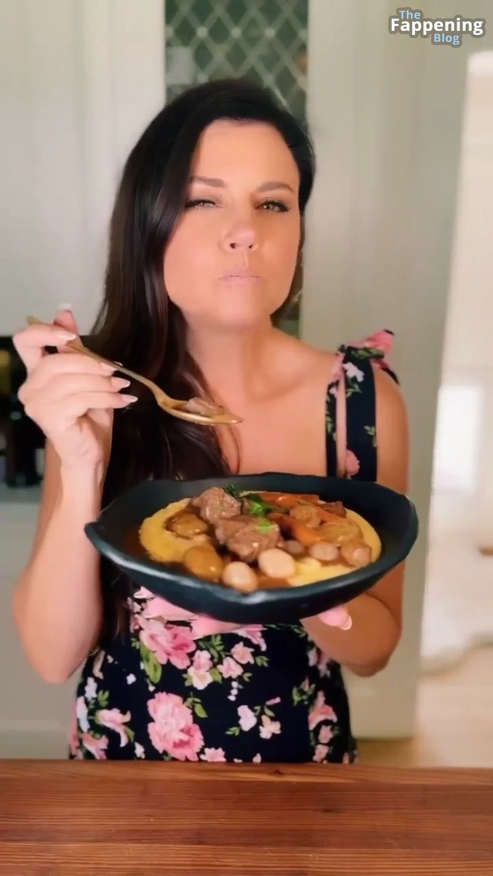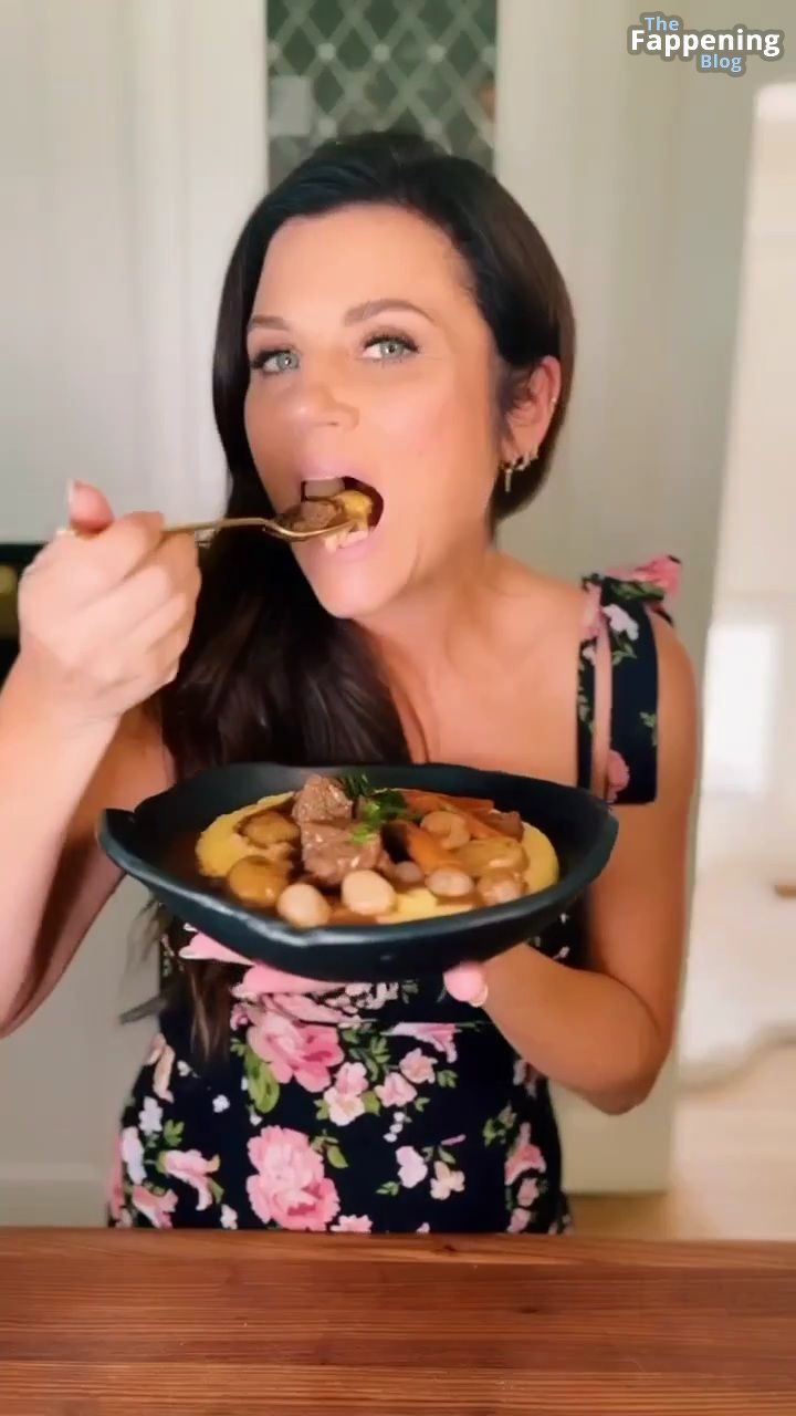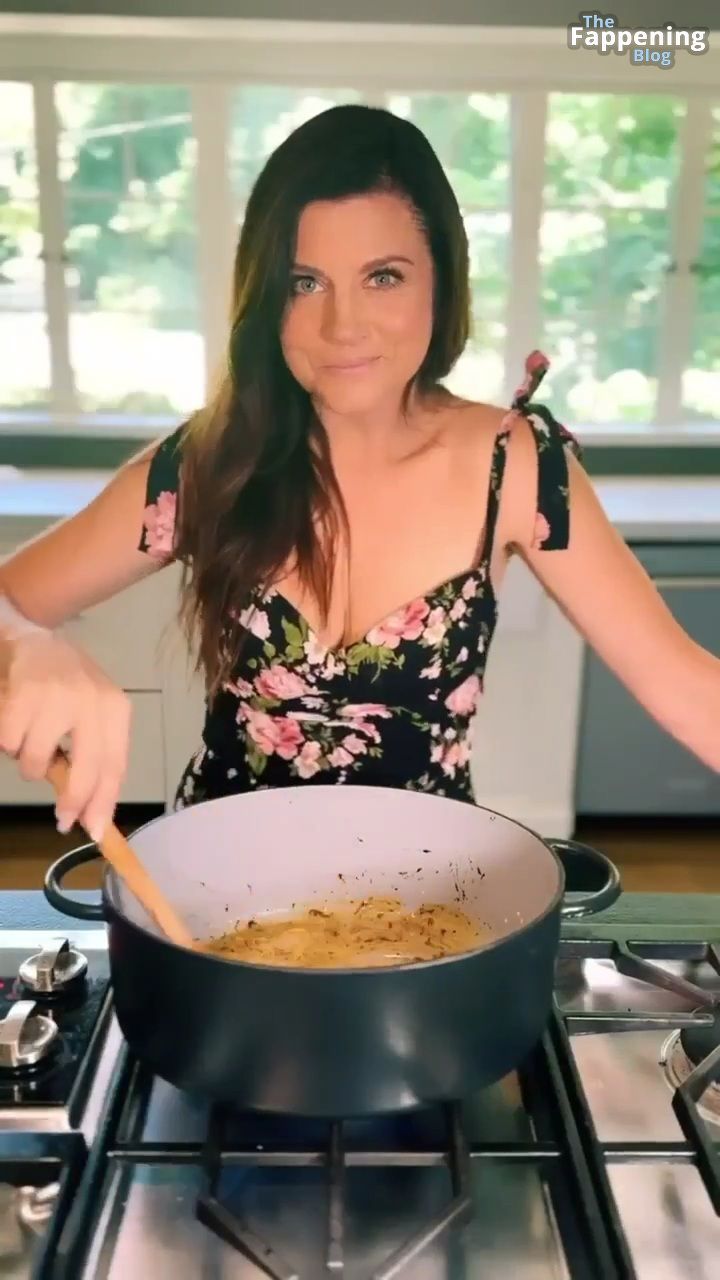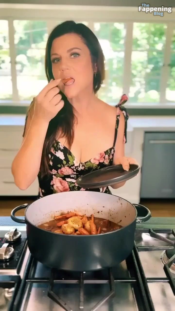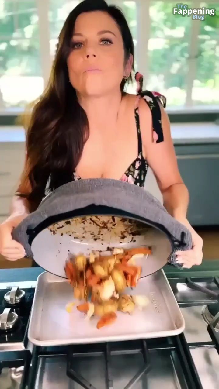 Фотографии и видео с Tiffani Thiessen демонстрируют её роскошное декольте в обтягивающем платье с глубоким вырезом, пока она занимается готовкой на своей кухне, показывая свои кулинарные навыки.