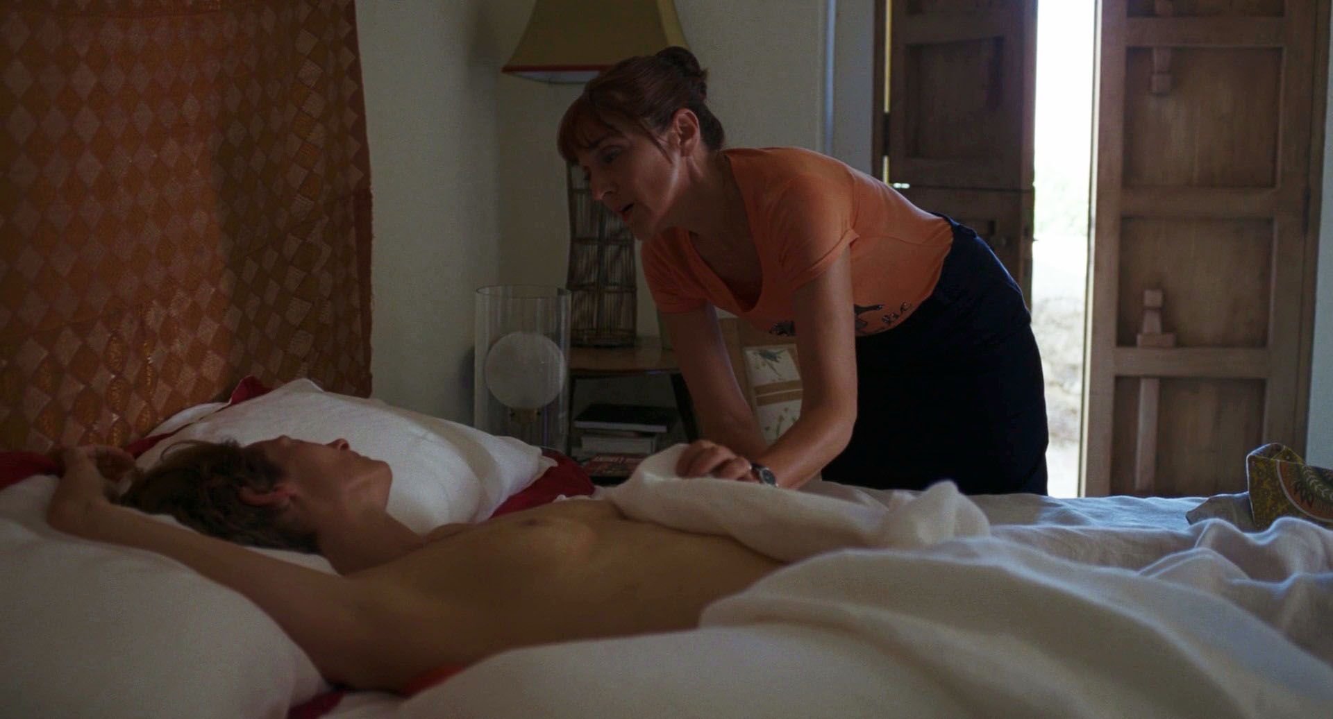 Тильда Суинтон (в роли Марианны) в кровати с опущенным покрывалом, показывающая грудь.