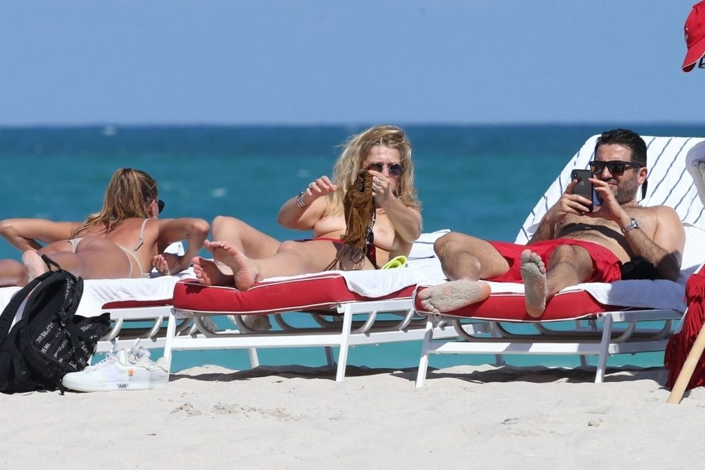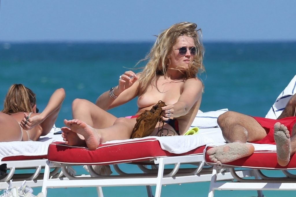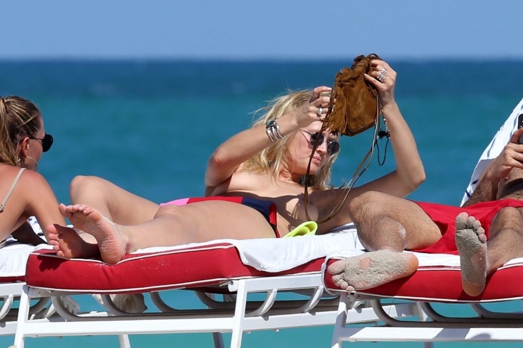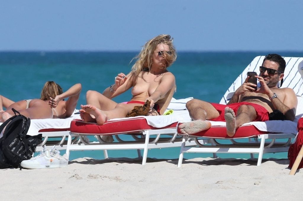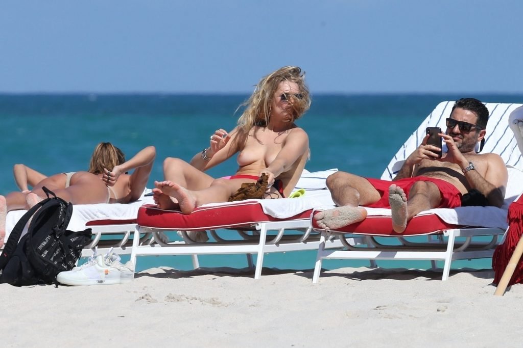 Модель и актриса Тони Гаррн отправилась на пляж с друзьями, чтобы позагорать в пасхальные выходные в Майами, 01.04.2018. Тони решила снять верхнюю часть купальника на день, выставив напоказ свою обнаженную грудь. Возможно, Тони просто не хочет иметь загар с линиями.