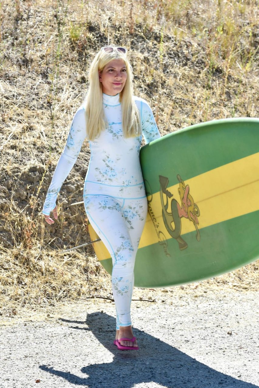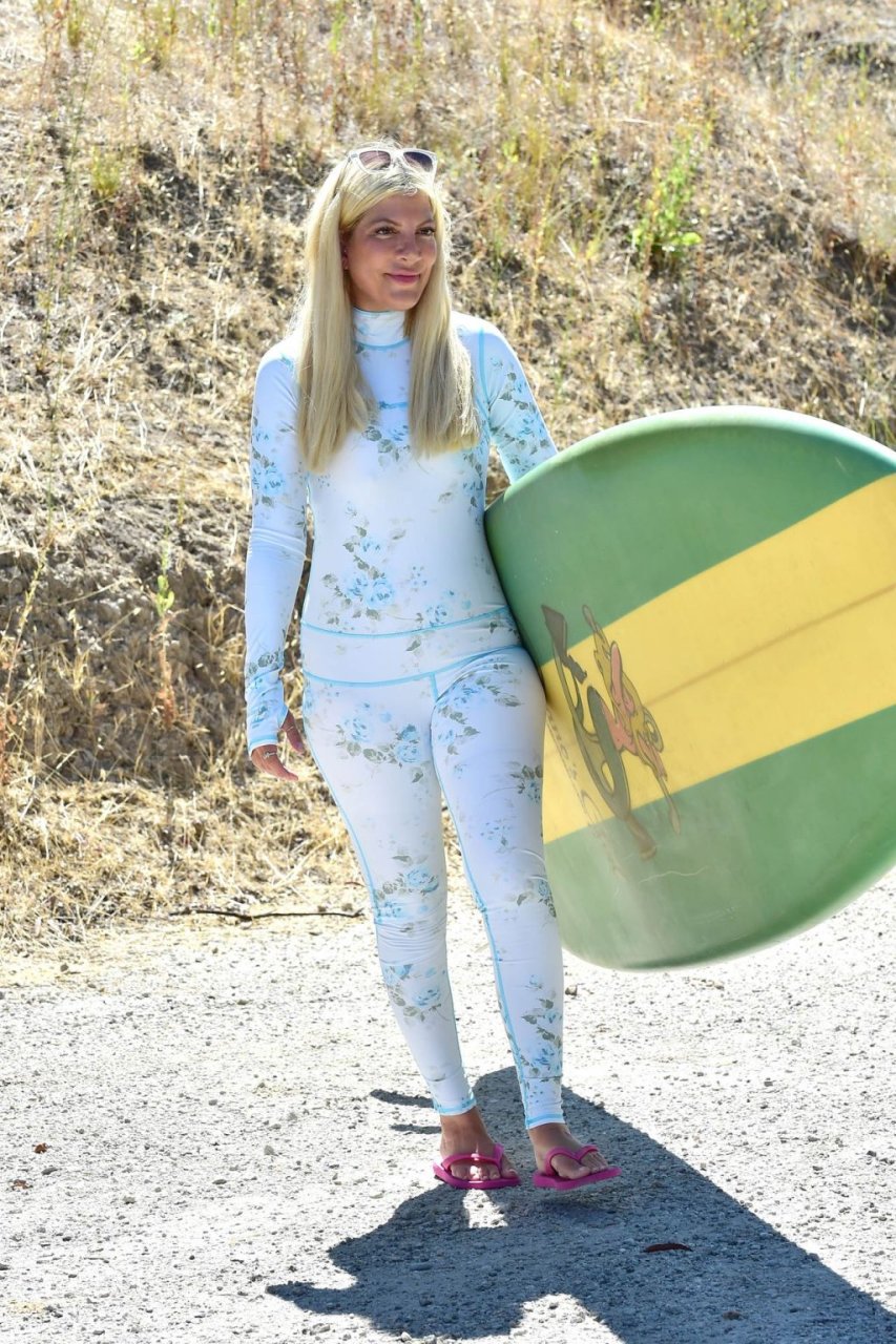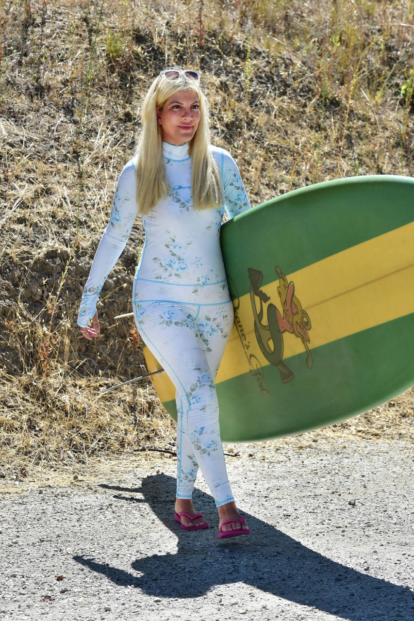 Тори Спеллинг была сфотографирована по пути на урок серфинга в Малибу, 17.09.2019. На вопрос, что она носит, она рассказала нашему фотографу, что это линия купальников от её подруги по актёрскому цеху Сары Бакстон, которая снималась в шоу отца Спеллинг, “Закатный пляж”.