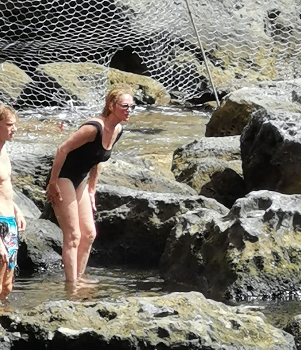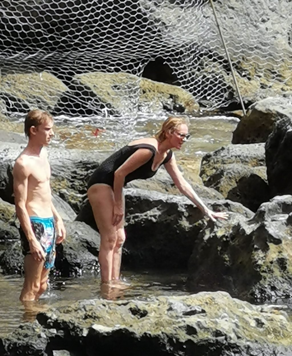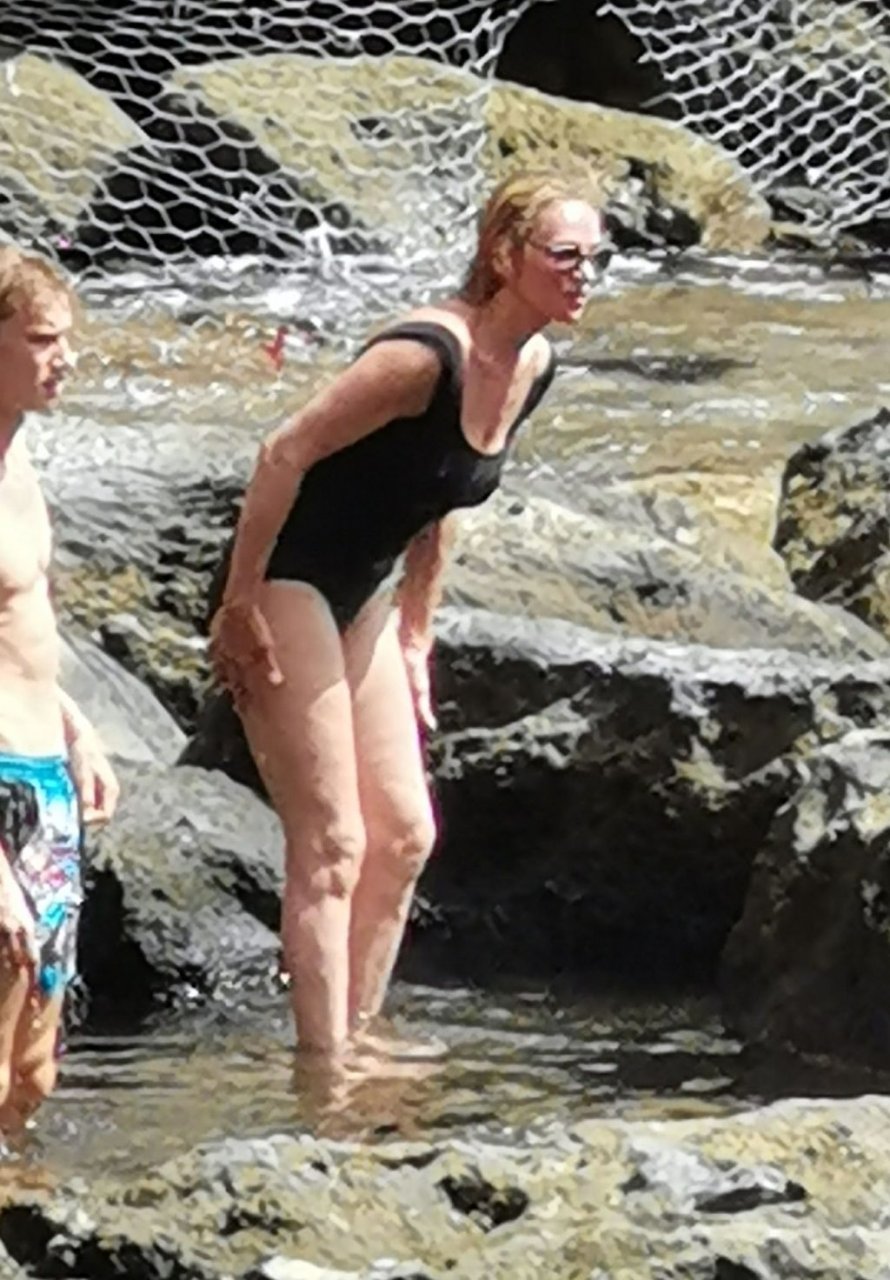 Американская актриса и модель Ума Турман была сфотографирована в черном купальнике, когда осматривала соленые бассейны со своим сыном во время отпуска на Искье, 16.06.2019.