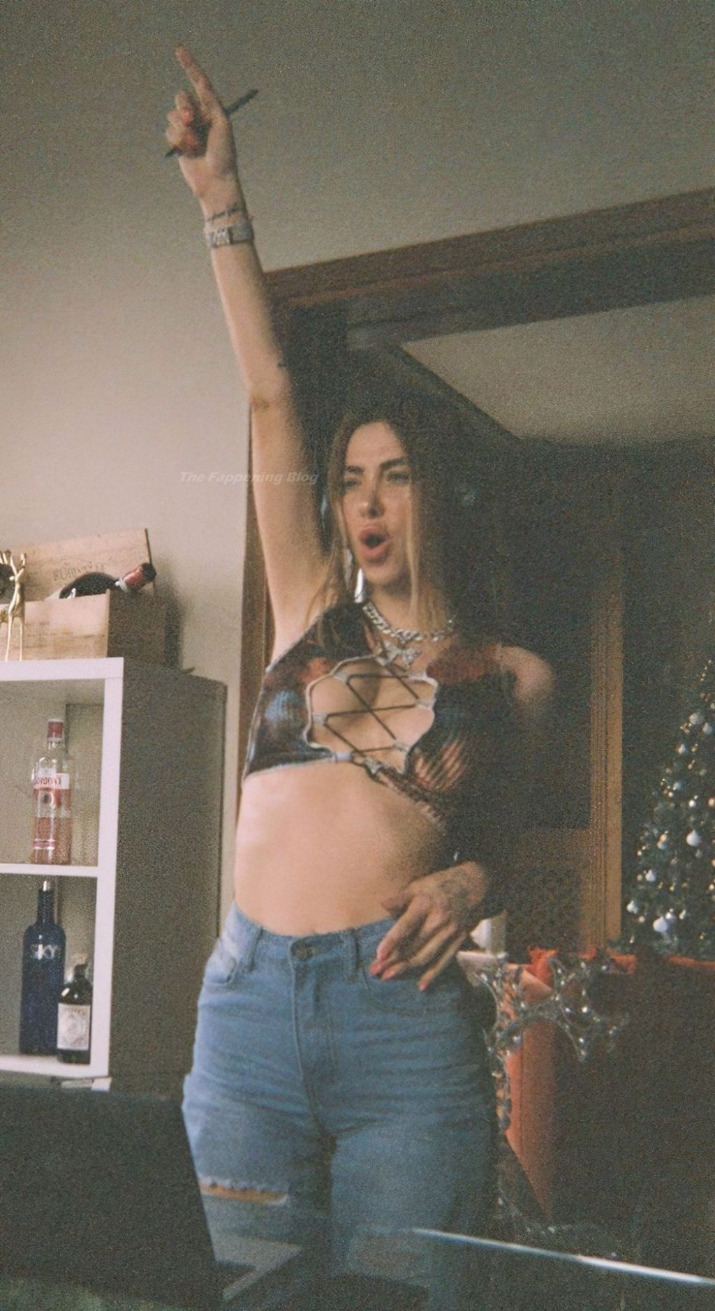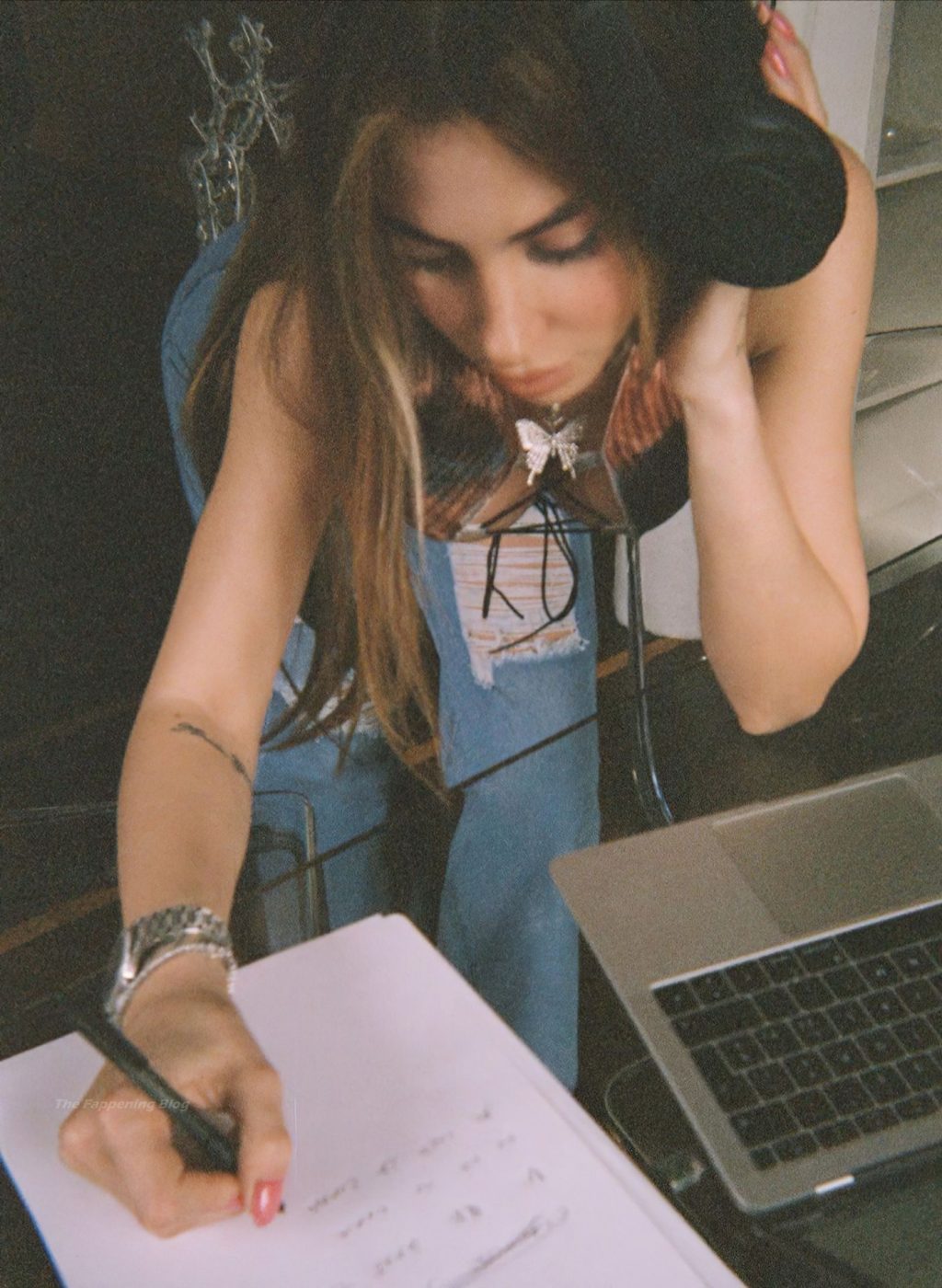 Модель Валентина Фрадеграда работает над чем-то важным на своем MacBook, демонстрируя свои красивые искусственные груди, в откровенном топе на новой фотосессии для социальных сетей, 03/09/2021.
