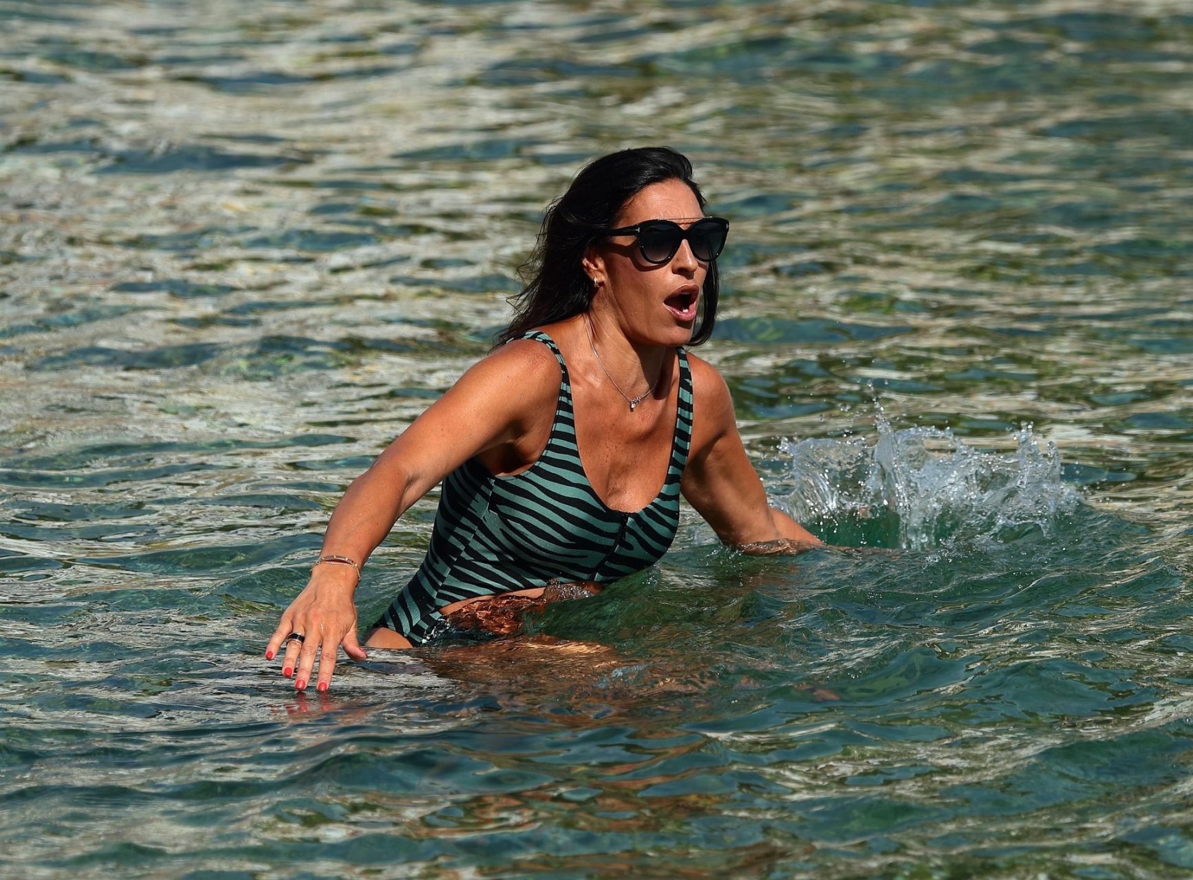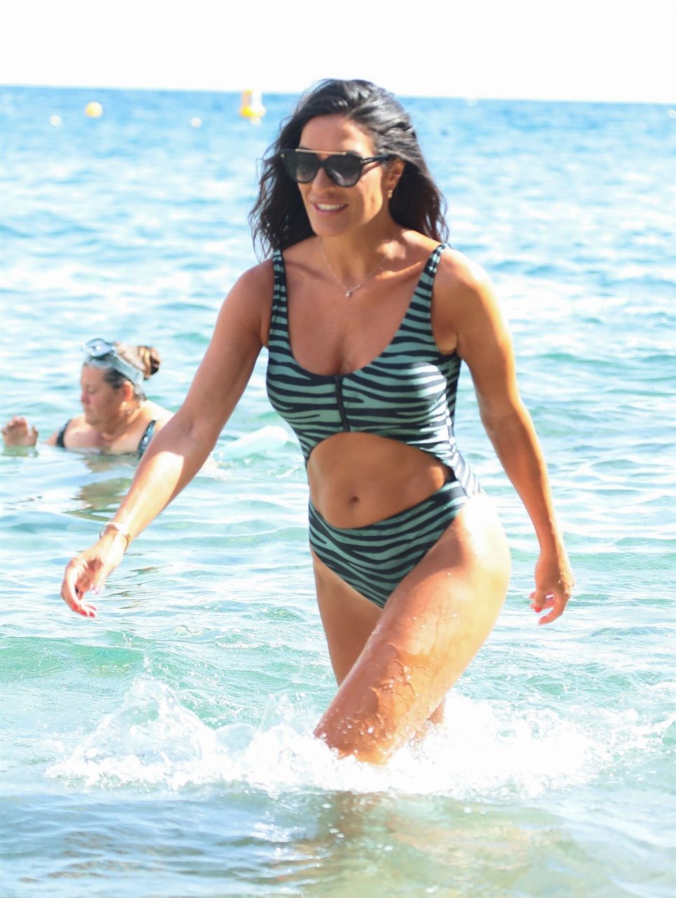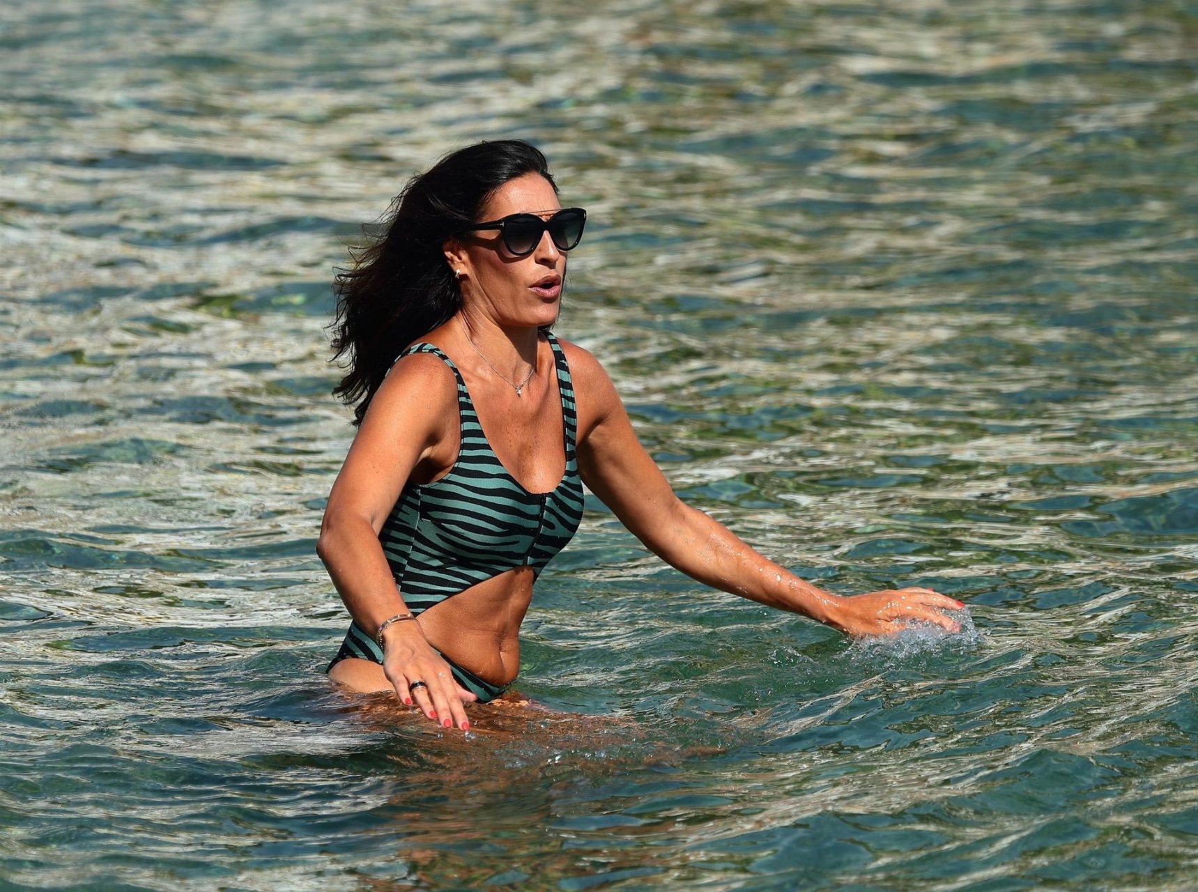 Бывшая Мисс Испания Вероника Идальго весело проводит время на отдыхе в Коста-Брава, Барселона, Испания, 13.08.2019. Испанская модель резвилась в теплых средиземноморских водах, демонстрируя свою фигуру в купальнике с животным принтом.