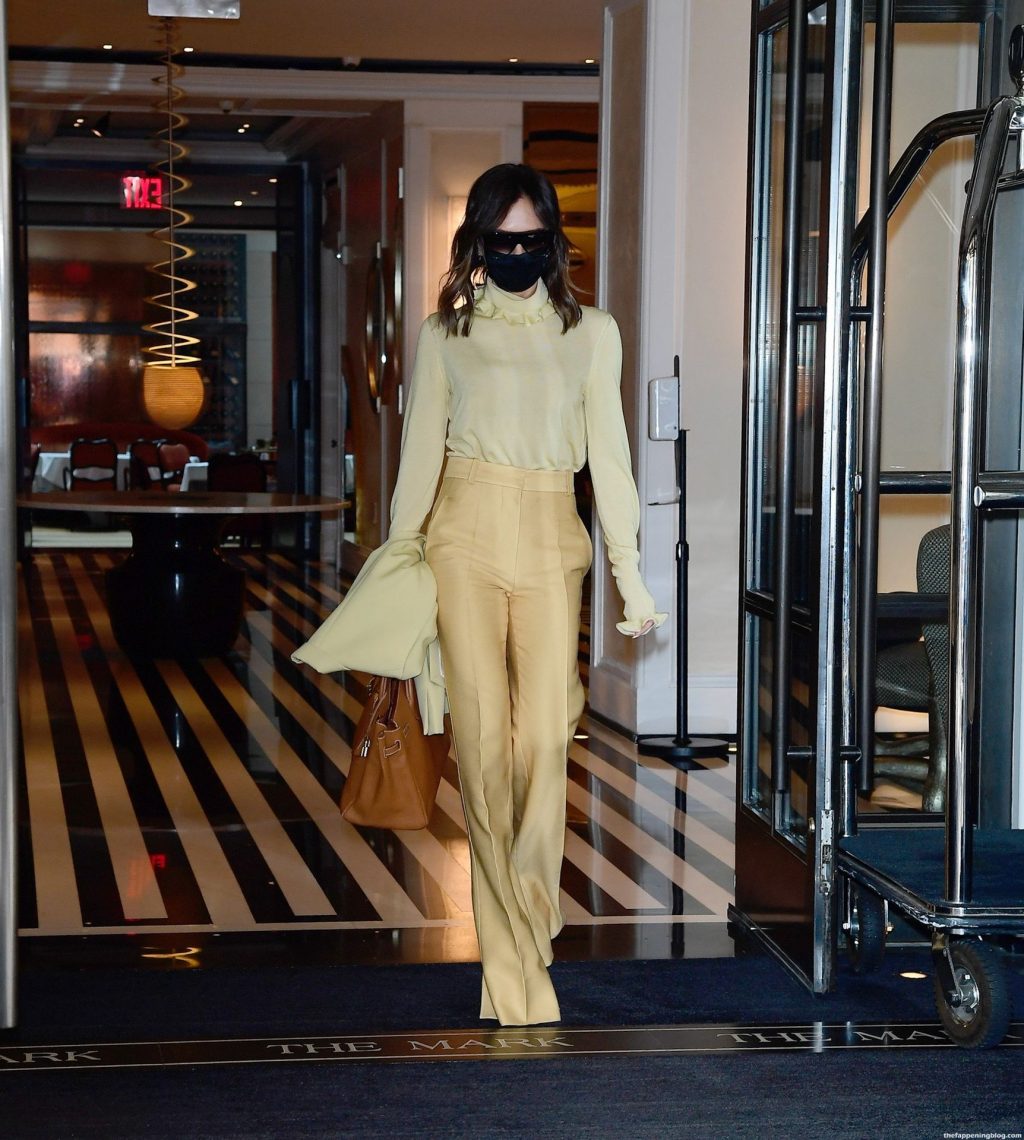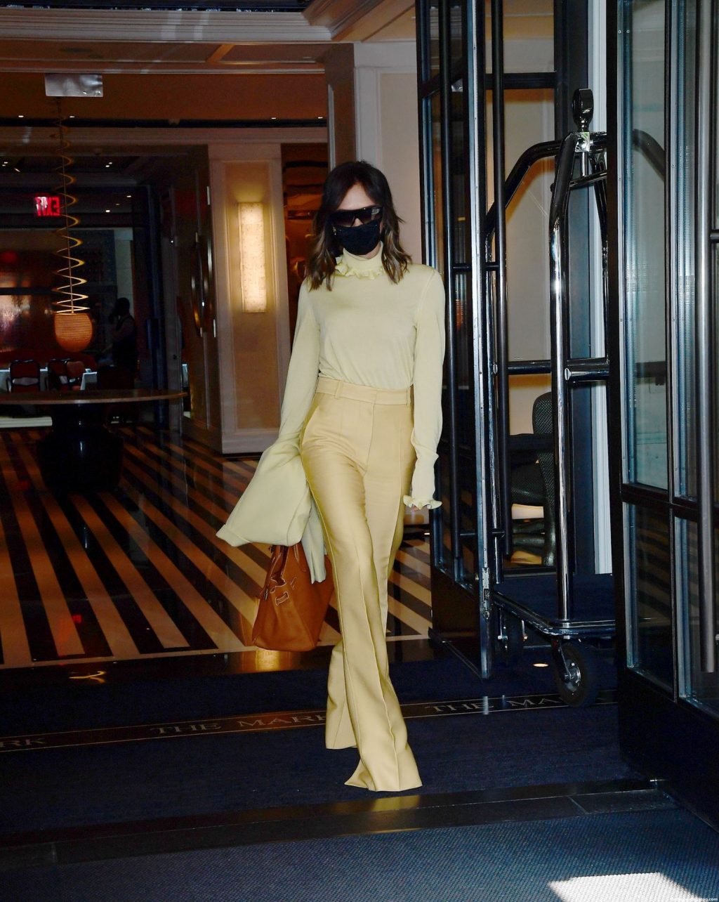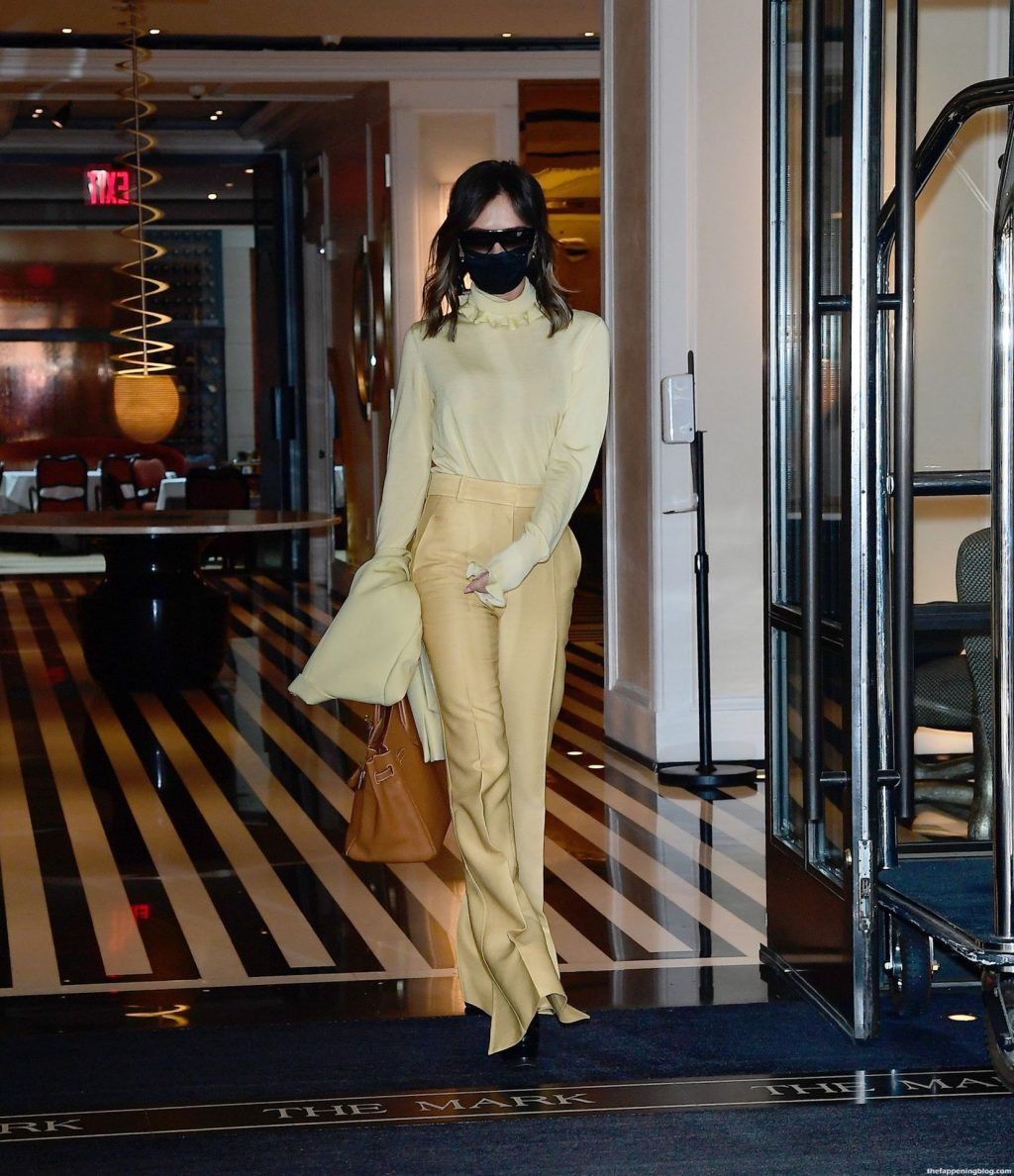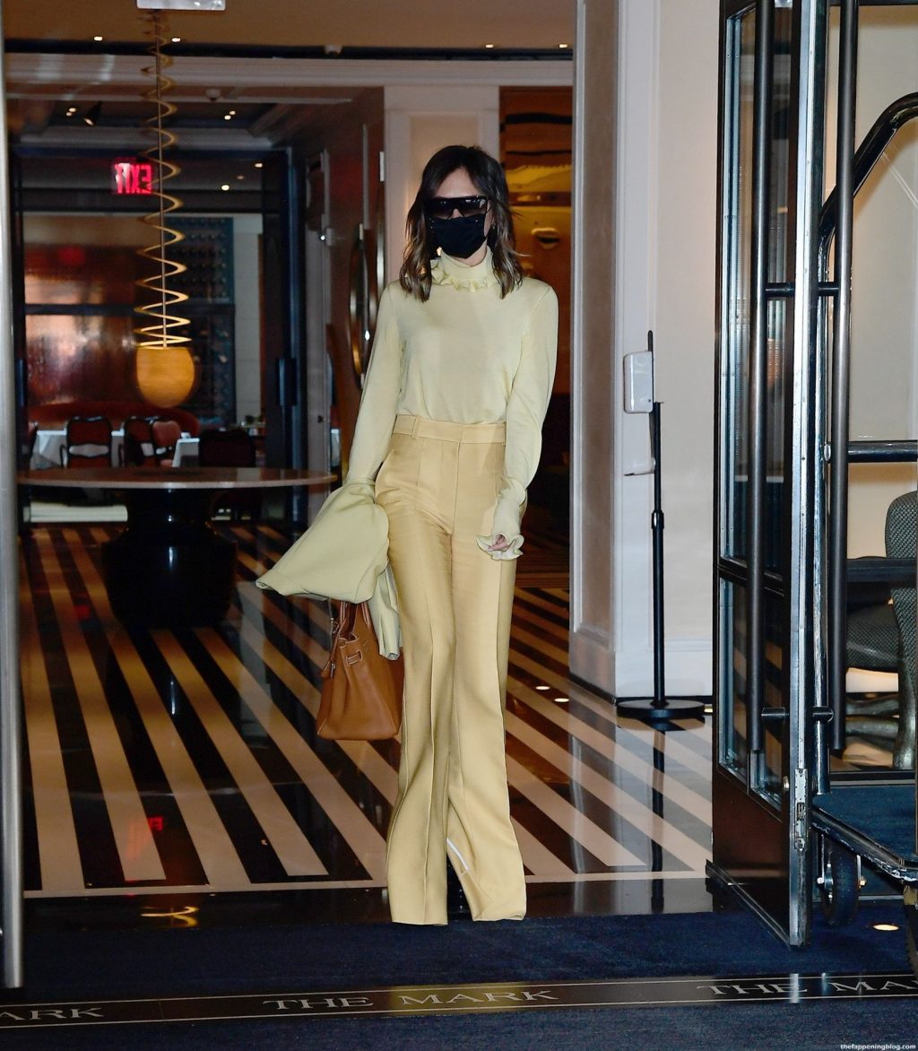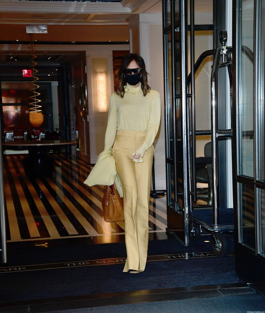 Британская поп-звезда и дизайнер моды была в черной маске для лица, желтой блузке, подходящих расклешенных брюках и туфлях на платформе.