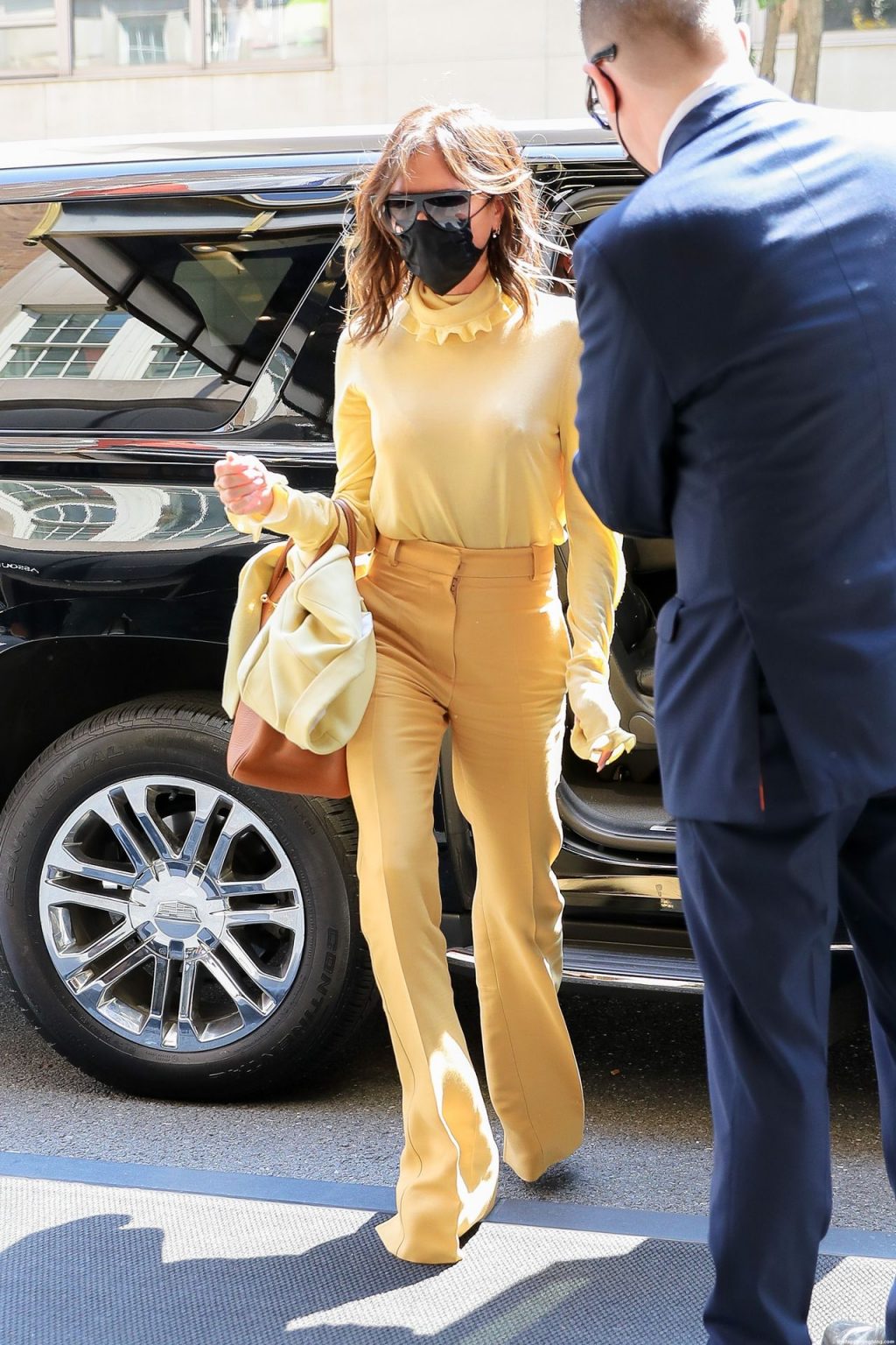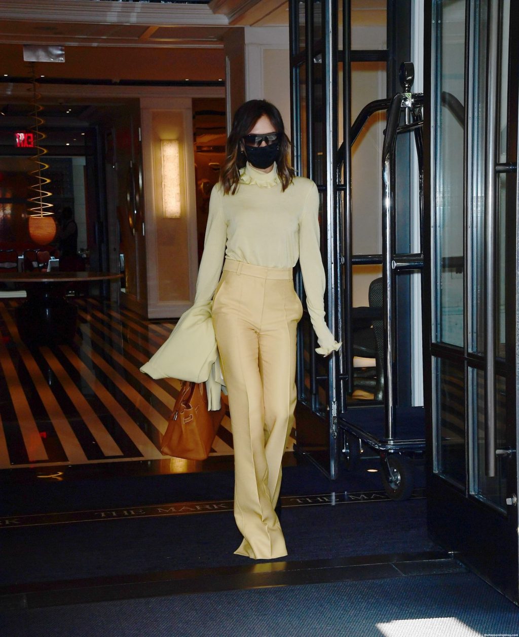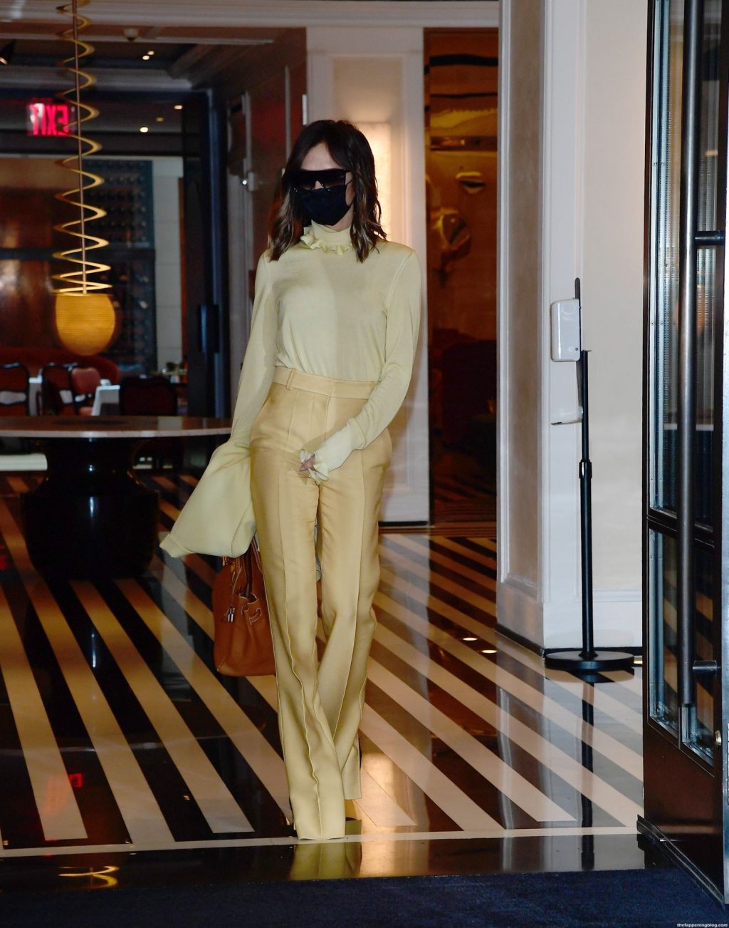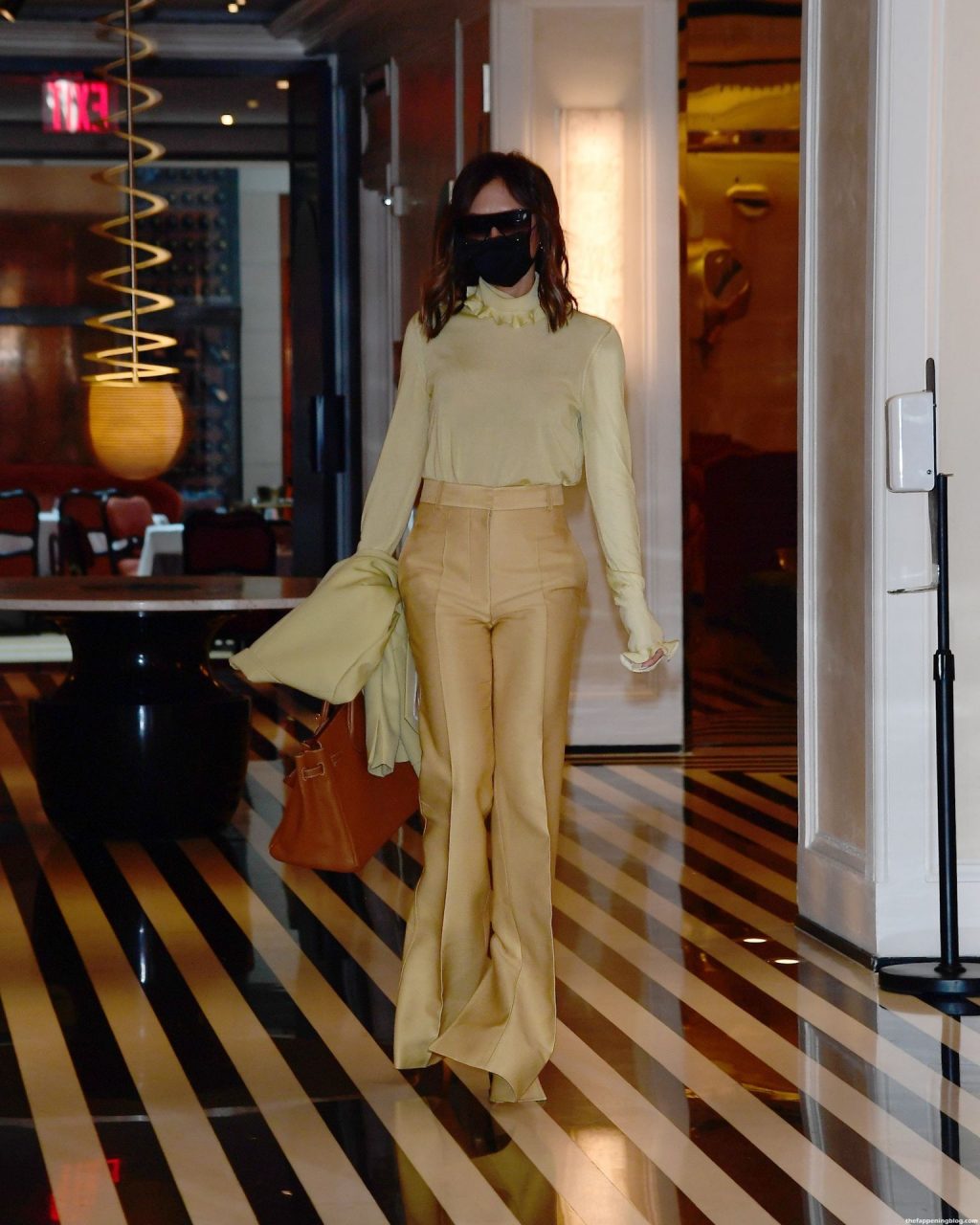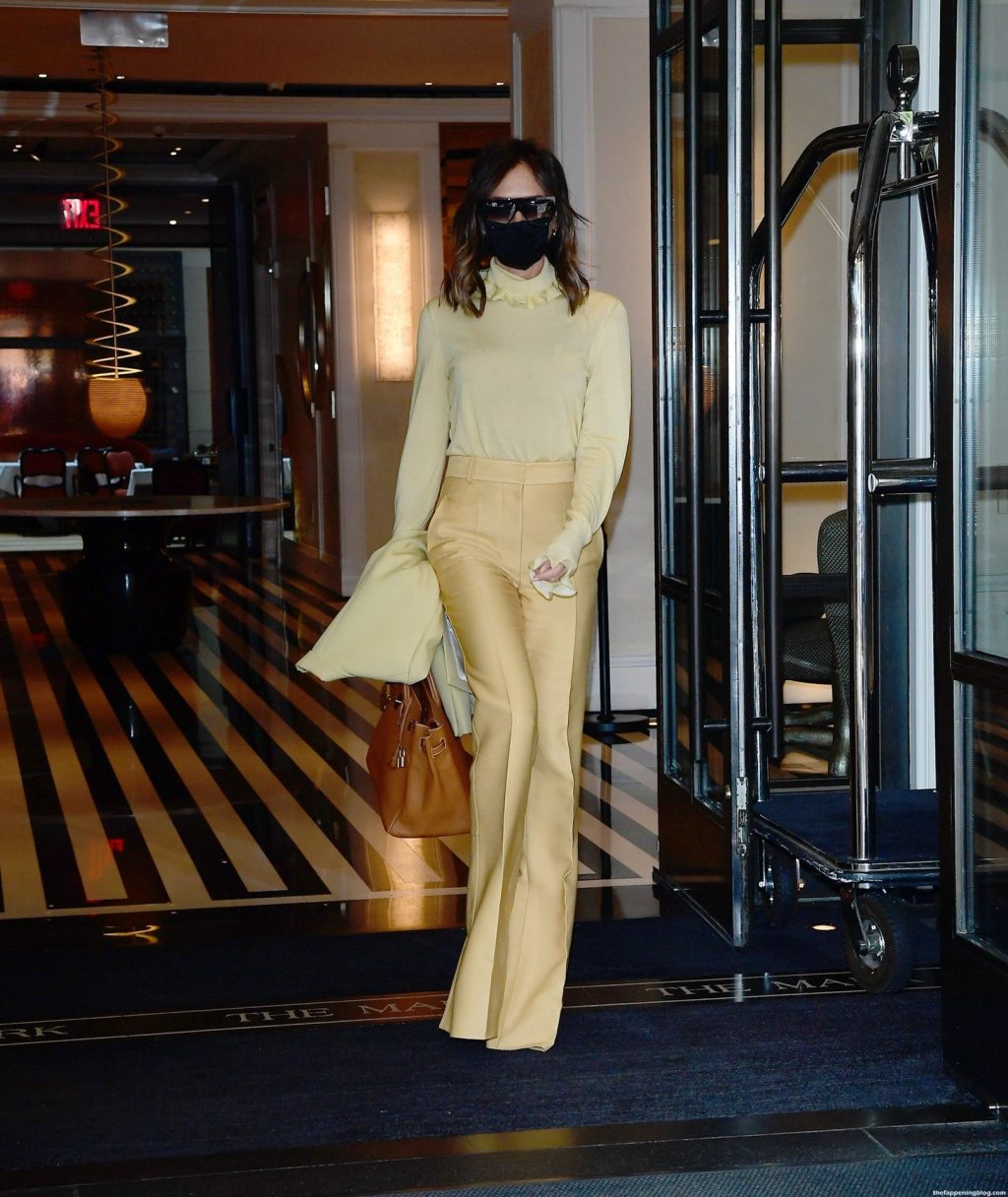 Британская поп-звезда и дизайнер моды была в черной маске для лица, желтой блузке, подходящих расклешенных брюках и туфлях на платформе.