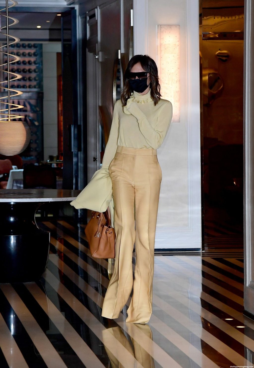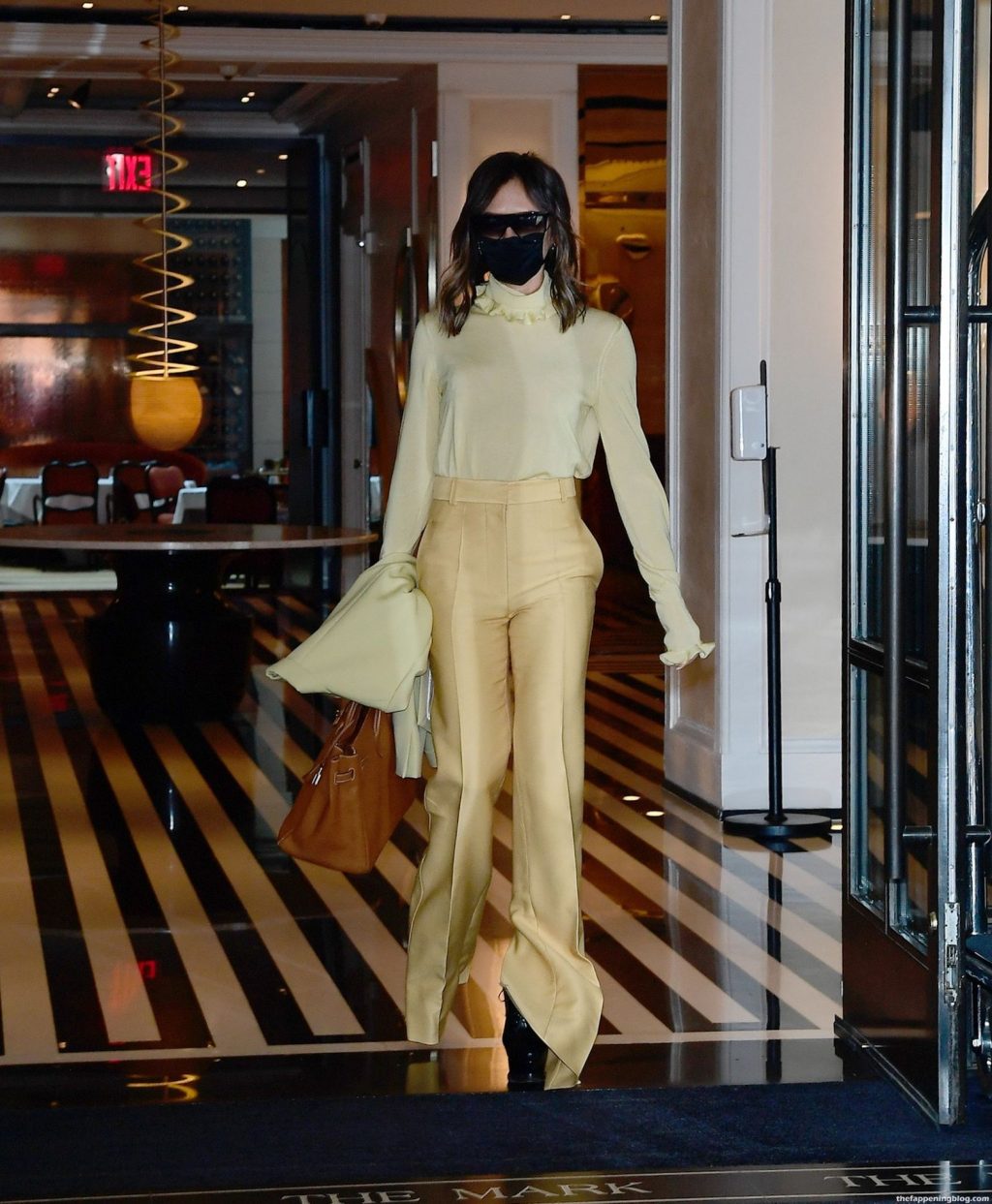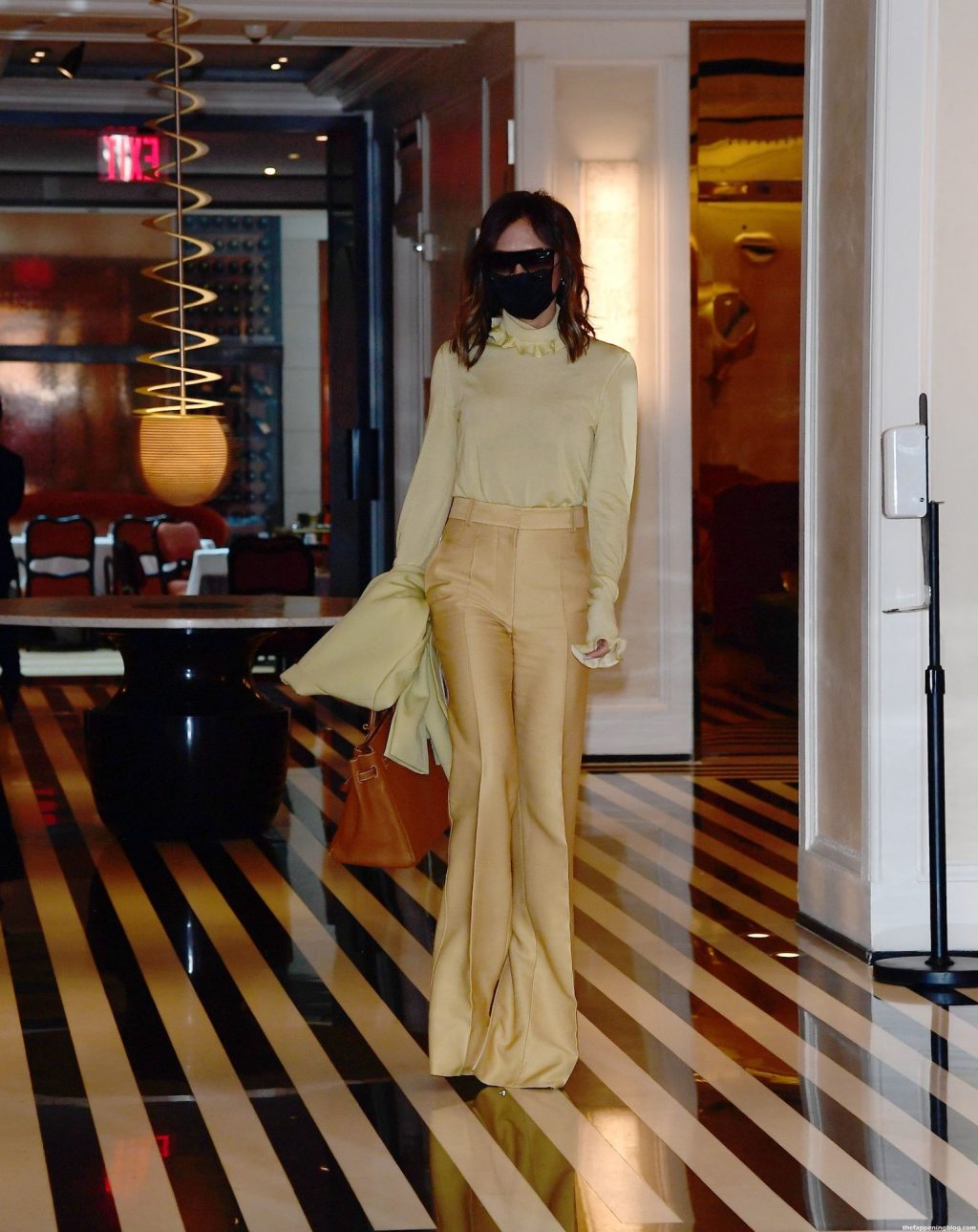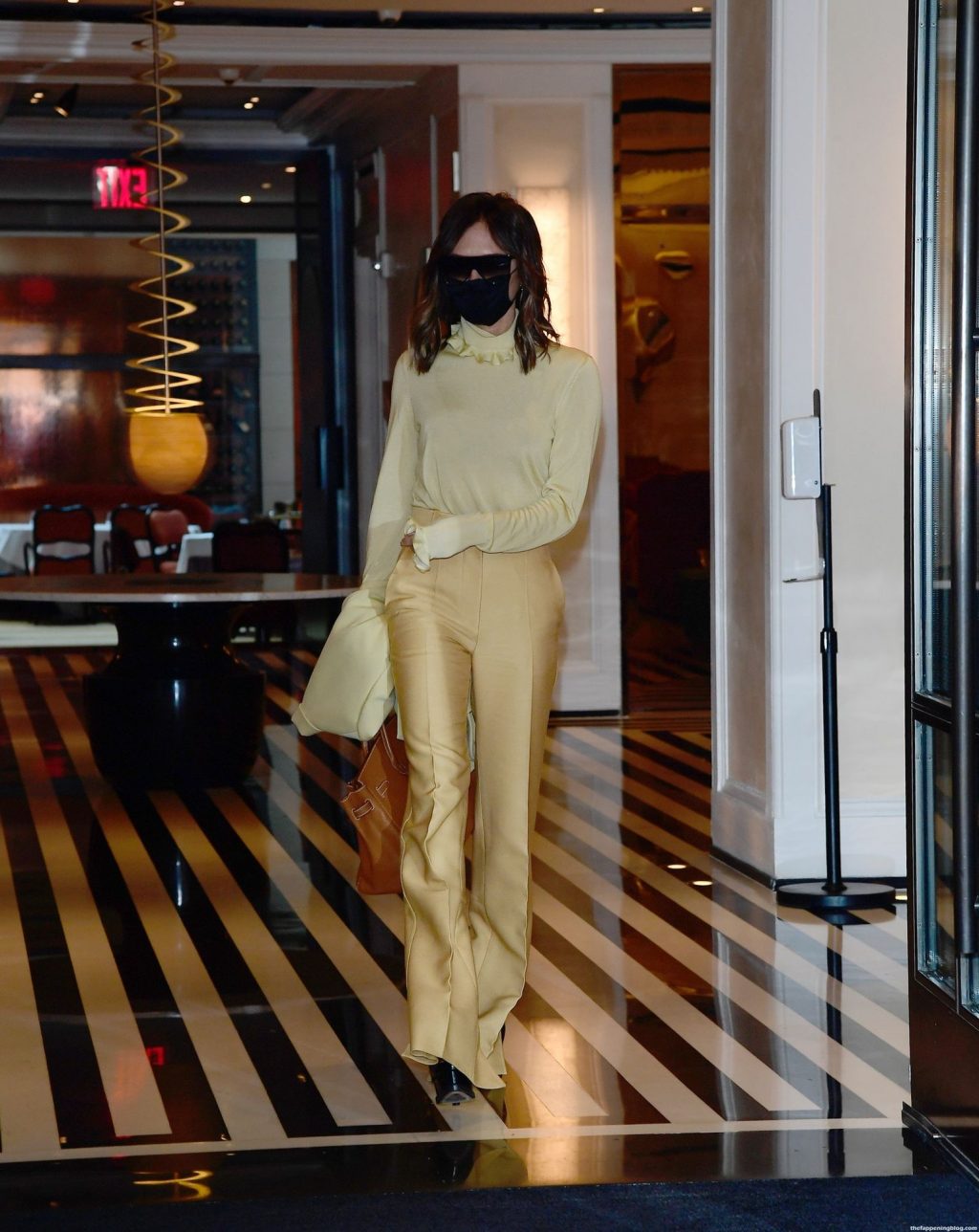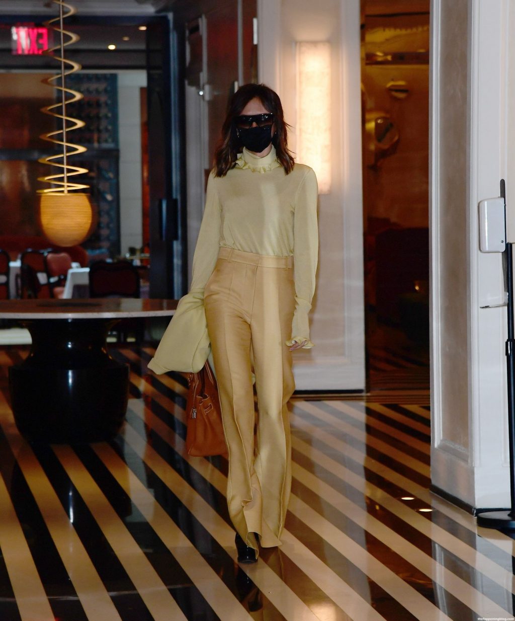 Британская поп-звезда и дизайнер моды была в черной маске для лица, желтой блузке, подходящих расклешенных брюках и туфлях на платформе.