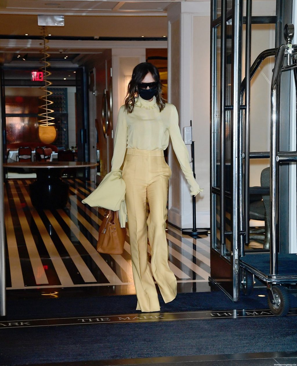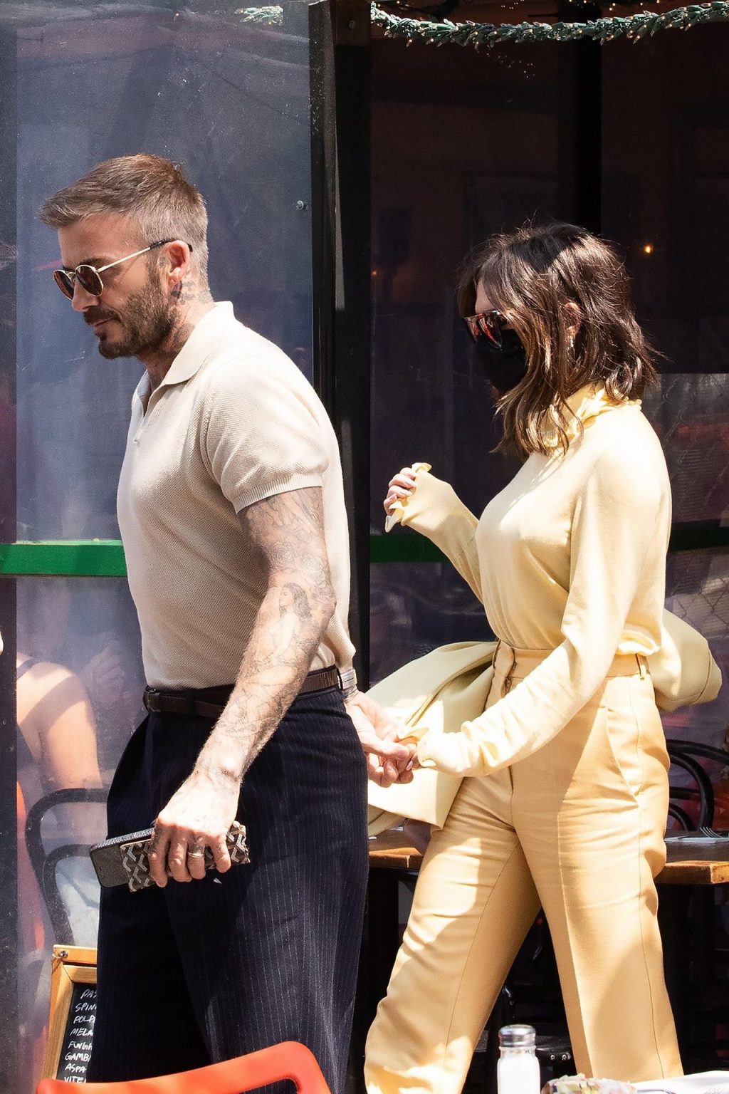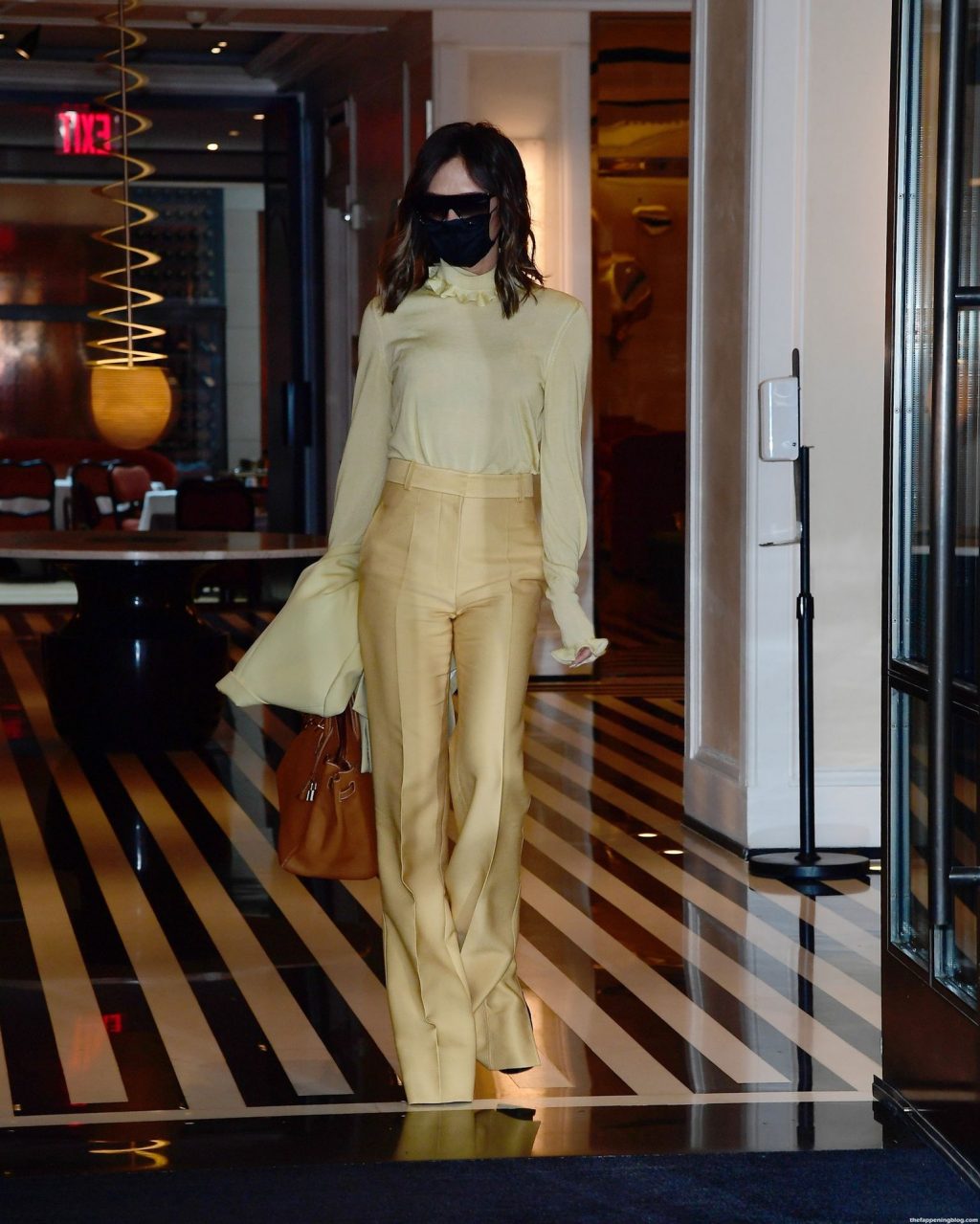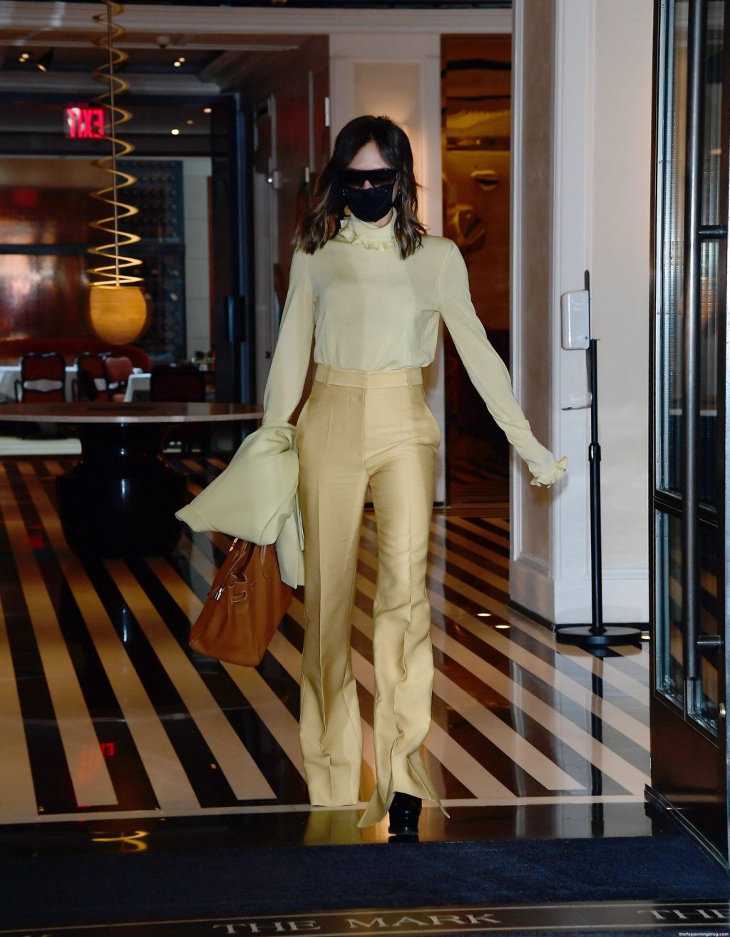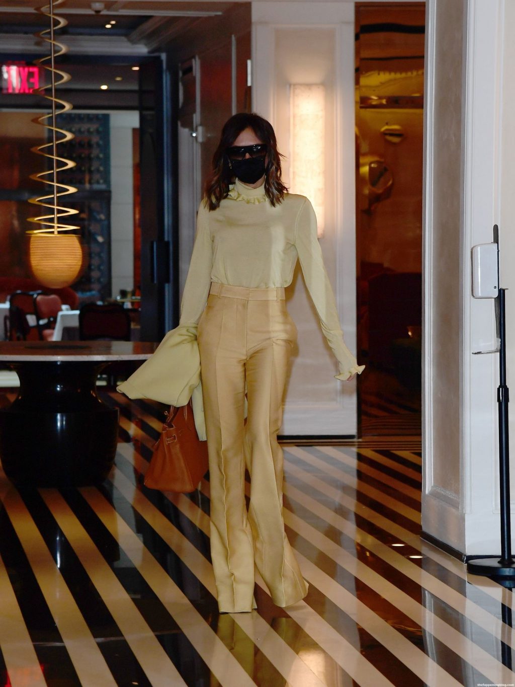 Британская поп-звезда и дизайнер моды была в черной маске для лица, желтой блузке, подходящих расклешенных брюках и туфлях на платформе.