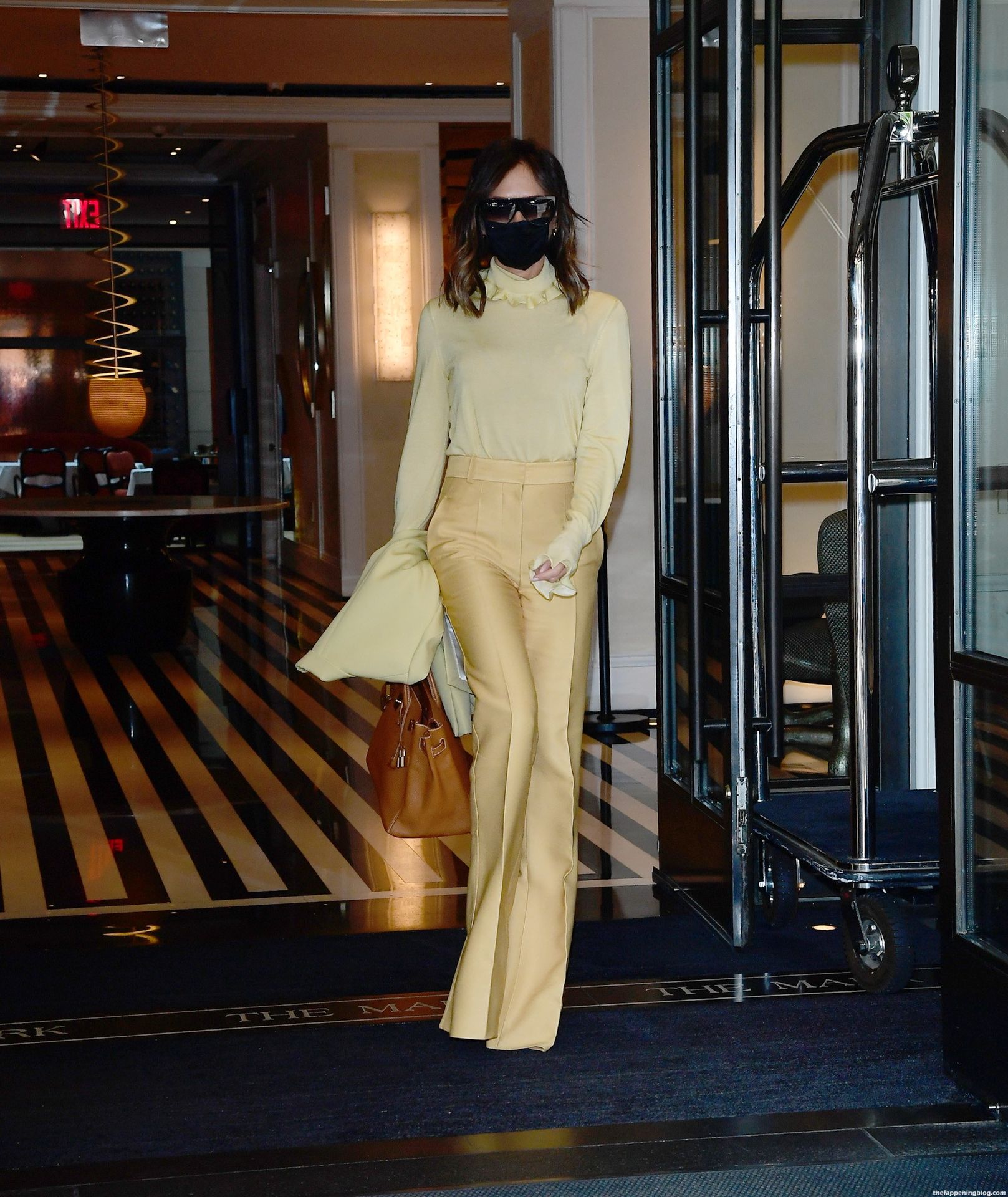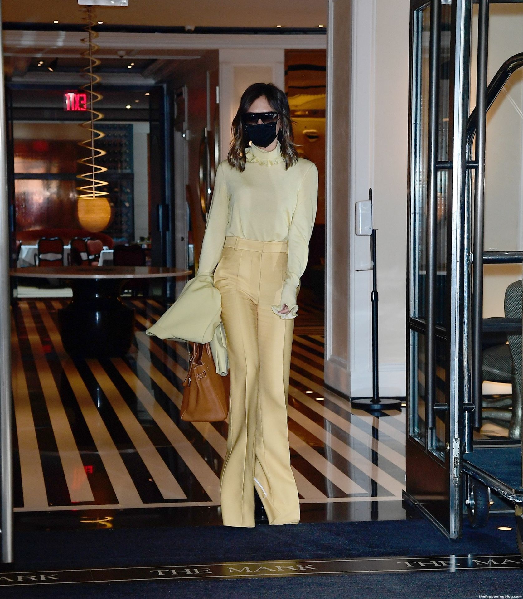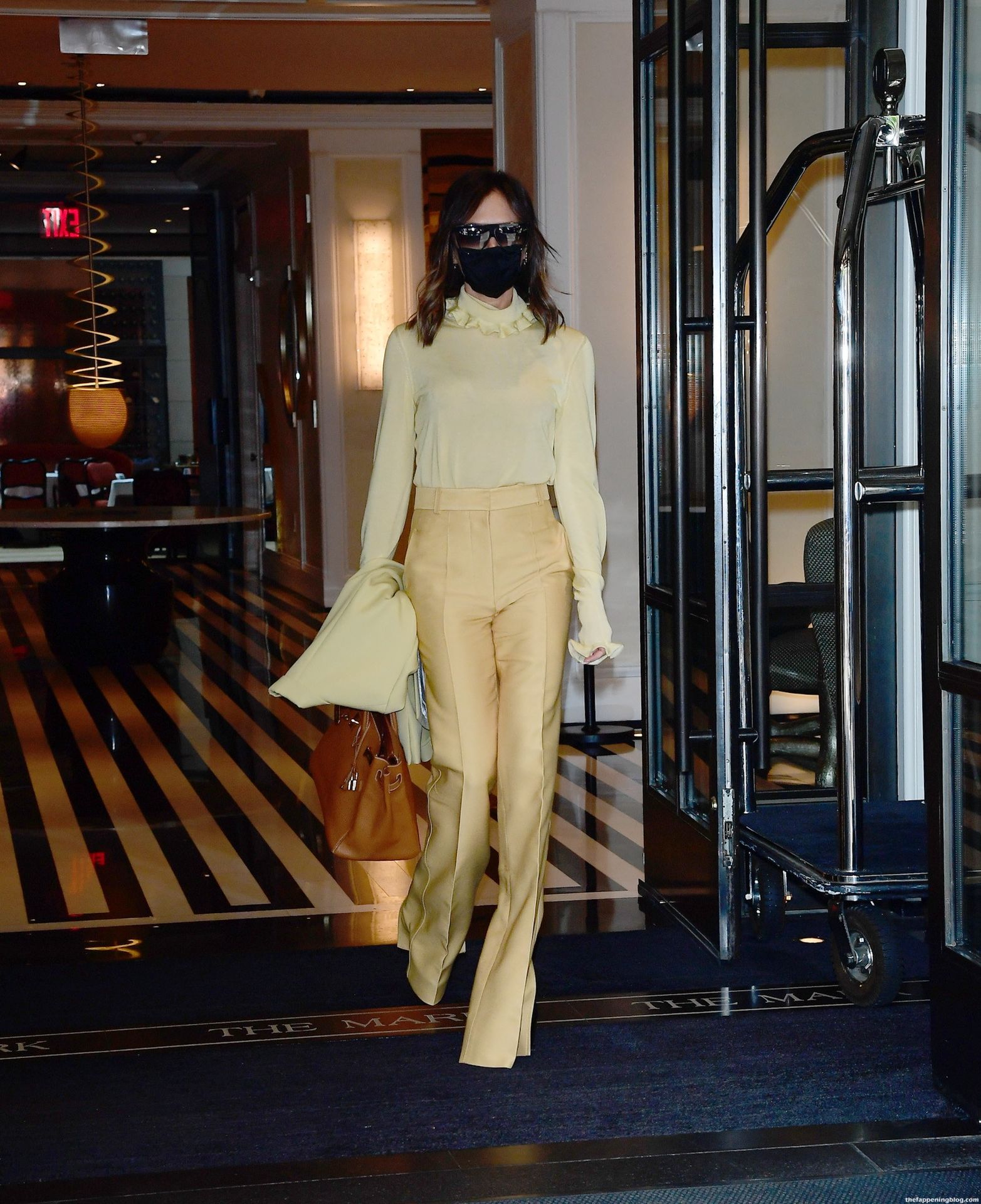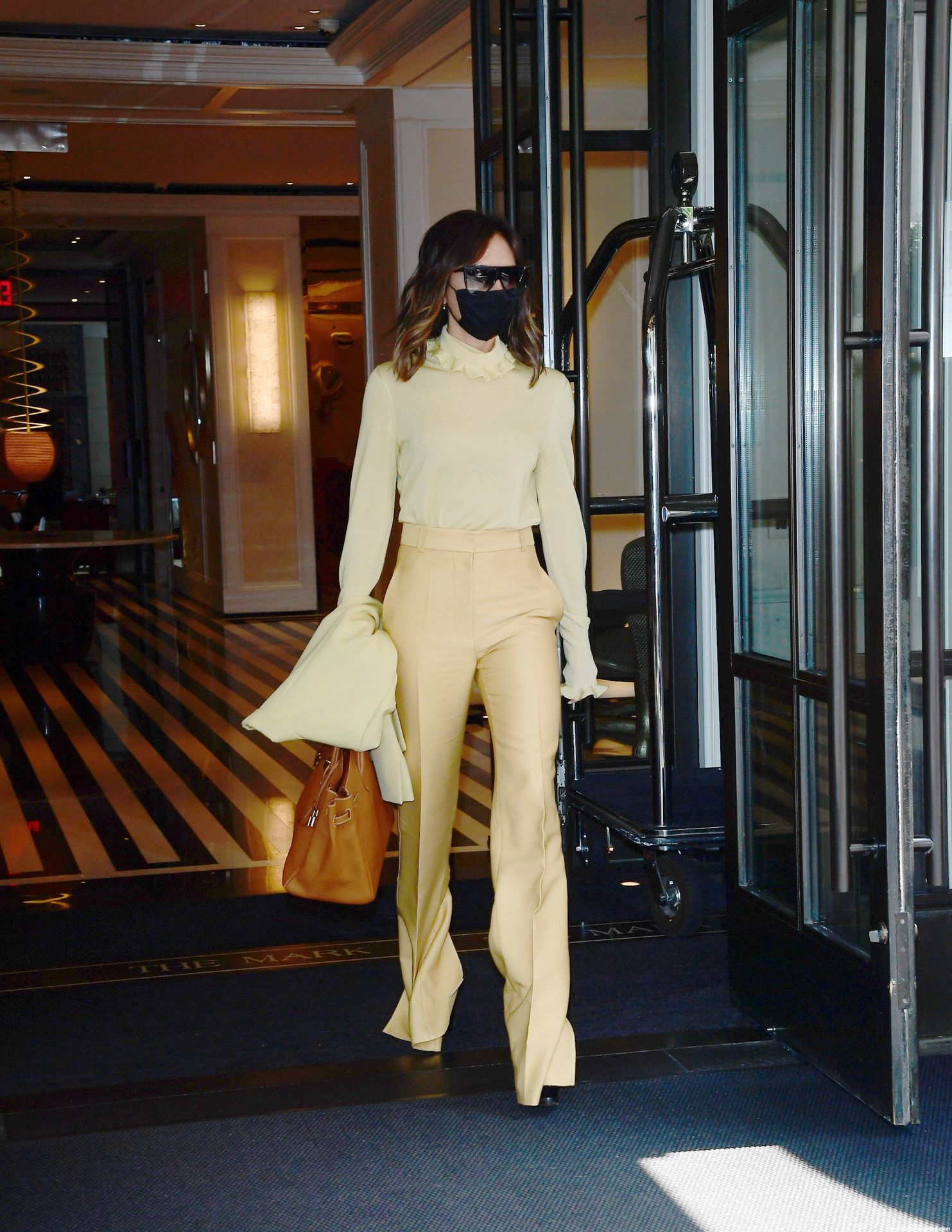 Британская поп-звезда и дизайнер моды была в черной маске для лица, желтой блузке, подходящих расклешенных брюках и туфлях на платформе.