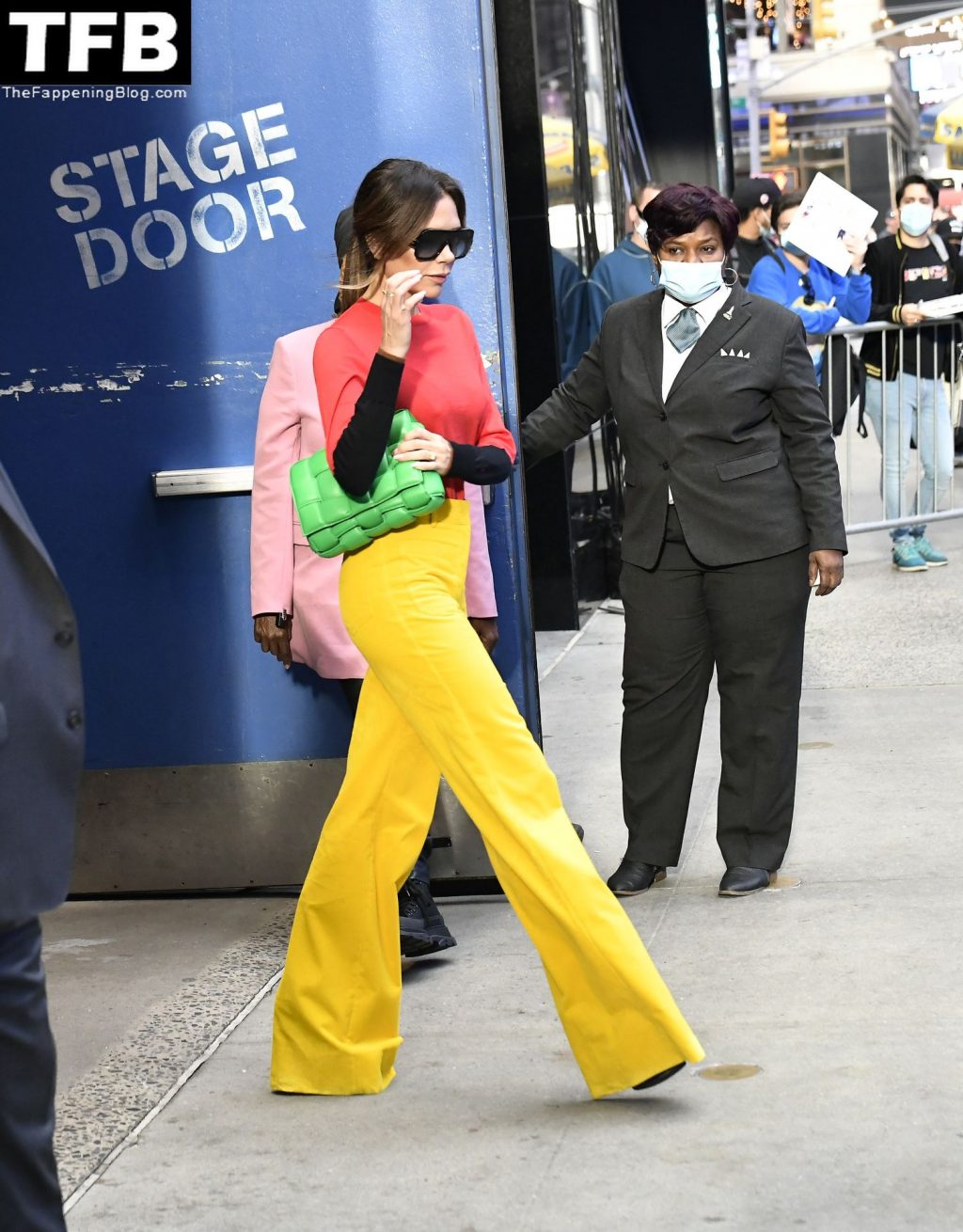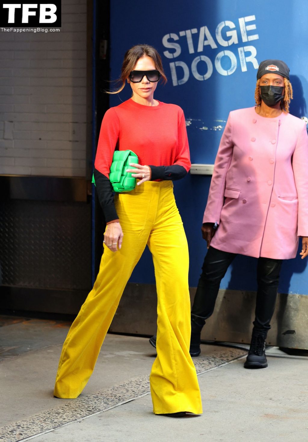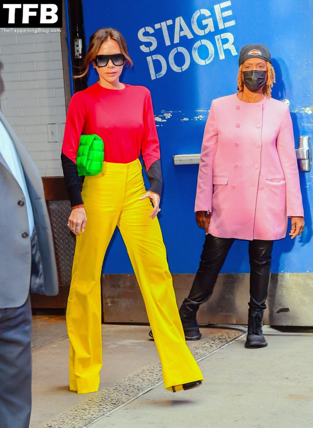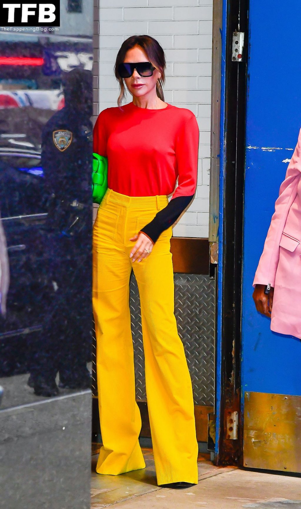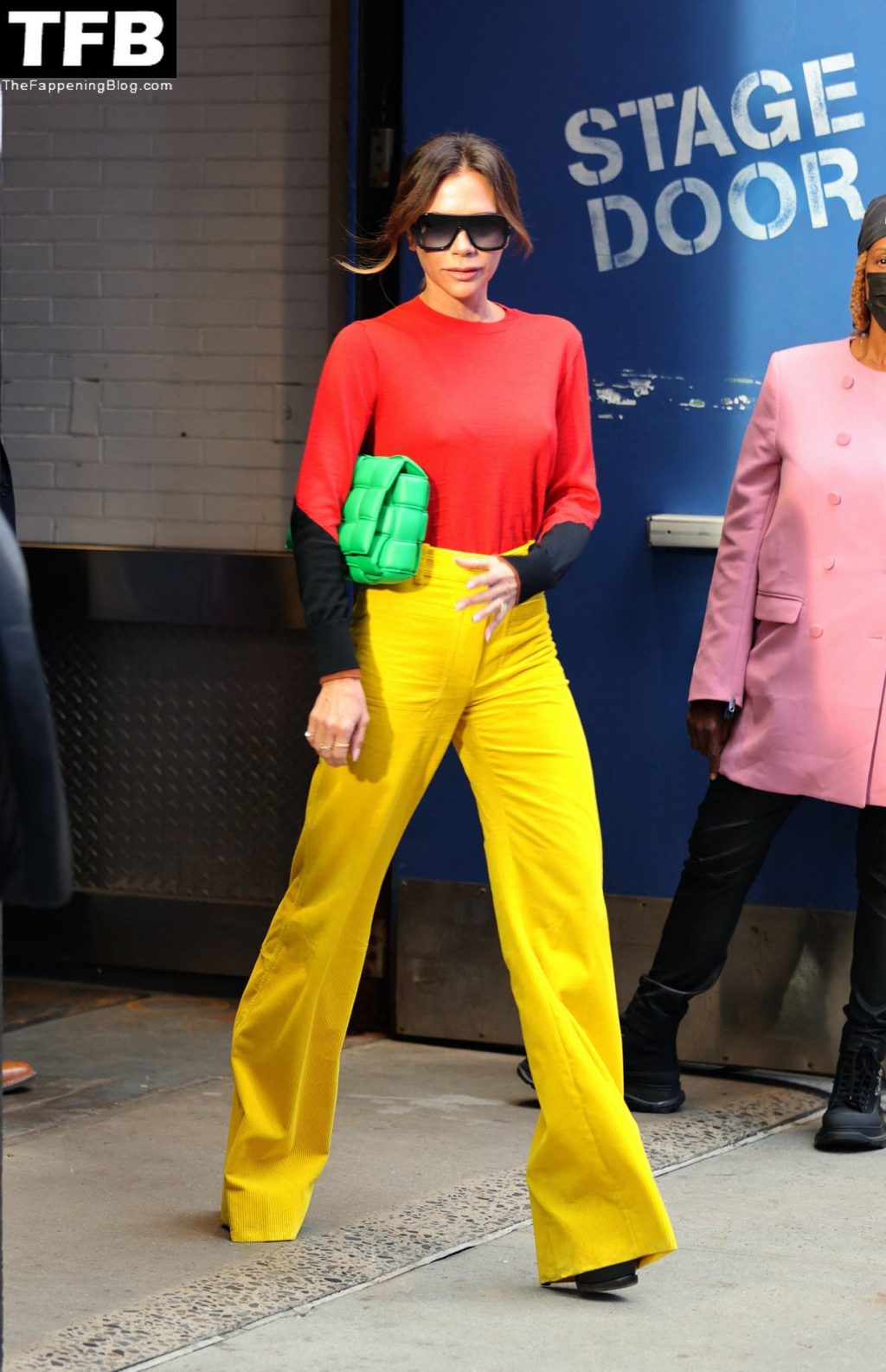 Victoria Beckham запечатлена в очень стильном образе по пути на шоу “Good Morning America”, где она продвигает свою новую линию одежды, обуви, сумок и косметики – Таймс-сквер, Манхэттен, 12.10.2021.